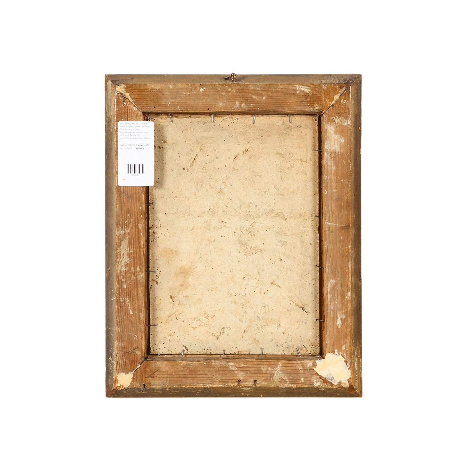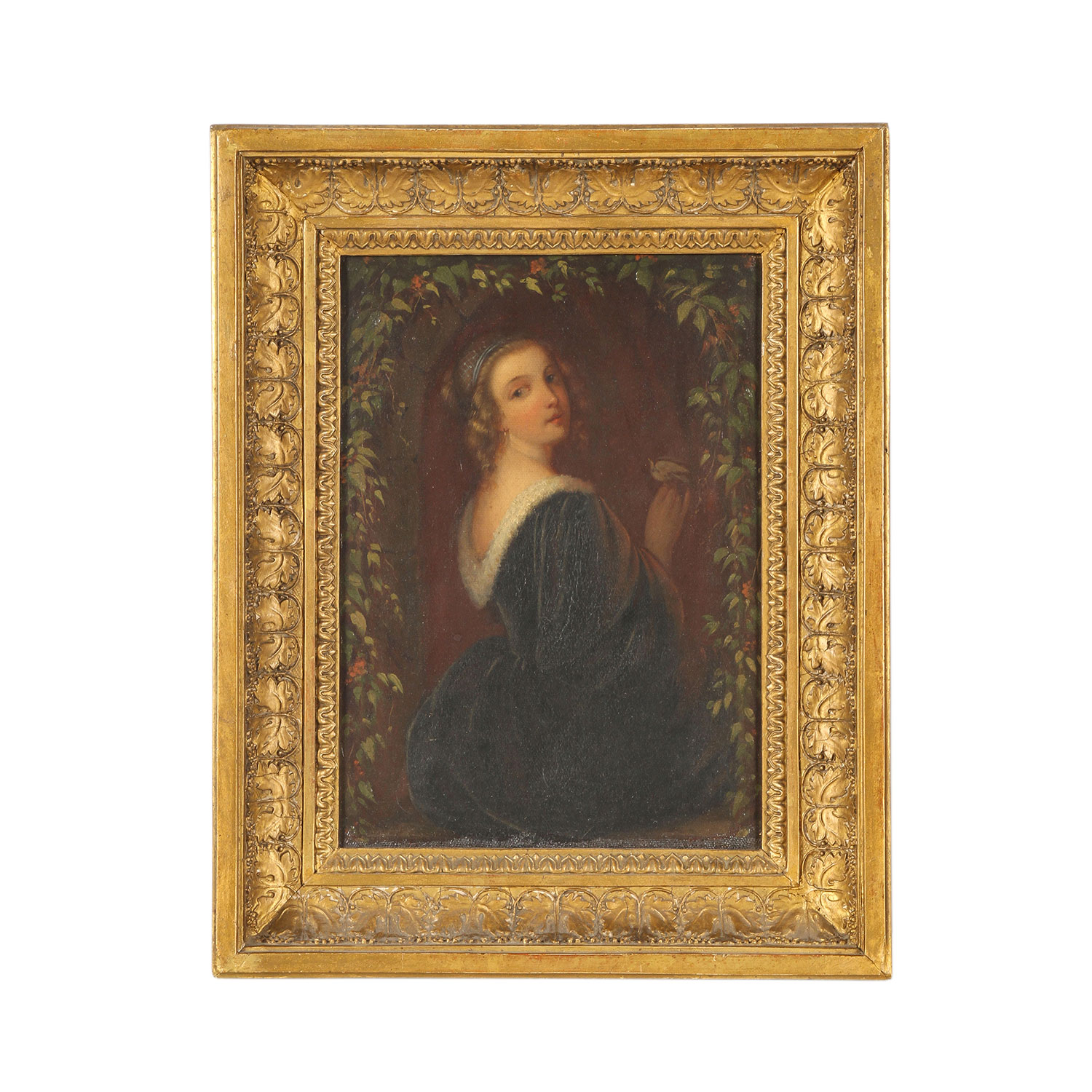 MALER/IN 19. Jh., "Portrait einer jungen Dame", in einer blumenbekränzten Fensternische sitzend und sich zum Betrachter umschauend, auf ihrer Hand einen Vogel haltend, unsign., Öl/Leinwand auf Karton aufgezogen, HxB: 29,5x21,5 cm (40,5x32,5 cm mit Rahmen). Craquelé, min. Löchlein an den Ecken, rest.. Mit Rahmen (part. besch. u. rest.).
