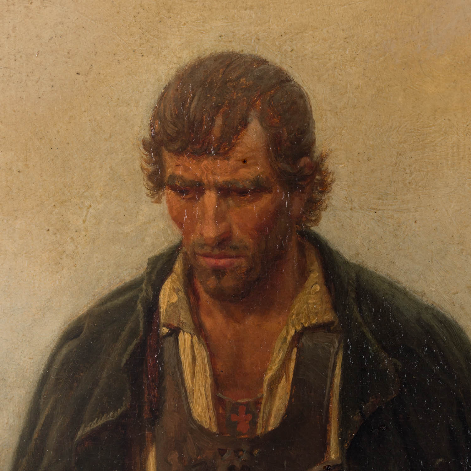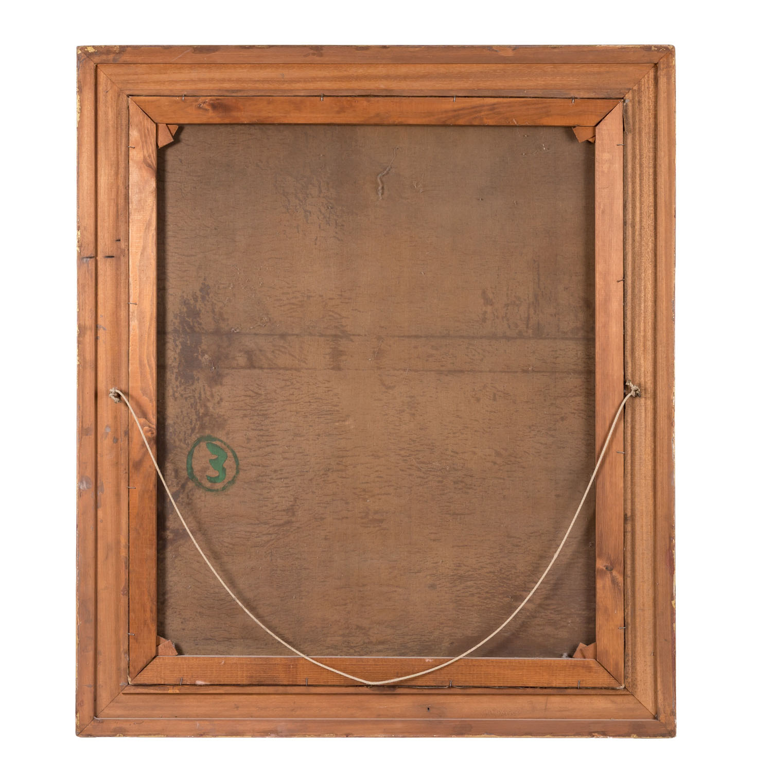 Öl/Leinwand, HxB: ca. 95x80 cm (113x97 cm mit Rahmen). Craquelé, alt restauriert und retuschiert, rechtsseitig markante Farbabplatzer (restaurierungsbedürftig). Mit Rahmen. VERSO Sammlungsnr. 3 im Kreis.