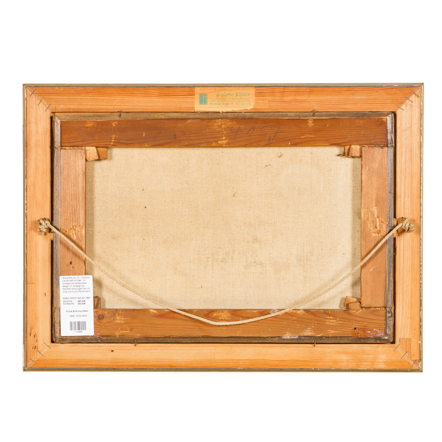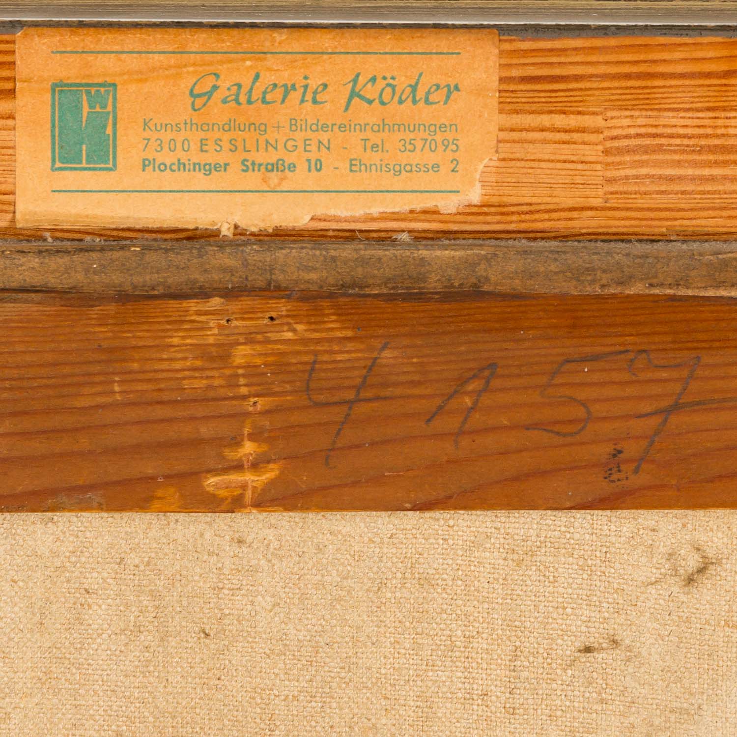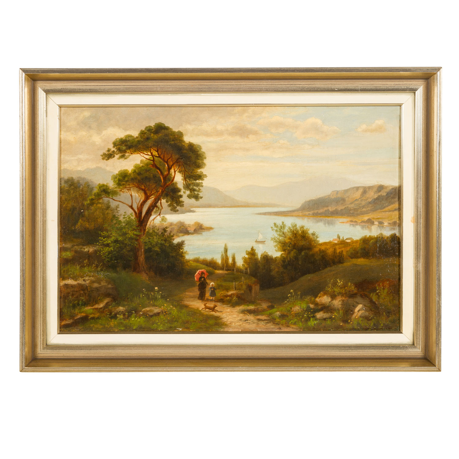 im Hintergrund verblauende Berge, im Vordergrund flanieren eine junge Frau mit Kind und Hund, Öl/Leinwand doubliert, HxB: ca. 30x45 cm (39x54 cm mit Rahmen). Restauriert, leichtes Craquelé. Mit Rahmen. VERSO Etikett Galerie Köder, Esslingen.