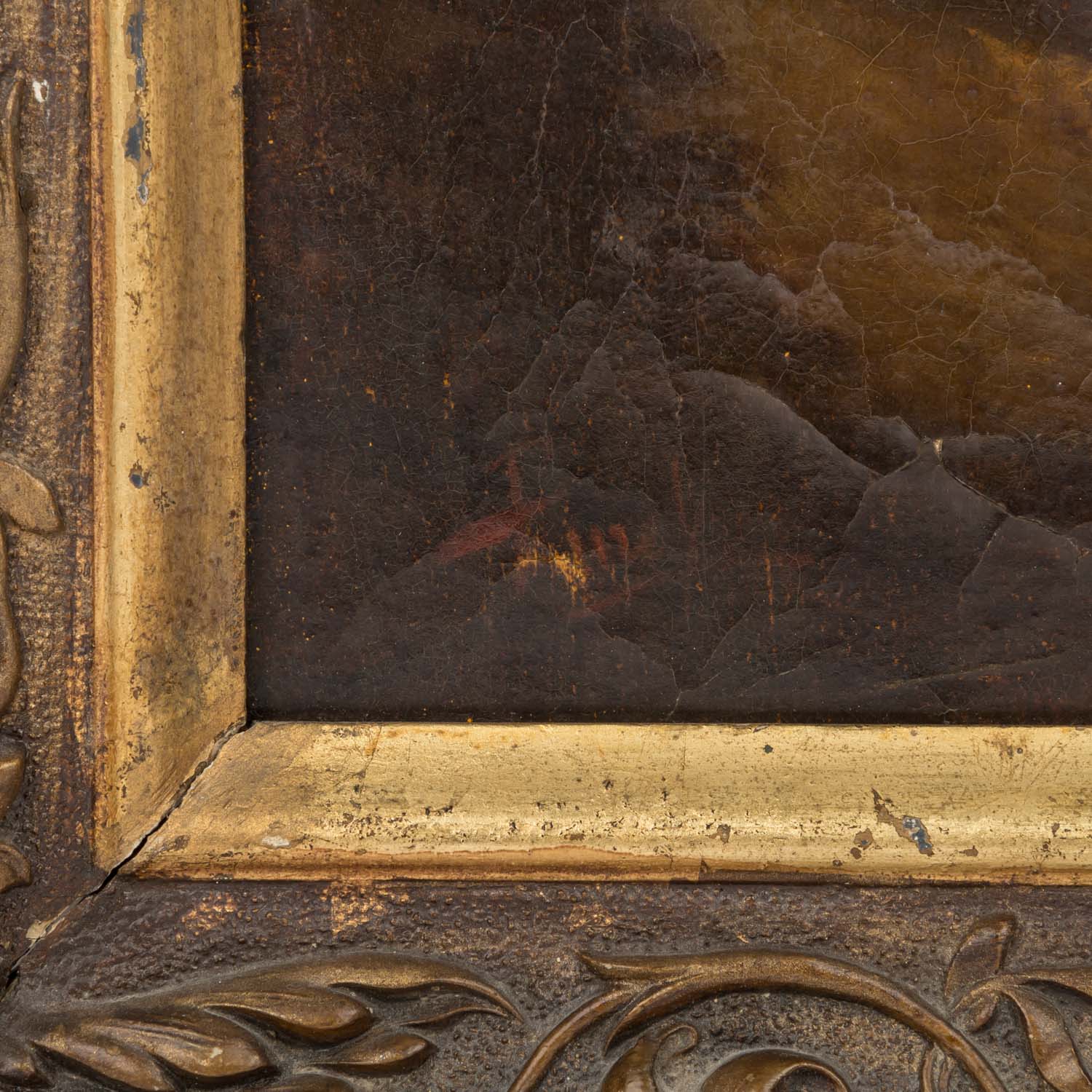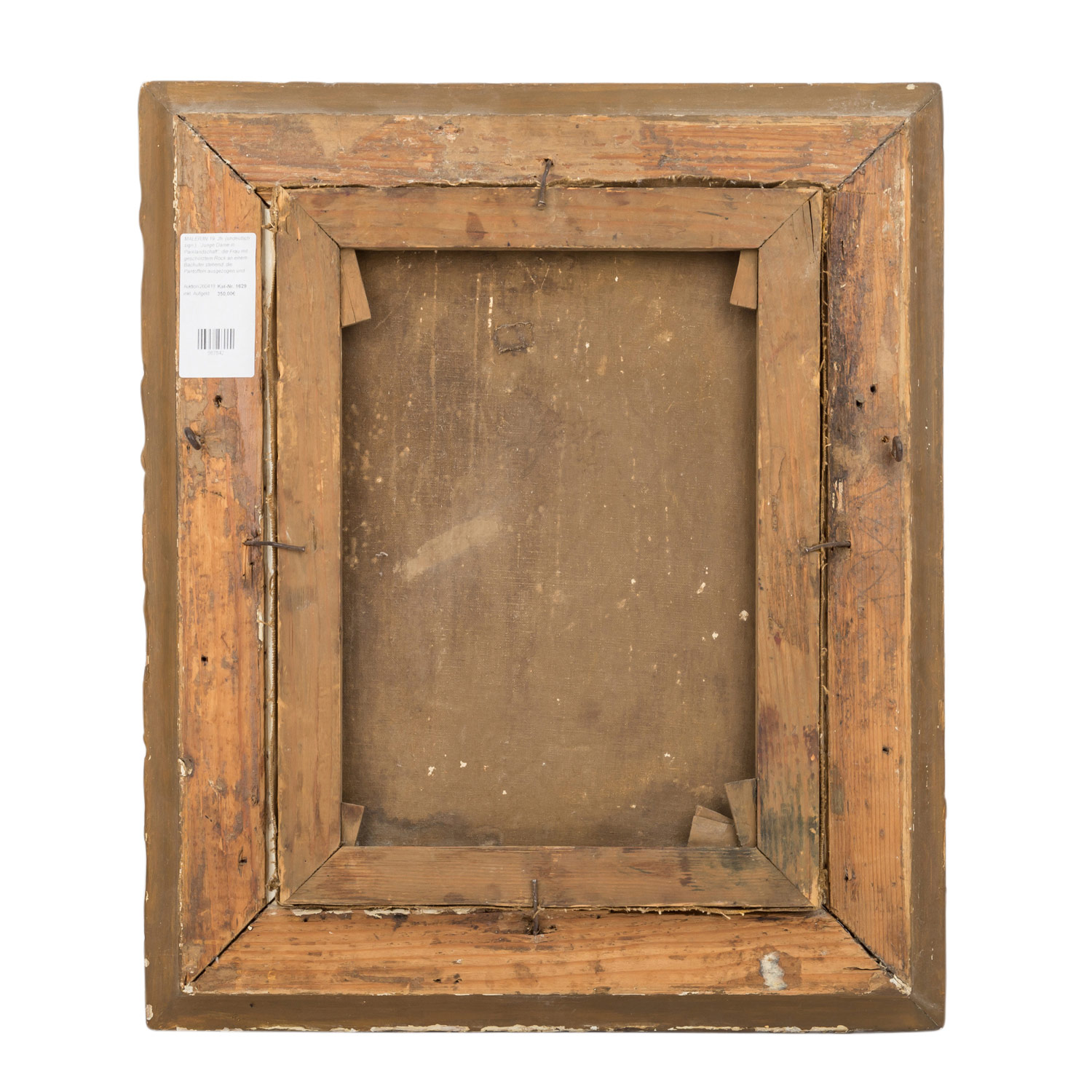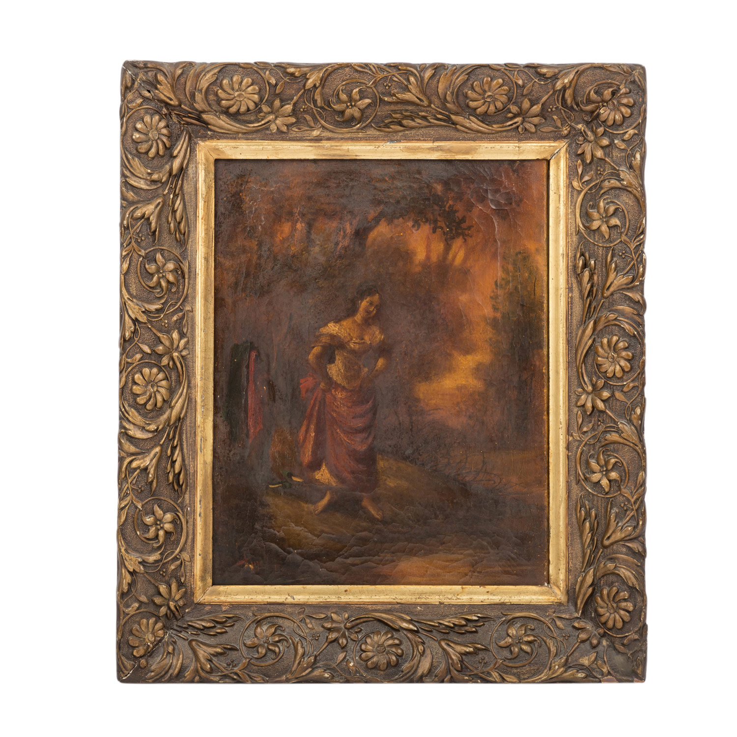 MALER/IN 19. Jh. (undeutlich sign.), "Junge Dame in Parklandschaft", die Frau mit geschürztem Rock an einem Bachufer stehend, die Pantoffeln ausgezogen und ein Tuch zum Bade neben ihr hängend, u.li. Restsignatur, Öl/Leinwand, HxB: ca. 40x30,5 cm (54x46 cm mit Rahmen). Craquelé, Farbabplatzer u. -berieb, min. rest. mit rückseitigem Leinwanddoublierflicken, restaurierungsbedürftig. Mit Rahmen (part. besch.).