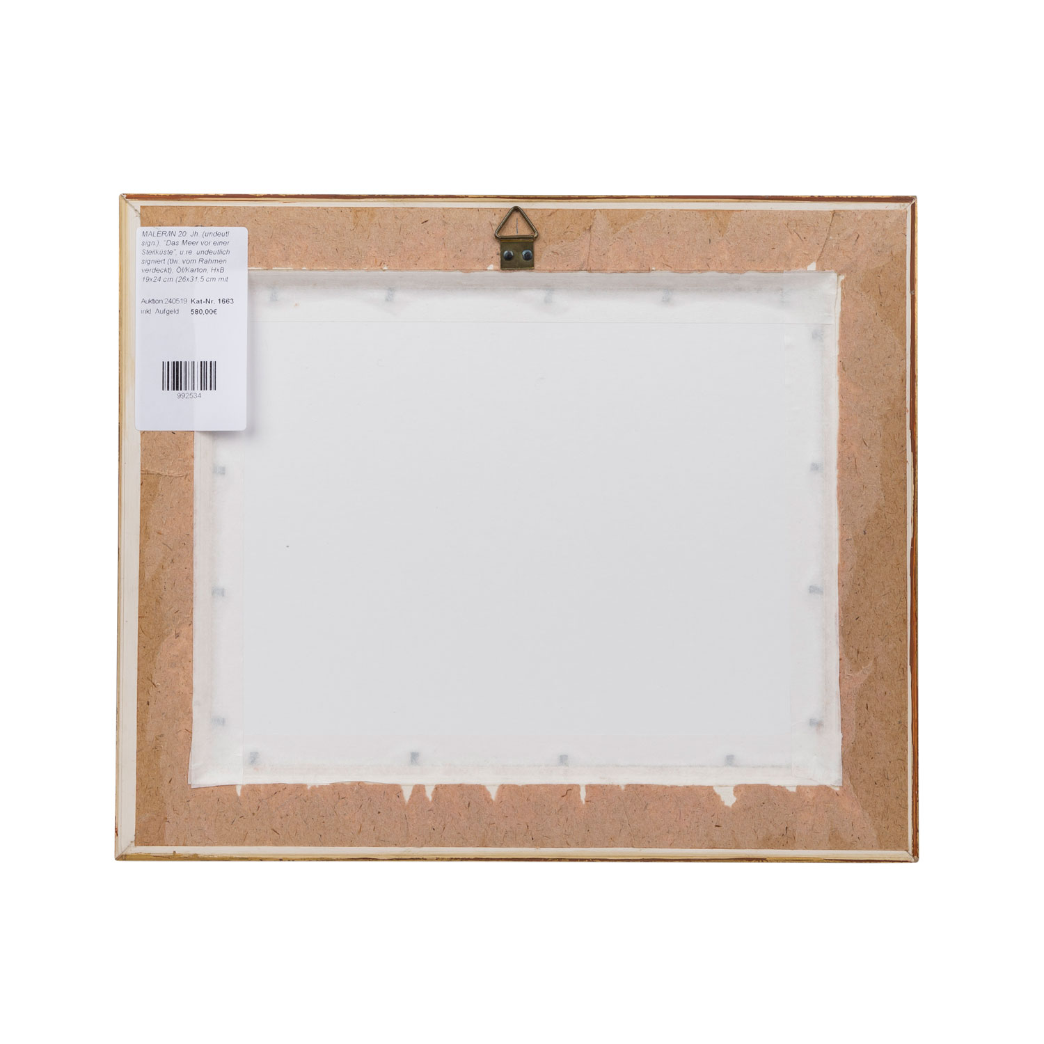 MALER/IN 20. Jh. (undeutl. sign.), ""Das Meer vor einer Steilküste"", u.re. undeutlich signiert (tlw. vom Rahmen verdeckt), Öl/Karton, HxB: 19x24 cm (26x31,5 cm mit Rahmen). Retuschen. Mit Rahmen. Altersspuren.