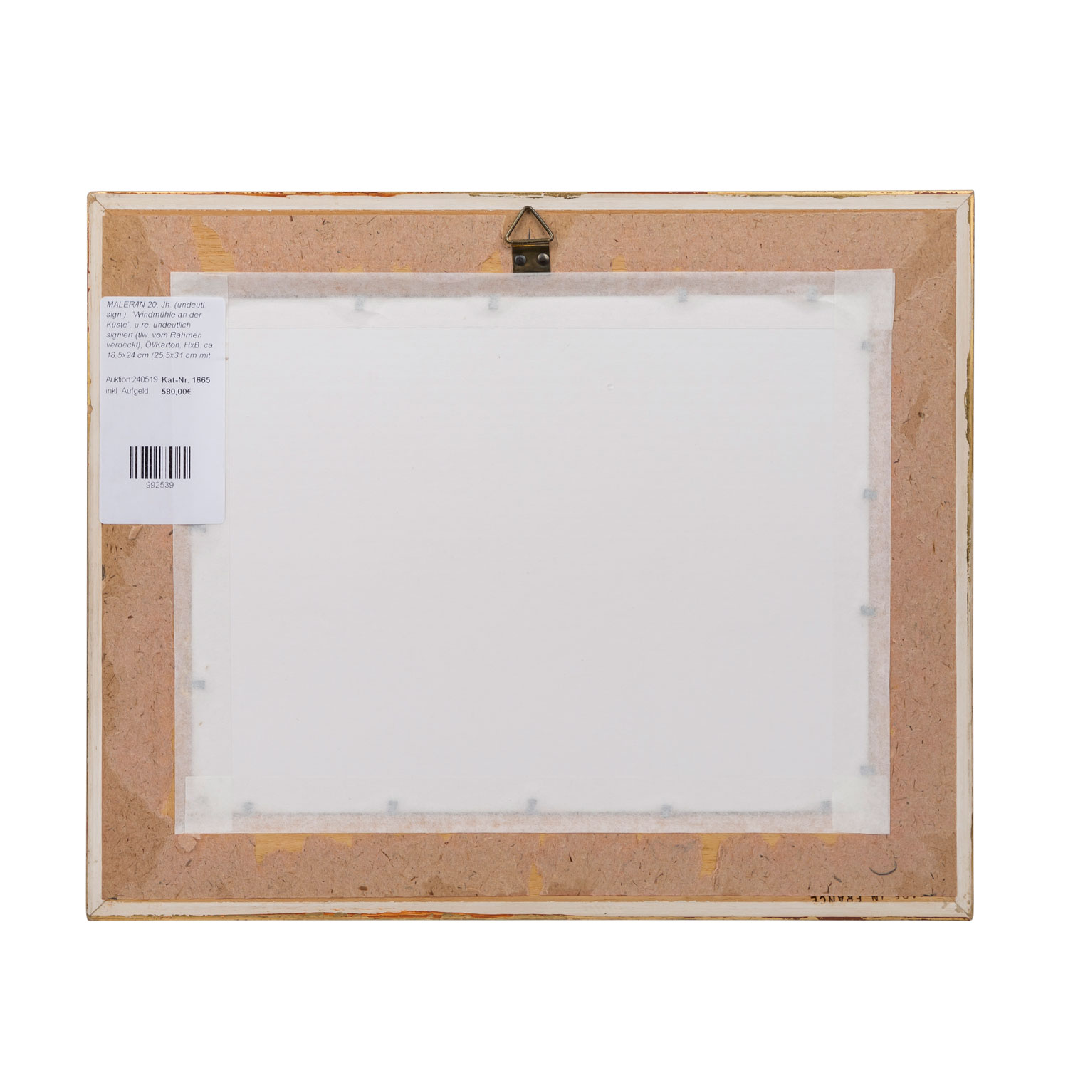 MALER/IN 20. Jh. (undeutl. sign.), ""Windmühle an der Küste"", u.re. undeutlich signiert (tlw. vom Rahmen verdeckt), Öl/Karton, HxB: ca. 18,5x24 cm (25,5x31 cm mit Rahmen). Min. Berieb am Rand. Mit Rahmen. Altersspuren.