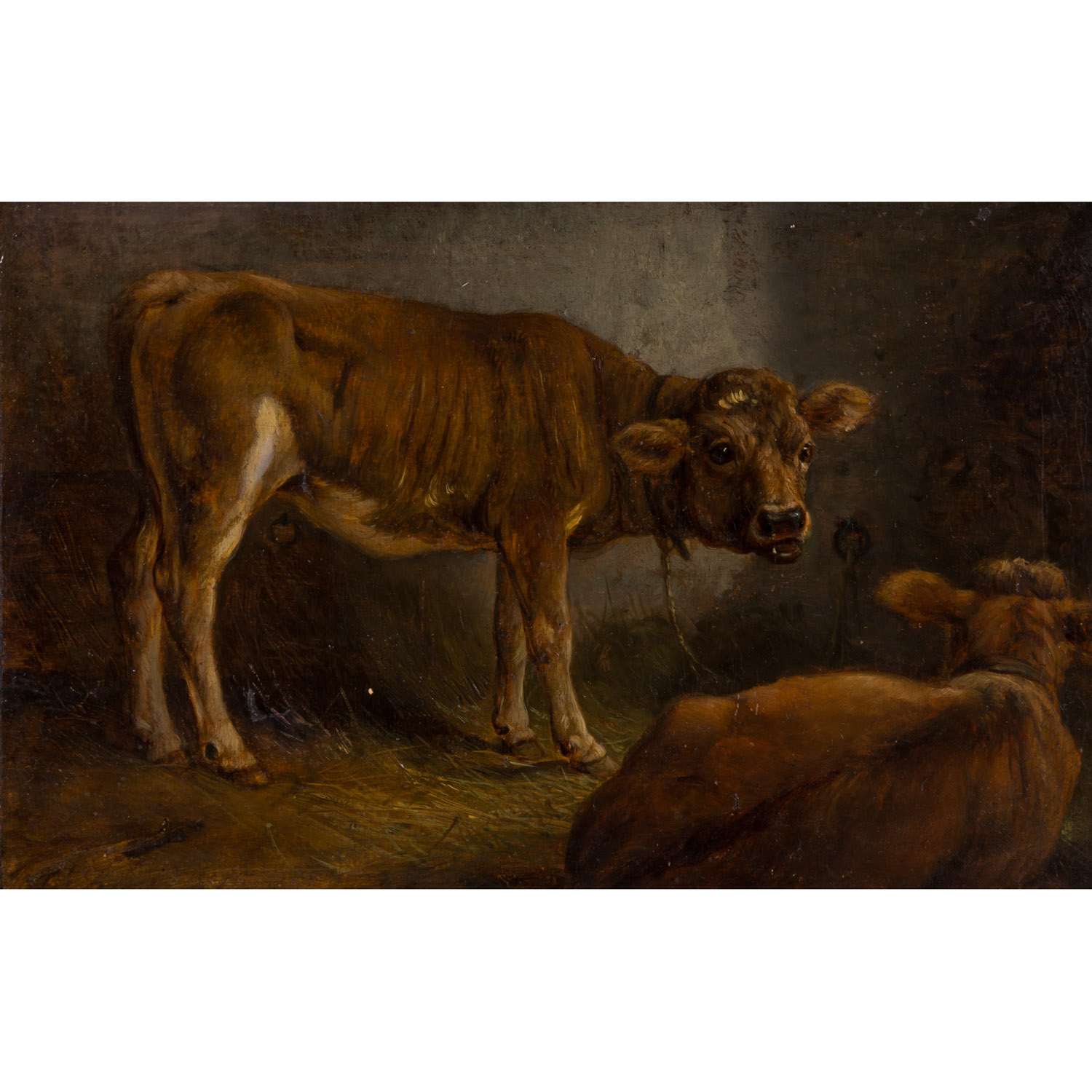 2.) 'Kälber', 1815 (?), Unleserlich signiert und datiert. Öl auf Leinwand, doubliert. HxB: ca. 22,5 x 33 cm (HxB Rahmen: ca. 35 x 42 cm). Alters- und Beriebsspuren, Craquelébildung, kleine Risse, Farbabplatzer. Mit Rahmen (Altersspuren).