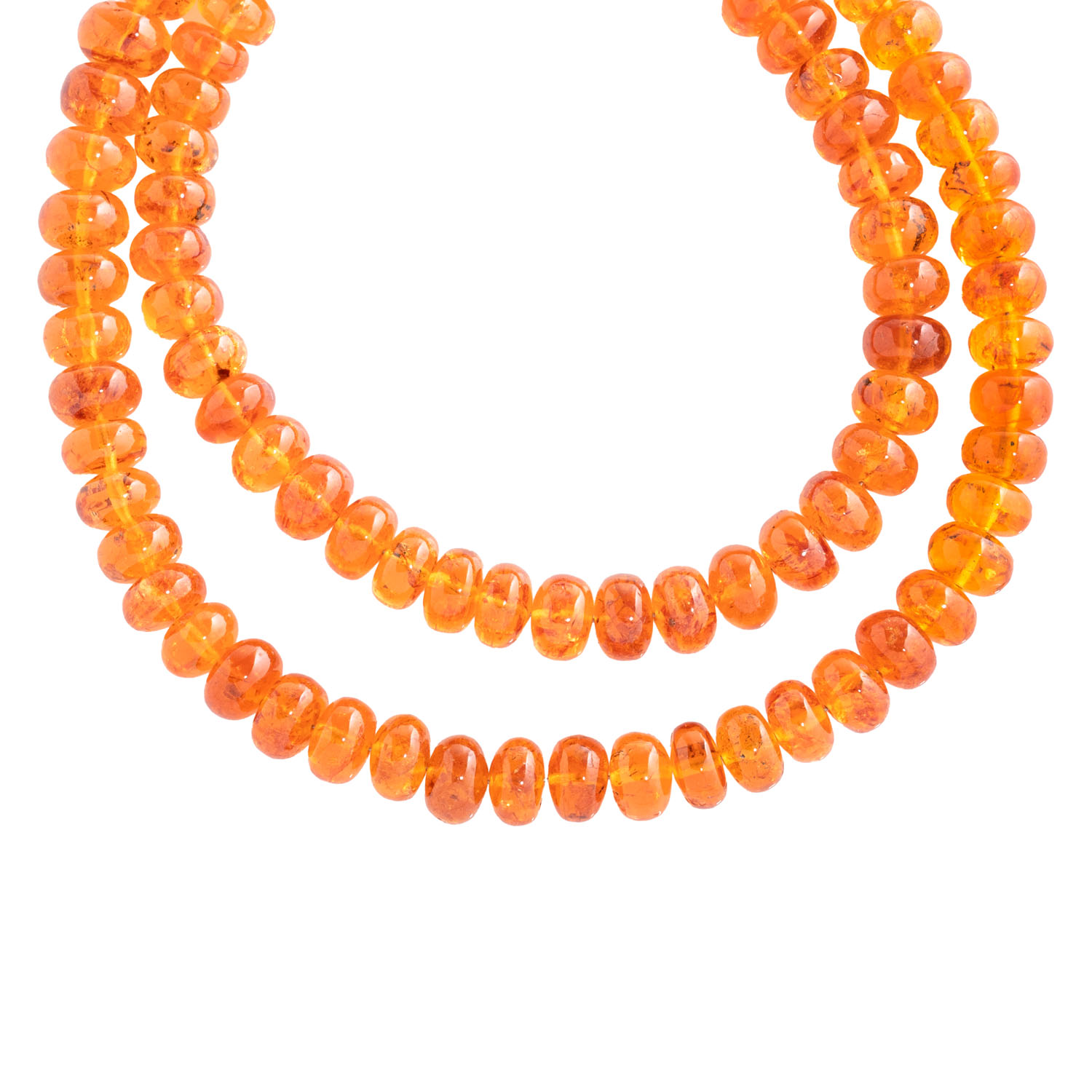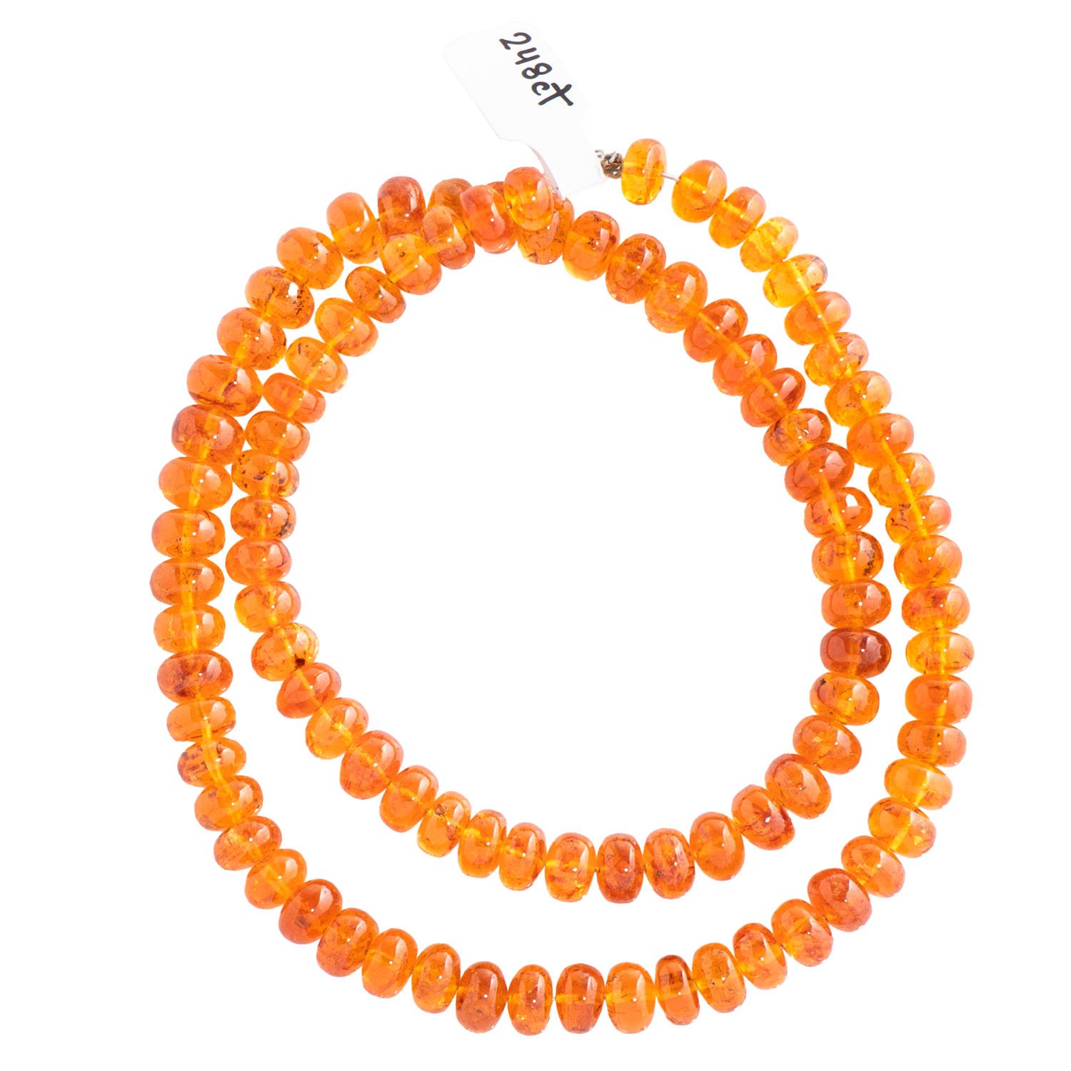 aus 93 flachen Mandaringranatperlen, zus. ca. 248 ct (inkl. Schnur), D: ca. 6,5 bis 7,5 mm, L: ca: 42 cm, gefädelte Linie ohne Verschluss, 21. Jh., neuwertiger Zustand. Mandaringranate von schöner Farbe, unterschiedliche Ausformungen.