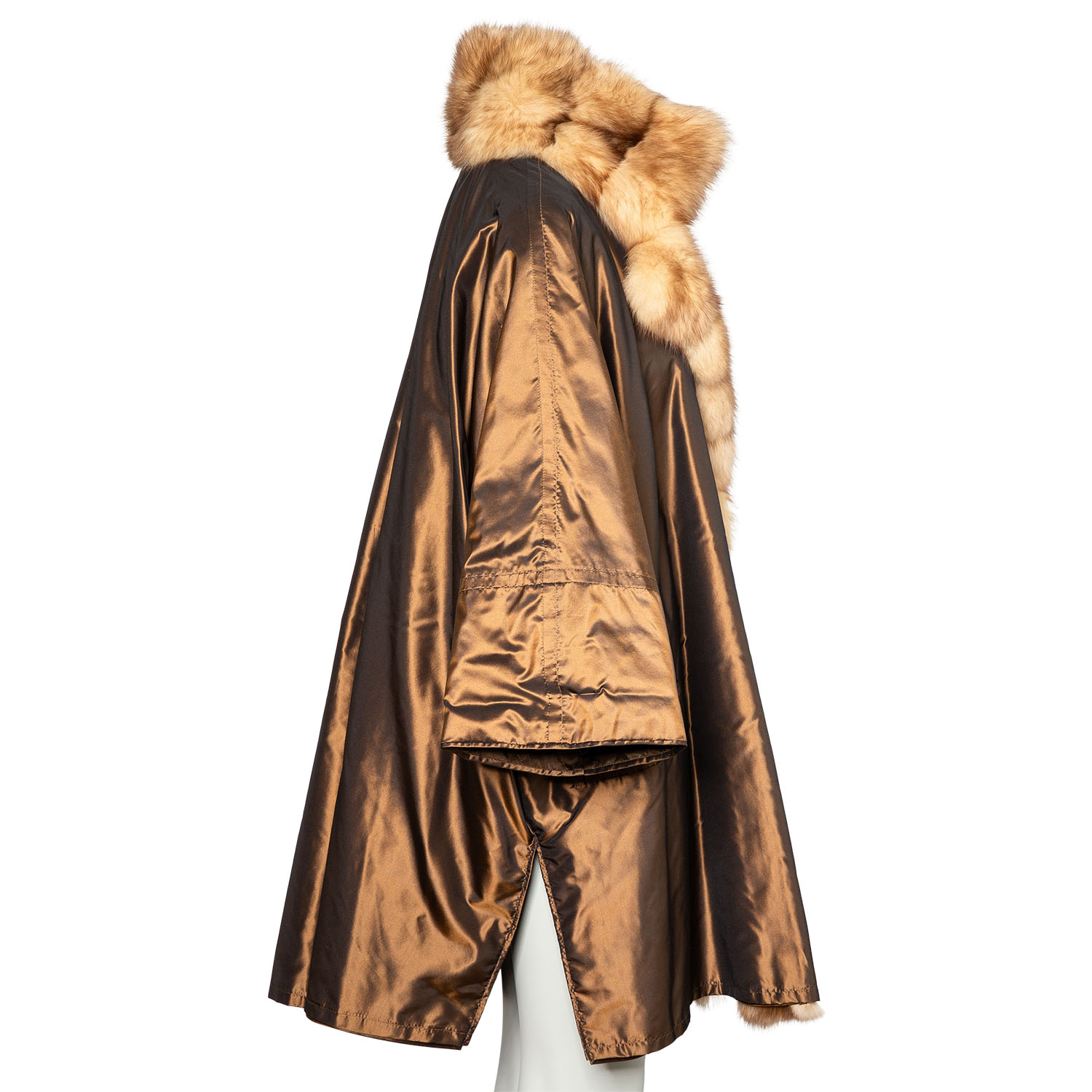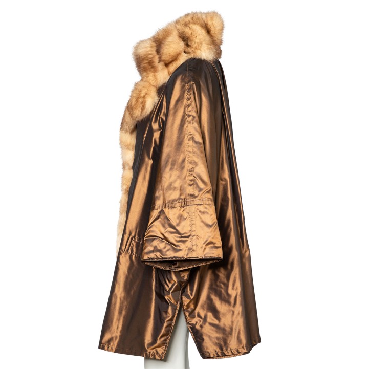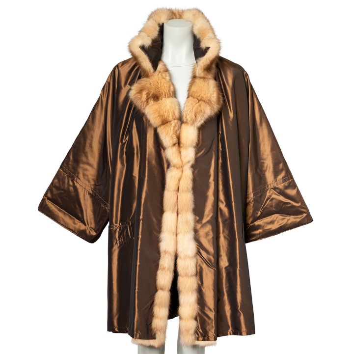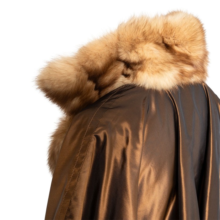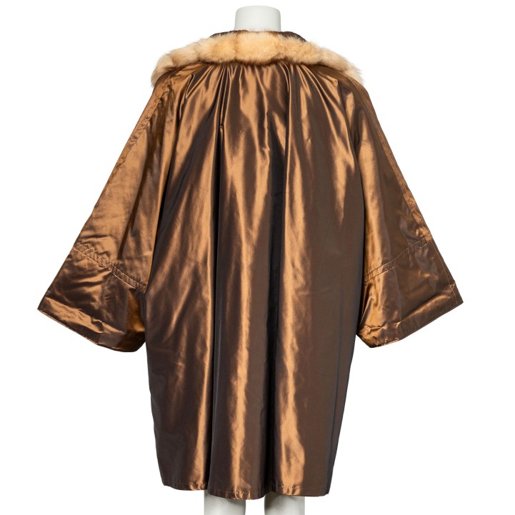 Bronzefarbener Mantel mit Pelzverbrämung in Hellbraun. Guter Erhalt.