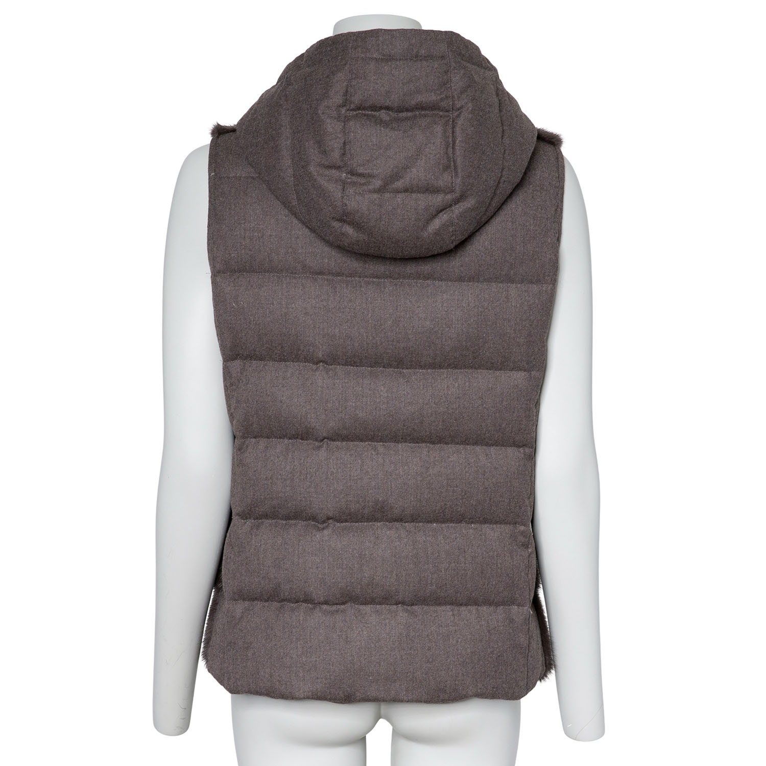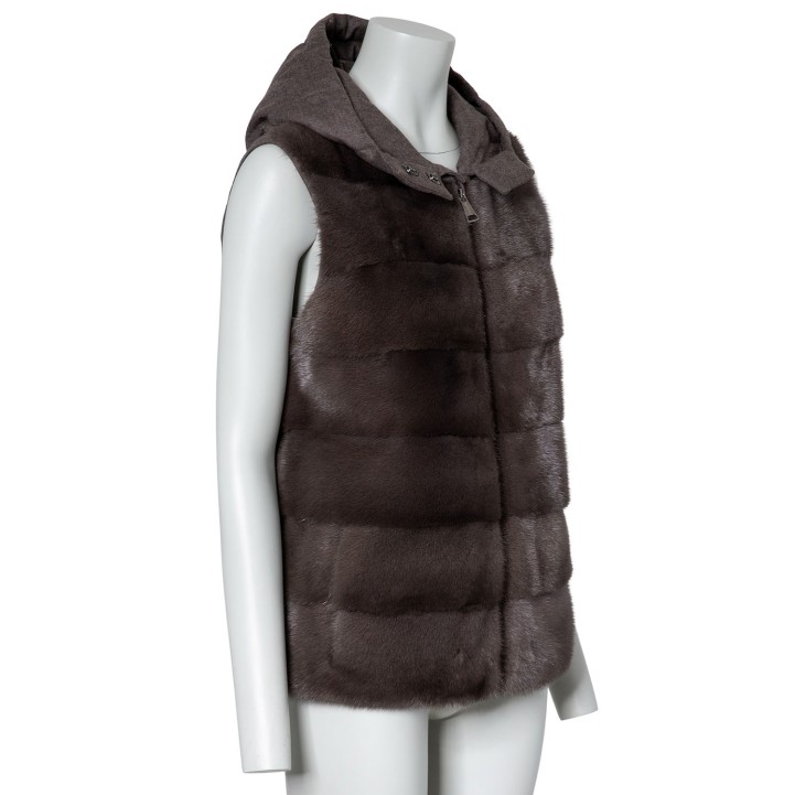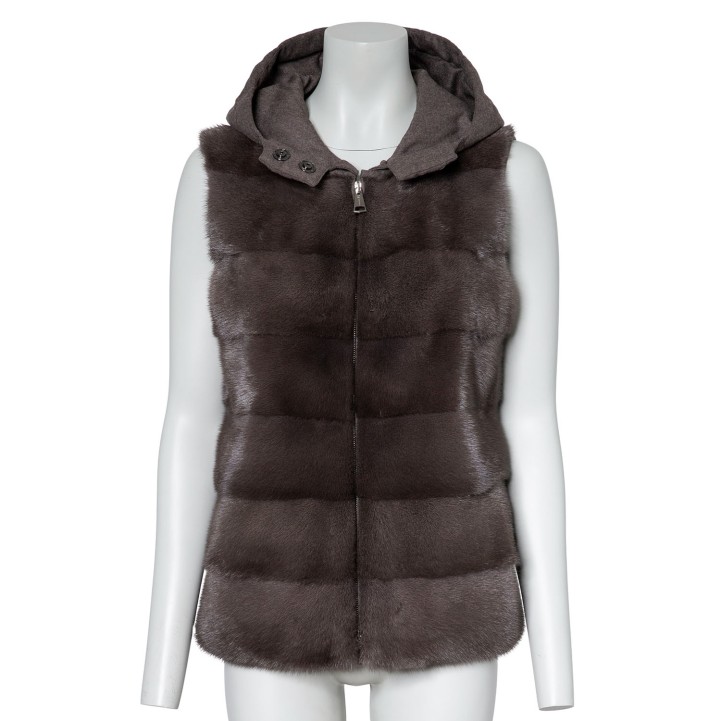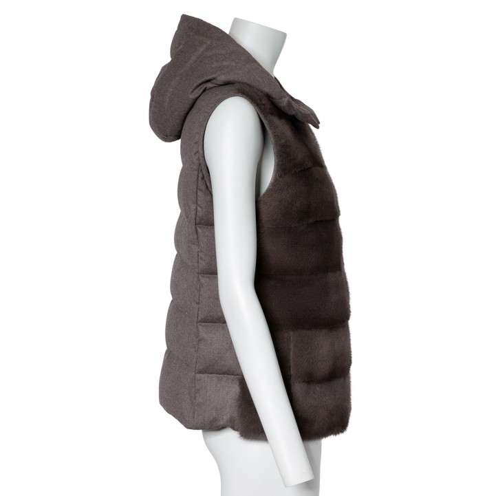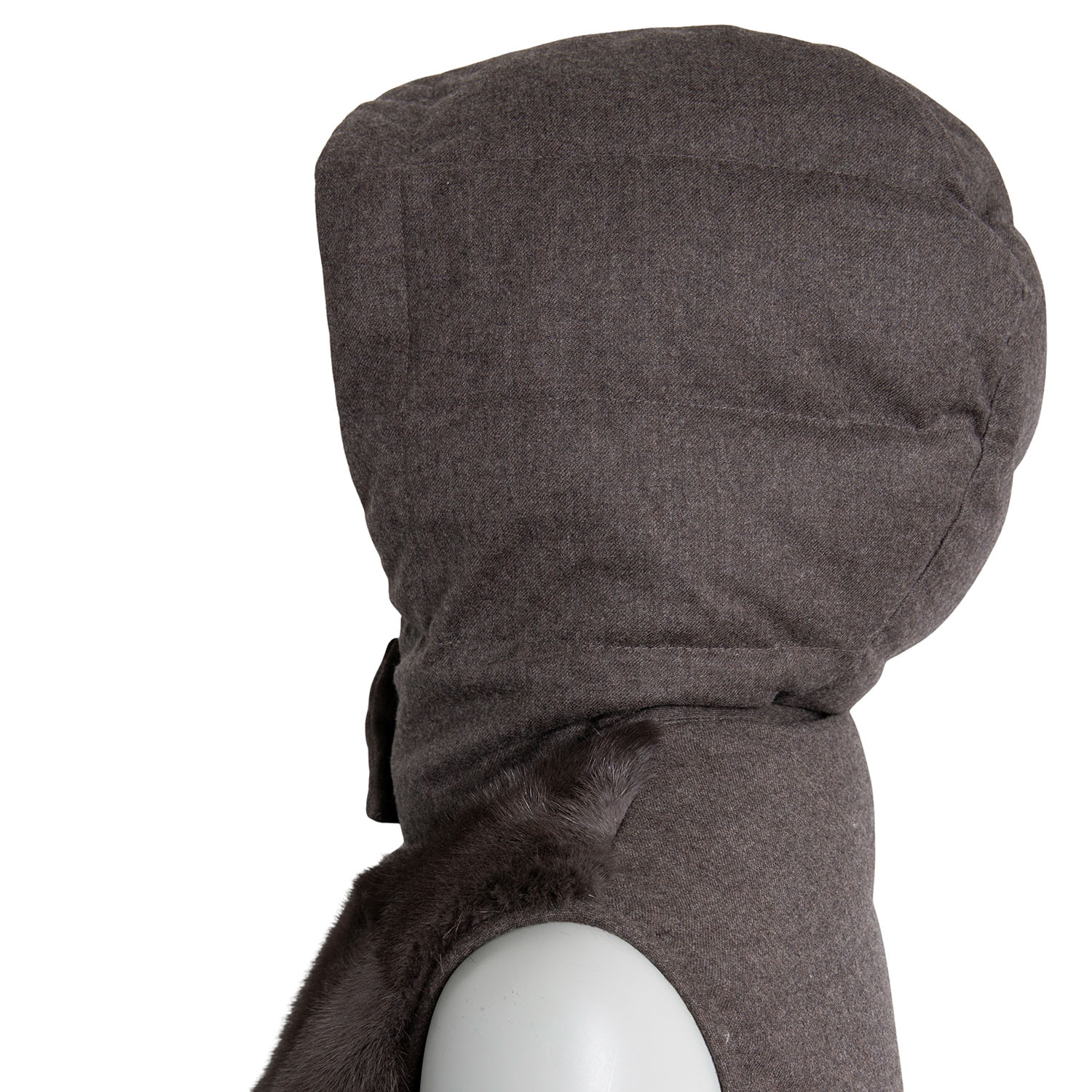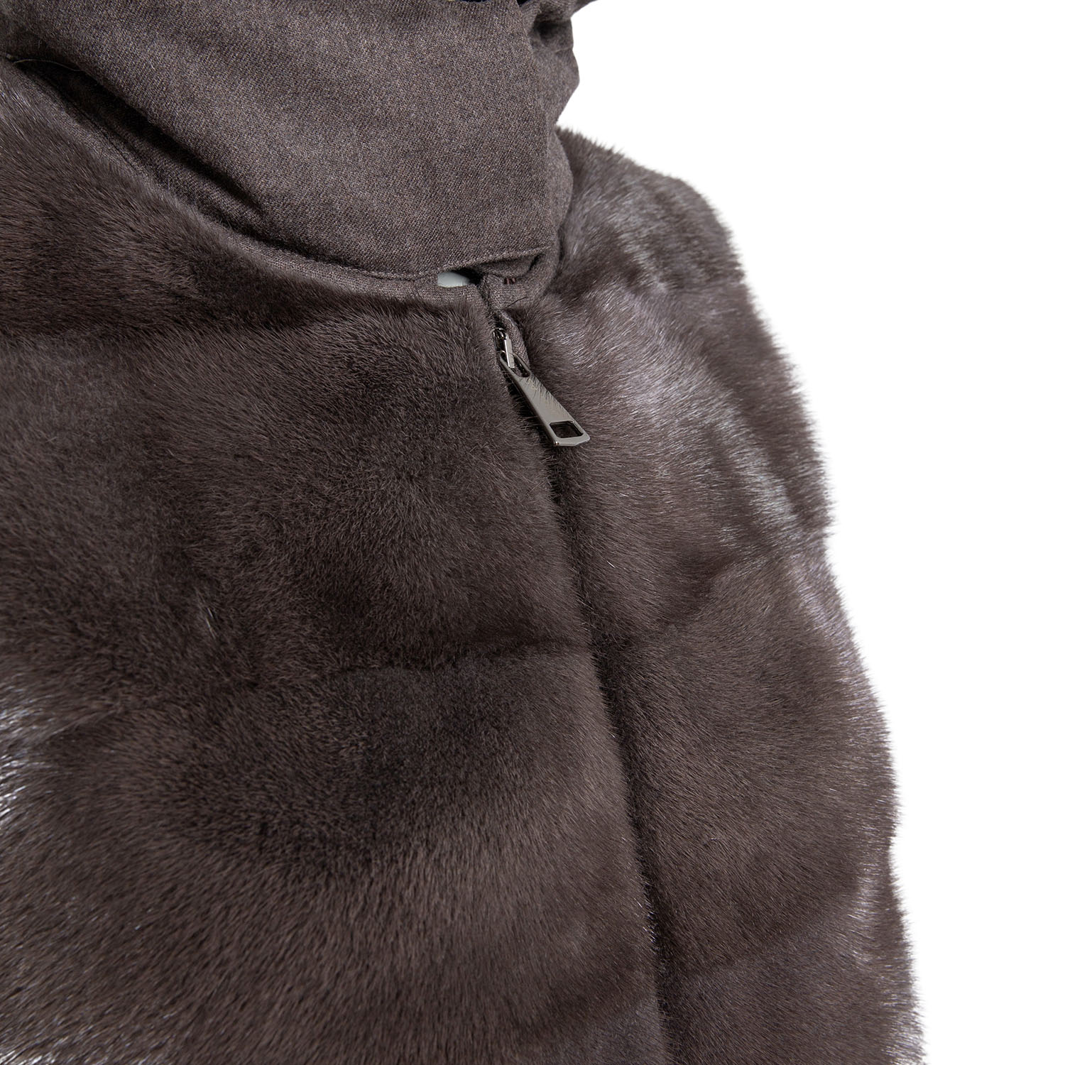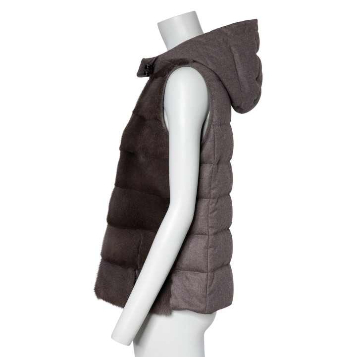 Graues Modell aus Nerz und Wolle mit abnehmbarer Kapuze, Reißverschluss und Eingrifftaschen. Innen mit Daunen gefüttert. Tragespuren vorhanden.
