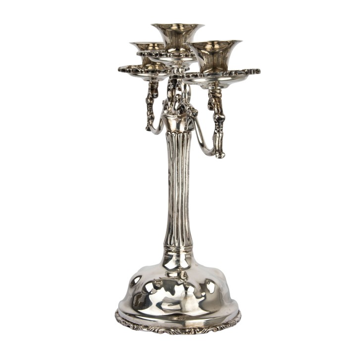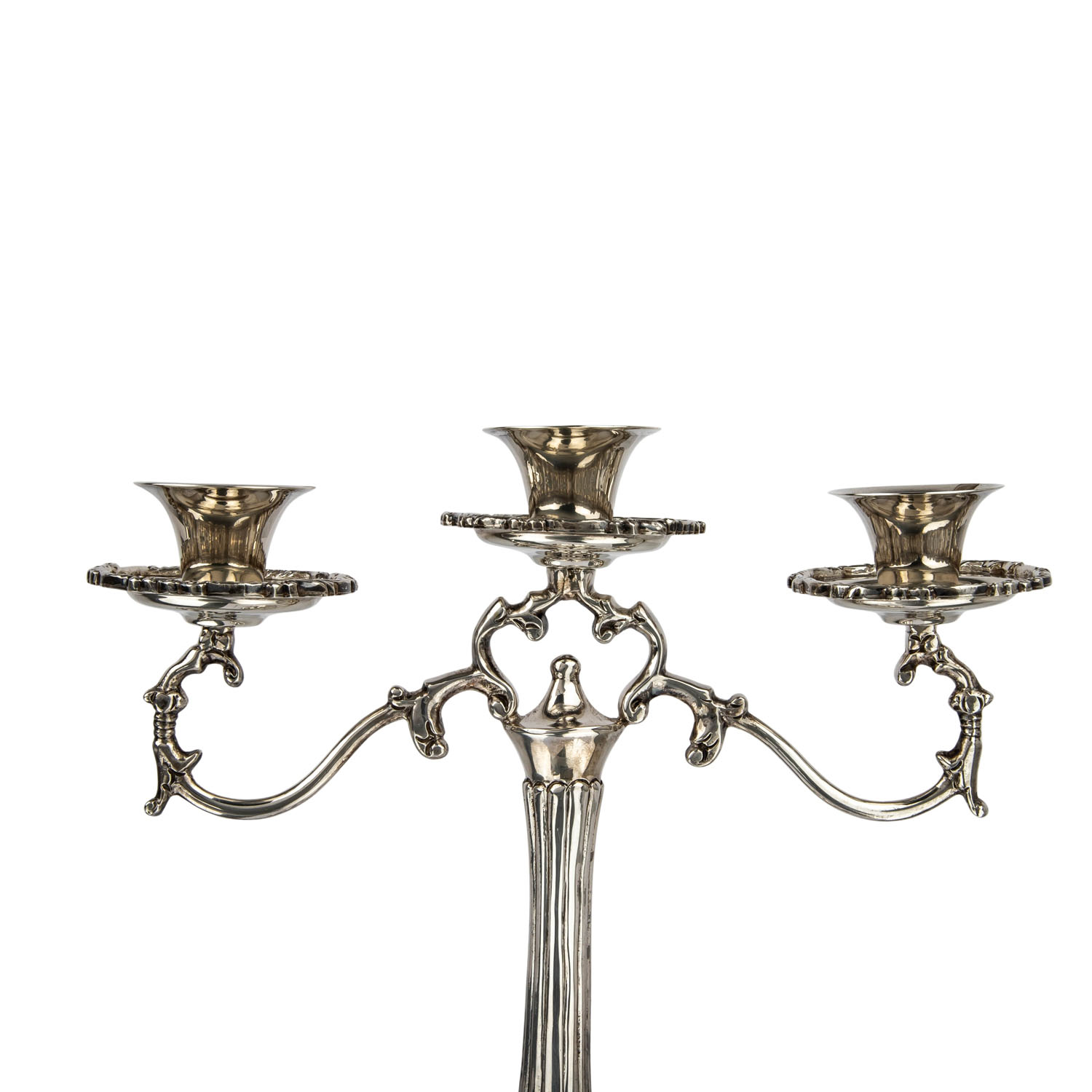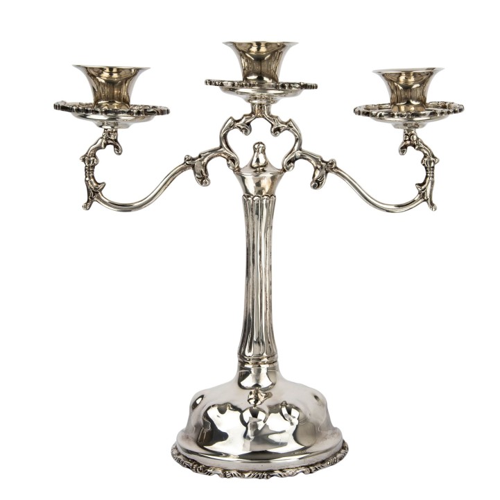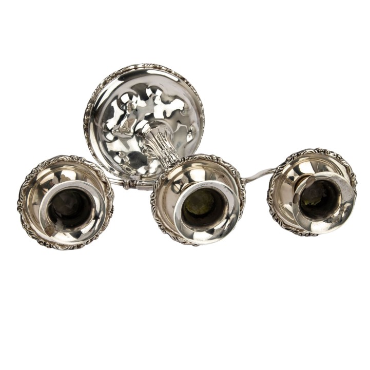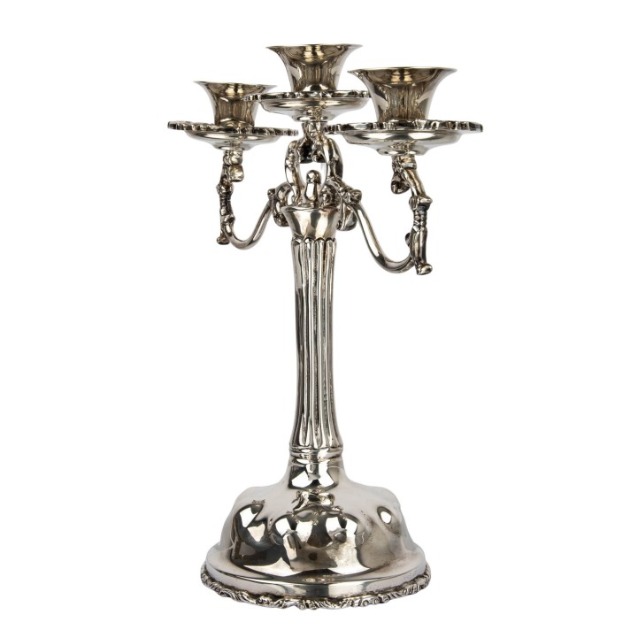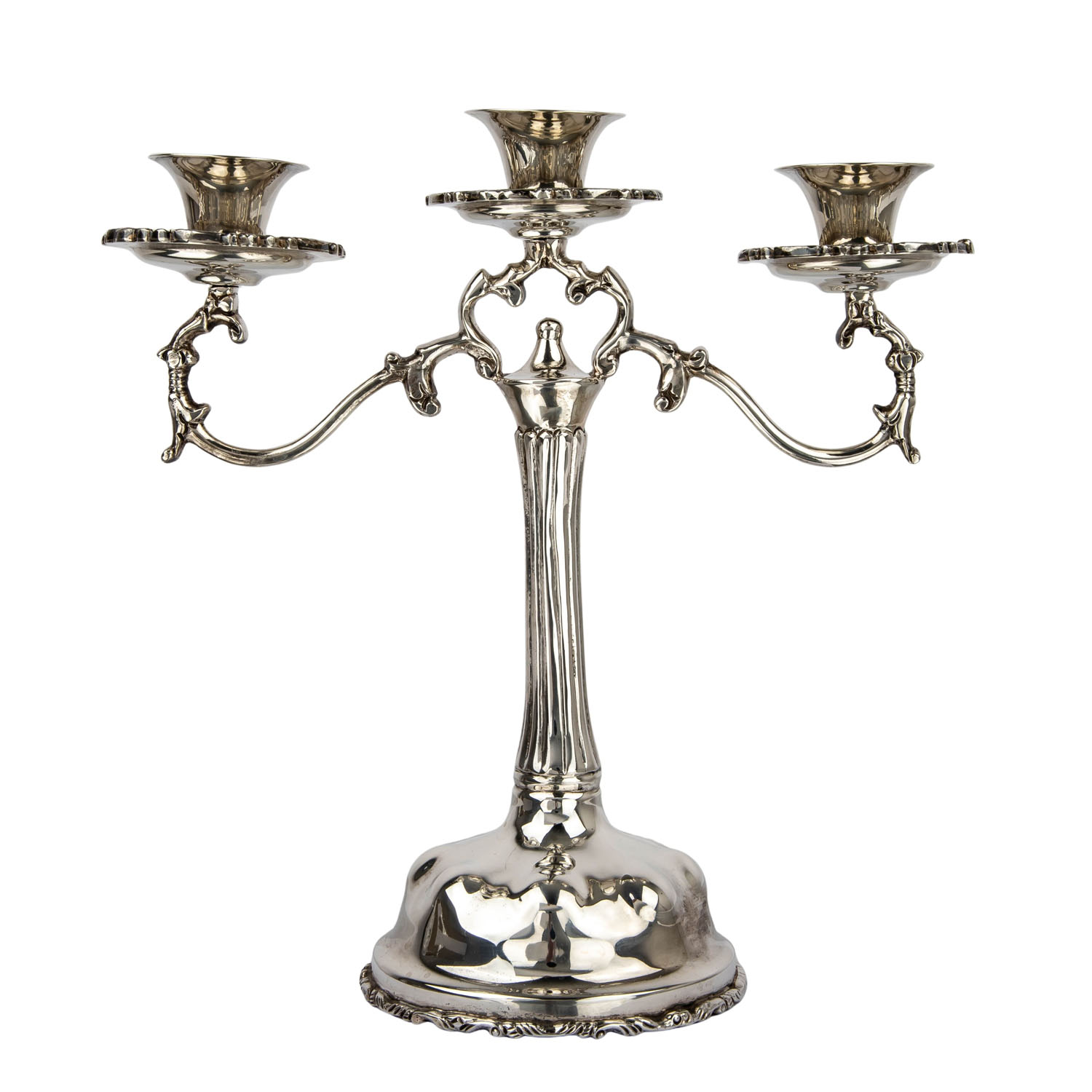 runder Standfuß mit Buckeldekor, kannelierter, beschwerter Schaft und volutenförmige Leuchterarme, drei abschraubbareTüllen mit Tropfschutz, H: ca. 26 cm, entsprechen punziert, Gesamtgewicht ca. 829 g. Alters- und Gebrauchsspuren. Tlw. Kratzspuren.