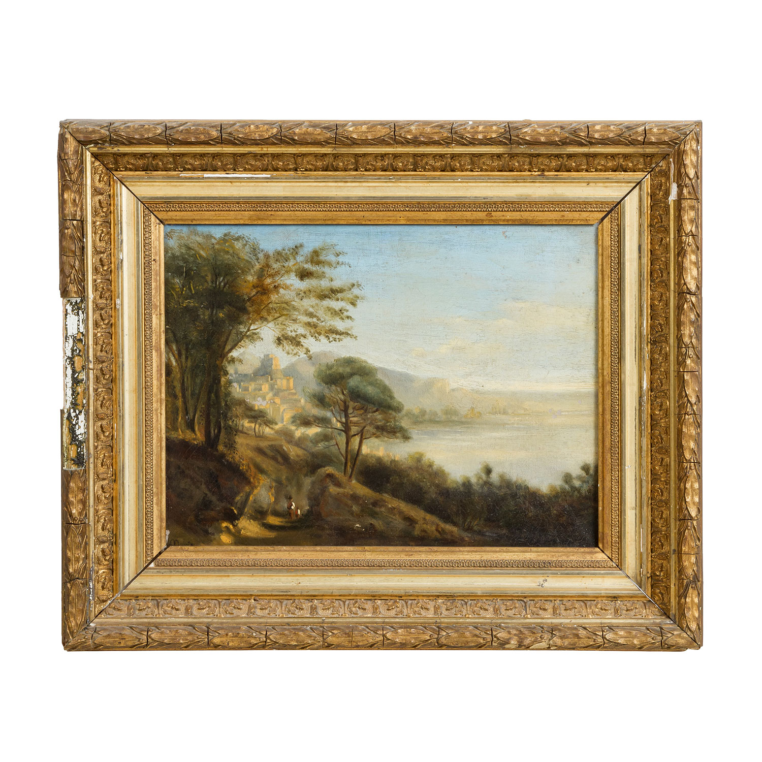 MARIE oder MARIA (undeutlich sign., Künstler/in 19. Jh.,), ""Französische Küste mit Stadt am Berg"", u.li. signiert (teilw. vom Rahmen verdeckt), Öl/Leinwand (verso Herstellerstempel: Maison Merlin, Paul Denis Succ, Paris), HxB: ca. 25x33 cm (38x46 cm mit Rahmen). Craquelé, Berieb und Farbabplatzer, Lw. minim. gewölbt, restauriert. Mit Rahmen (beschädigt). VERSO Etikett mit undeutlicher Bezeichnung.