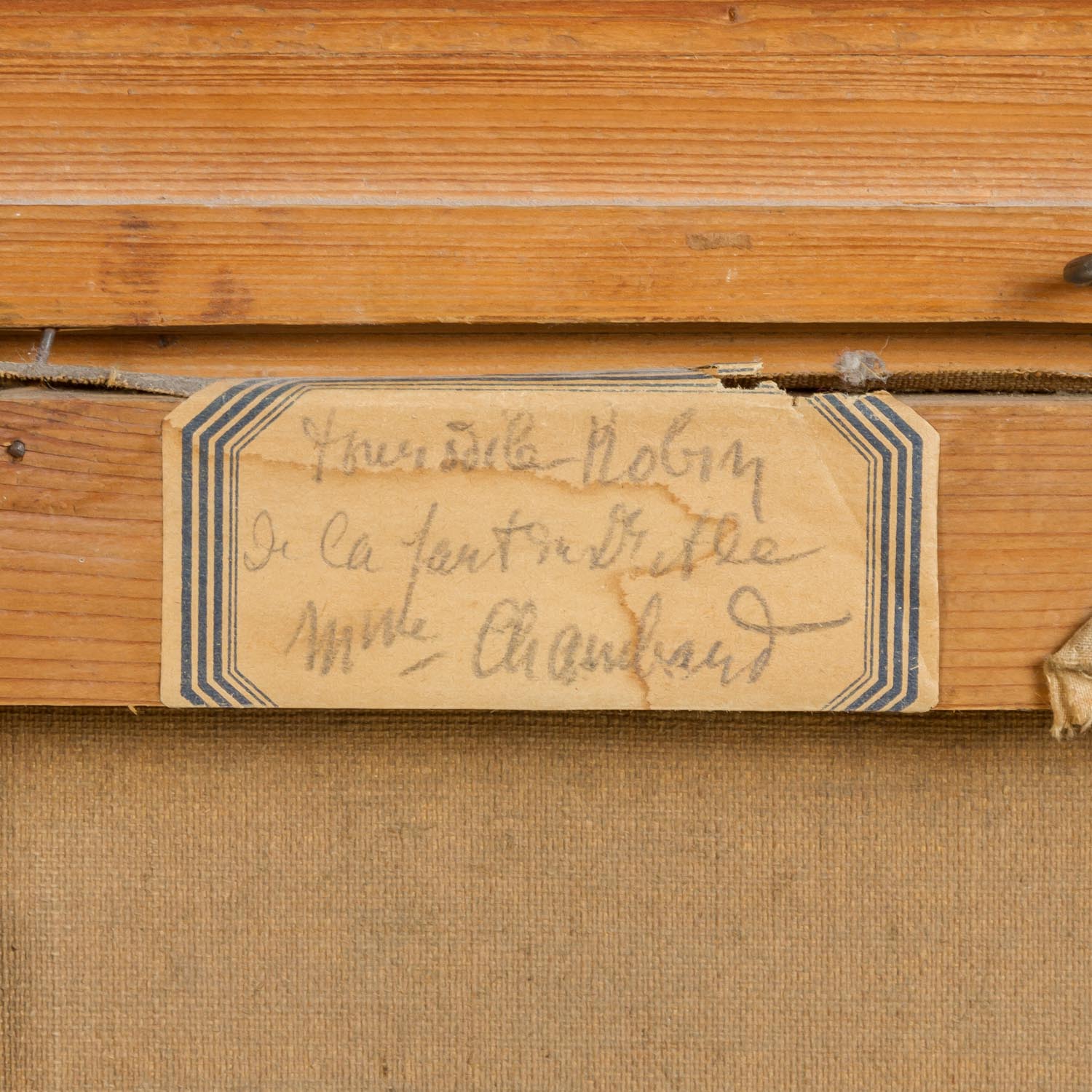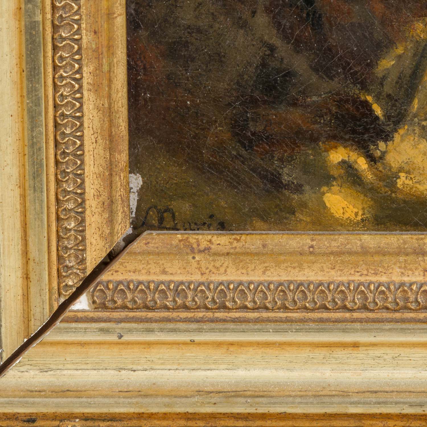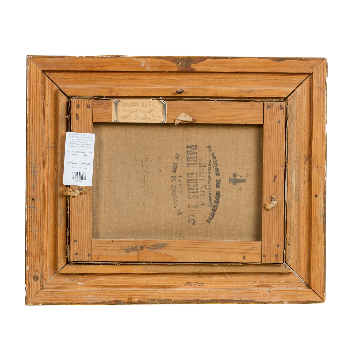 MARIE or MARIA (indistinctly signed, artist 19th century), ""French coast with city on the mountain"", signed (partly covered by the frame), oil / canvas (on the reverse manufacturer's stamp: Maison Merlin, Paul Denis Succ, Paris), HxW: approx. 25x33 cm (38x46 cm with frame). Craquelé, rubbed and flaked off paint, Canvas minimal arched, restored. With frame (damaged). VERSO label with indistinct name.