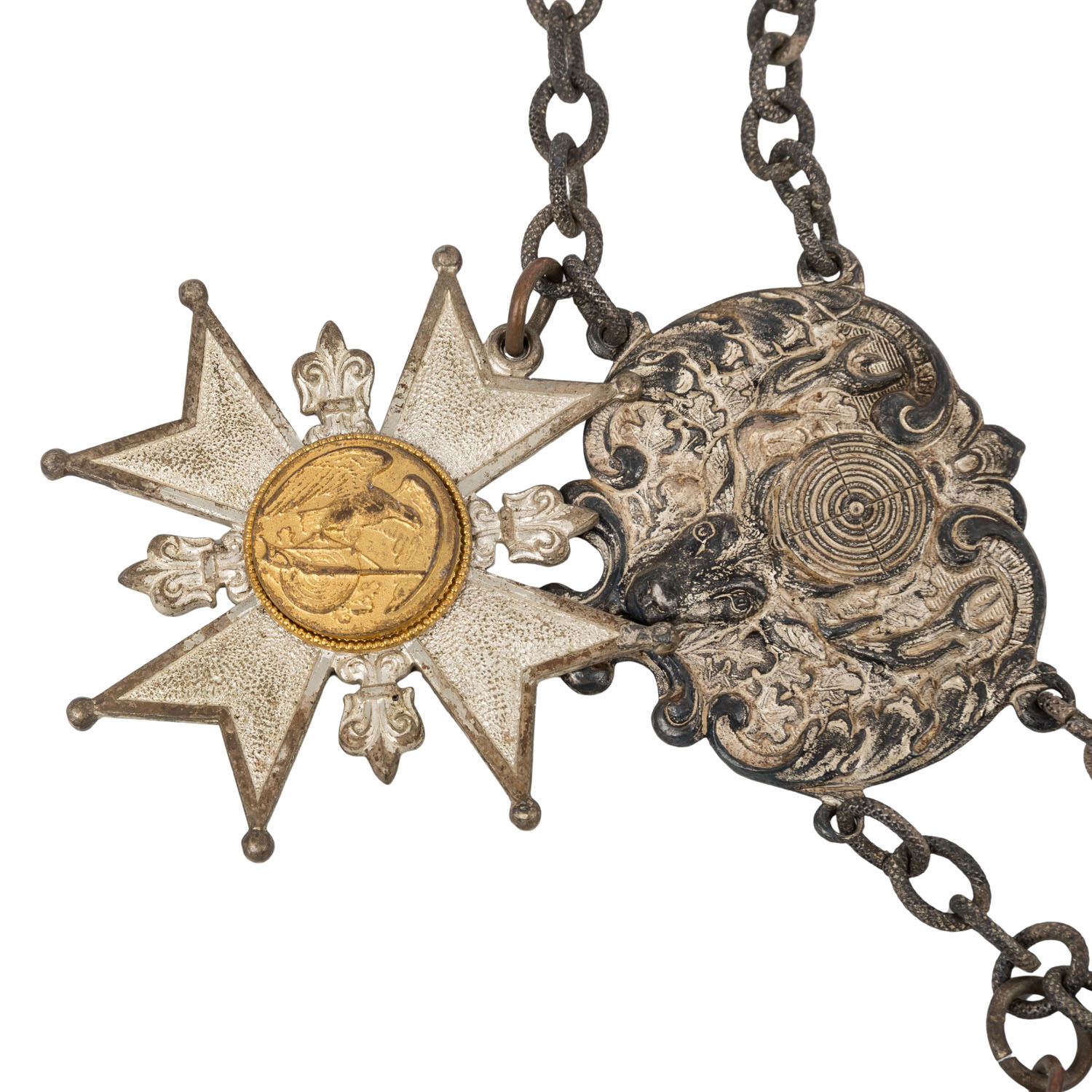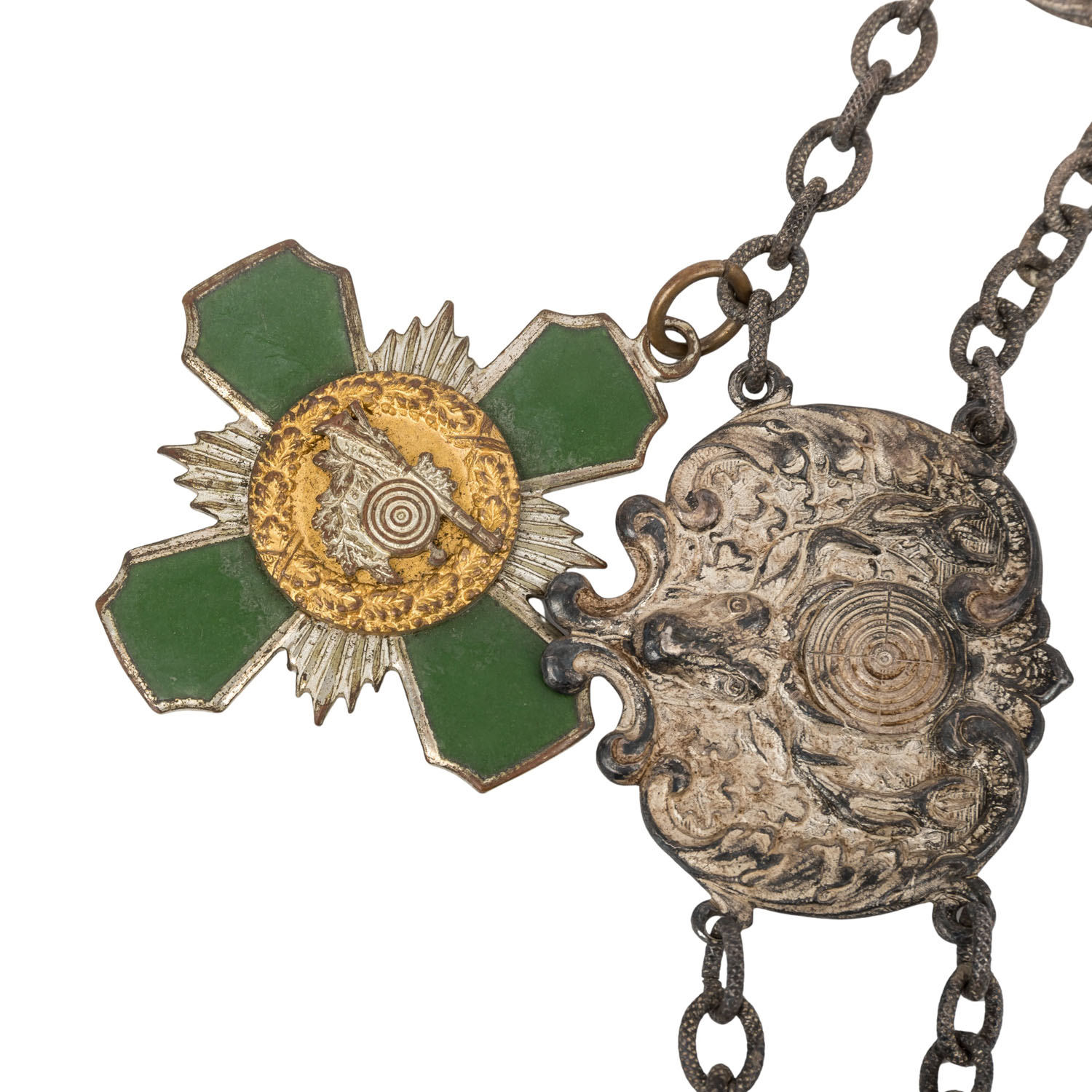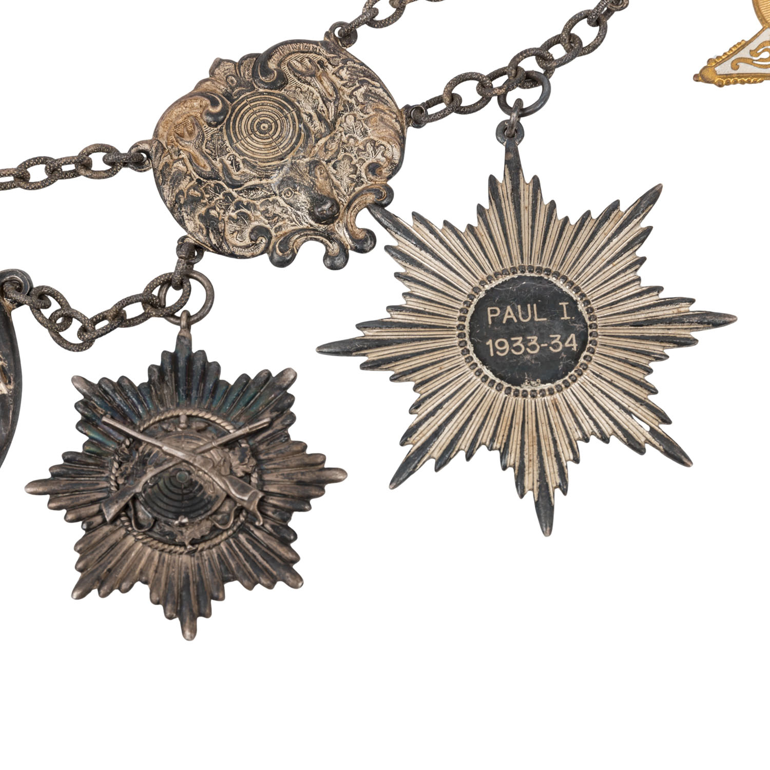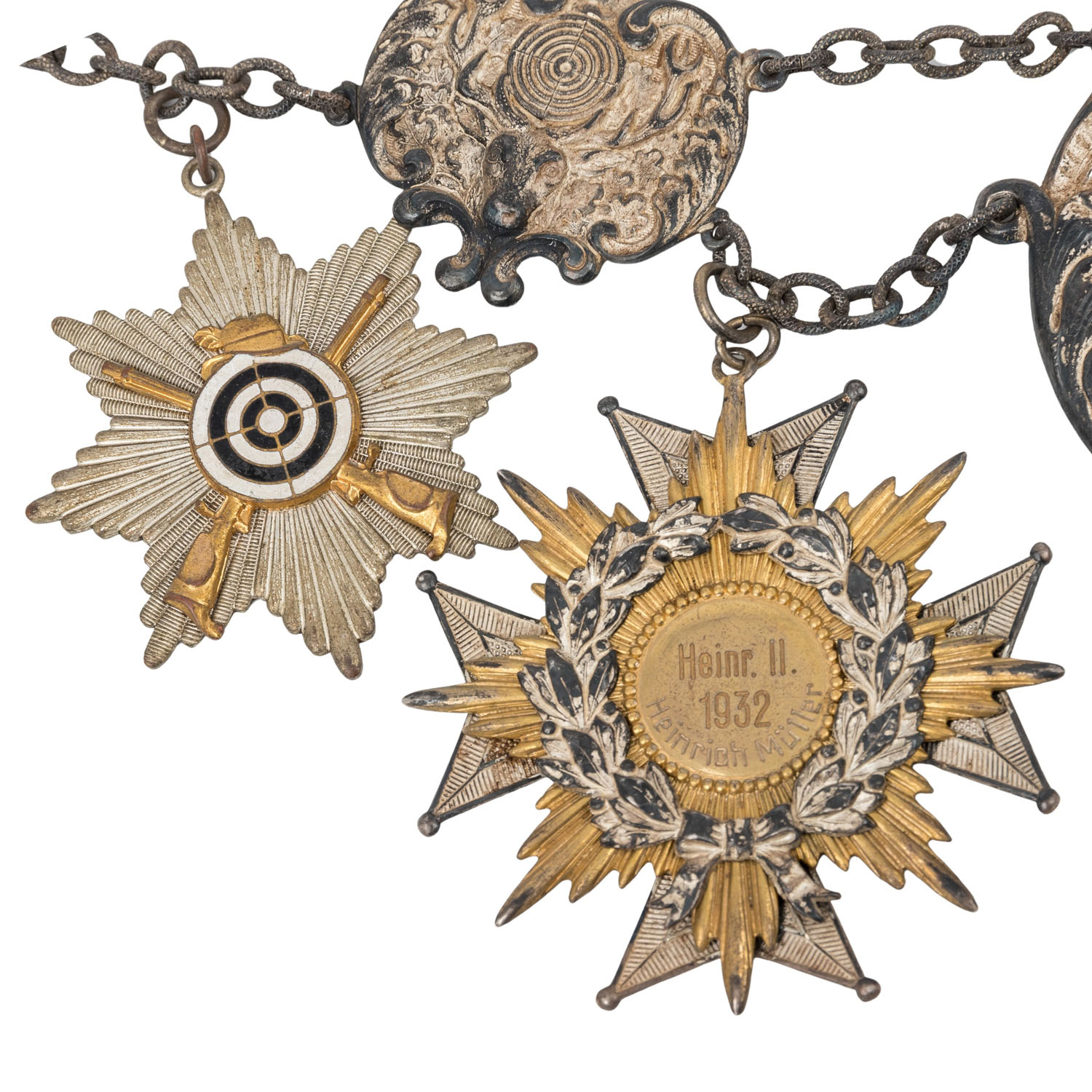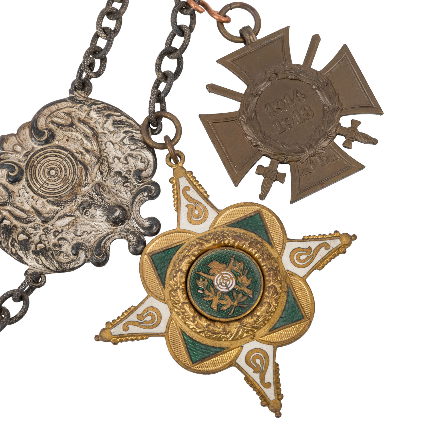 Buntmetall, hohl geprägt, Mittelteil mit 835er Silbereinlage. Diverse Schützenorden und -medaillen mit unterschiedlichen Signaturen rückseitig. Vermutlich teilweise wohl ausgedachte Namen. Überwiegend 1930er Jahre, wohl nicht alle original zugehörig zur Kette, sondern nachträglich hinzugefügt, darunter auch 1 x Frontkämpfer Ehrenkreuz für den Ersten Weltkrieg 1914-1918 mit Schwertern. Alters- und Gebrauchsspuren wie Tönung und Flecken.