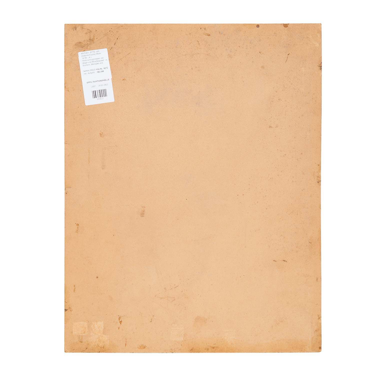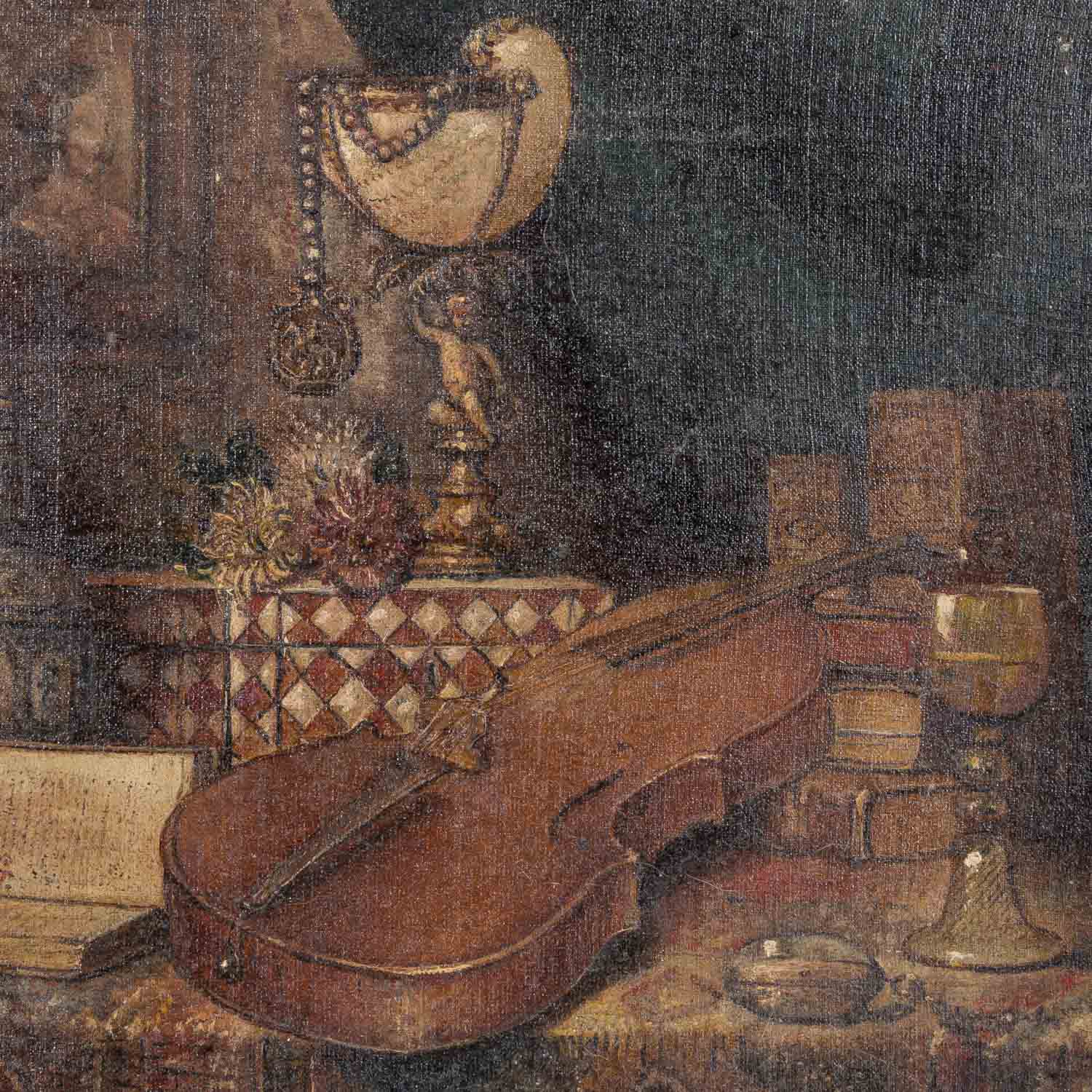 | MATZEK, OTTO, attr. (Austrian painter 19th/20th century), 'Historicism still life with violin and shell cup', with books, wine glass and casket arranged on carpet, o.li. Remaining signature, oil on canvas mounted on cardboard, approx. 49x38 cm. Color chips and rubbing.