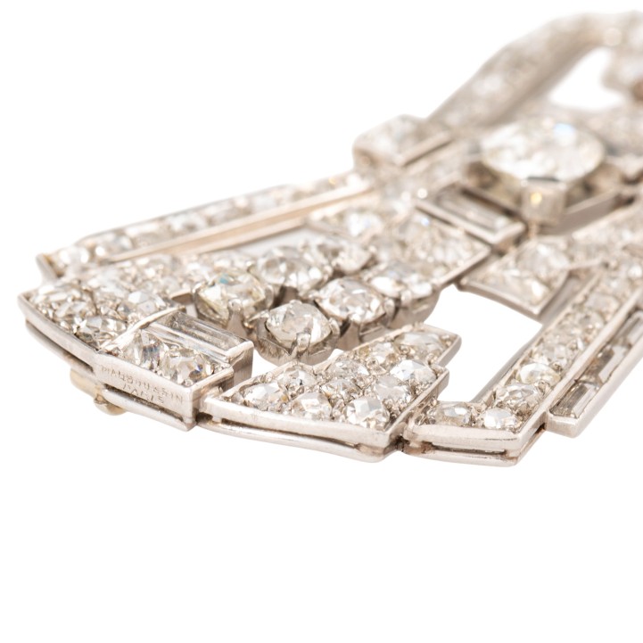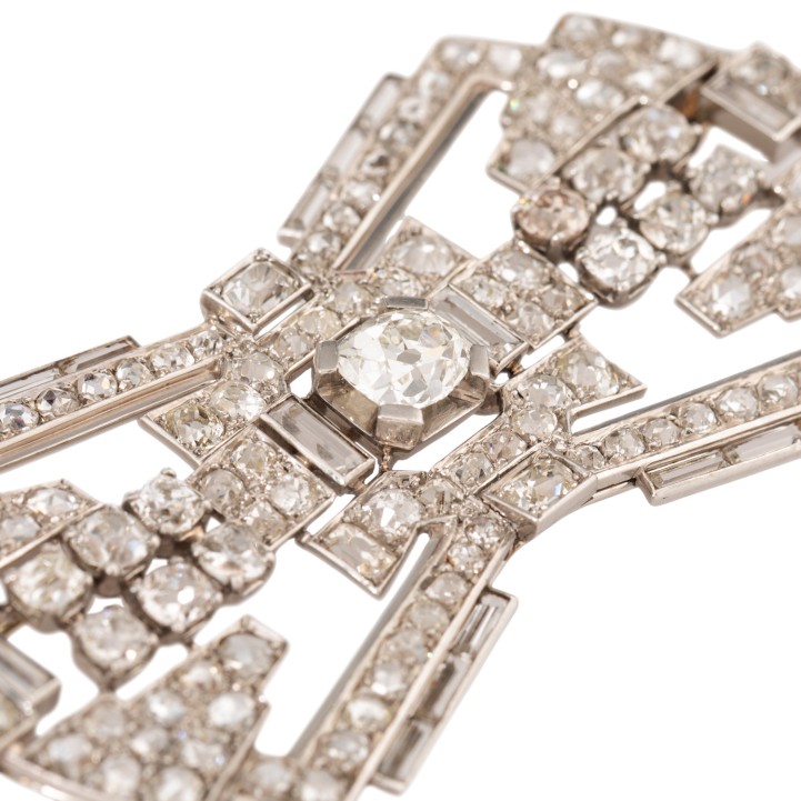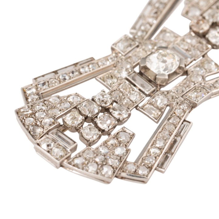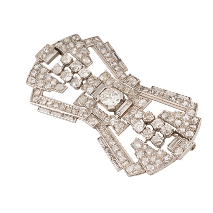 mit Diamanten in verschiedenen Schliffen von zus. ca. 6,02 ct, WEISS-LGW (H-I)/VS-PI, Diamanten teilweise bestoßen, Platin, 18 g, L x B 63 x 33 mm, 20. Jh., guter Zustand. Handarbeit.