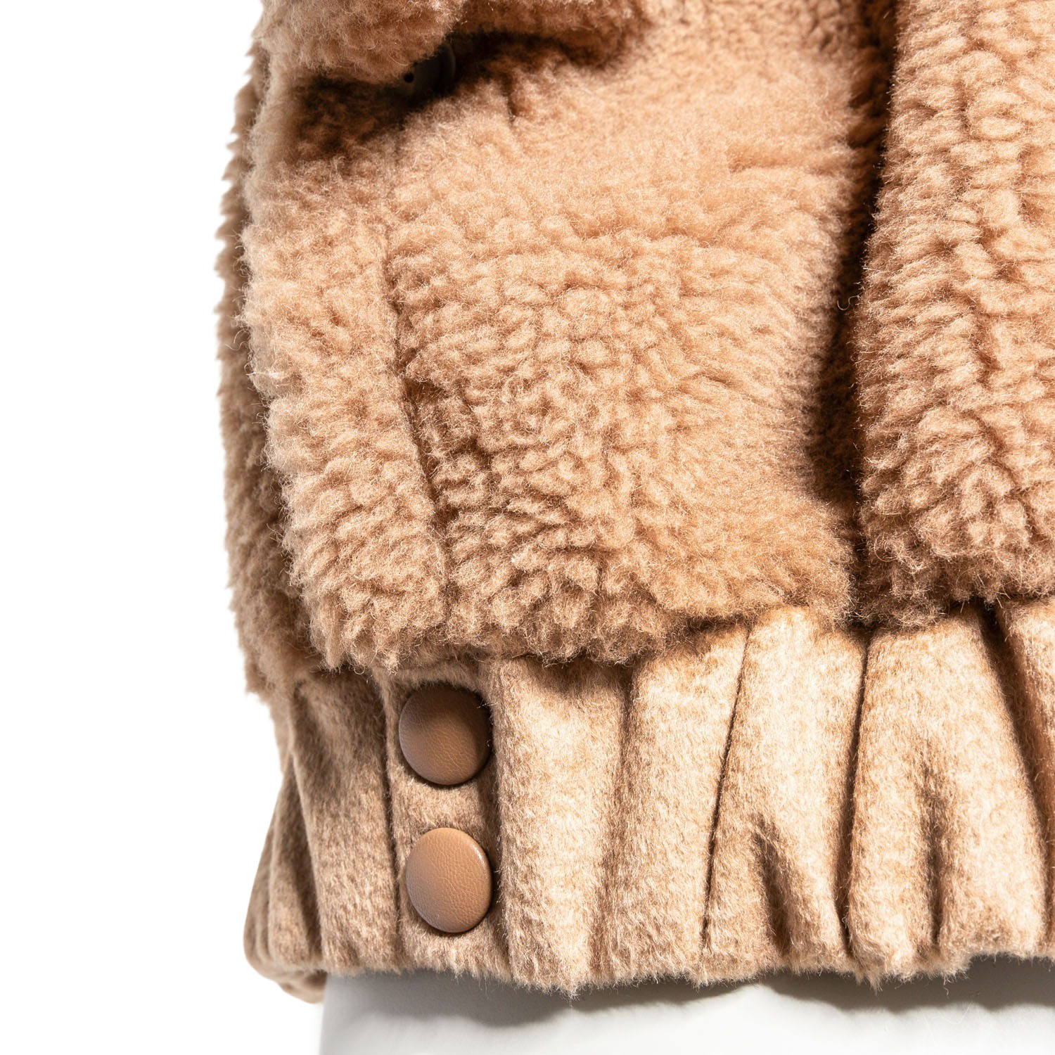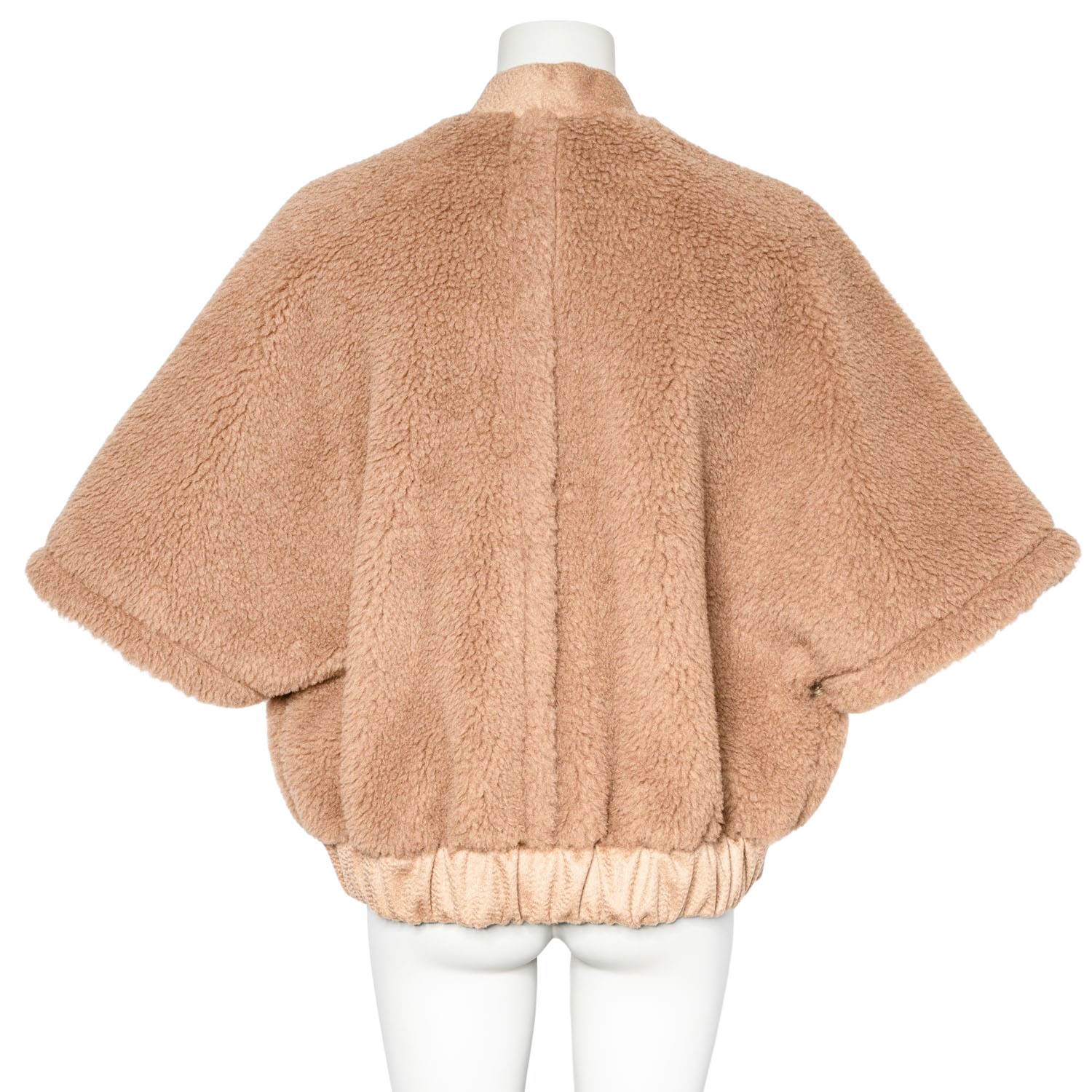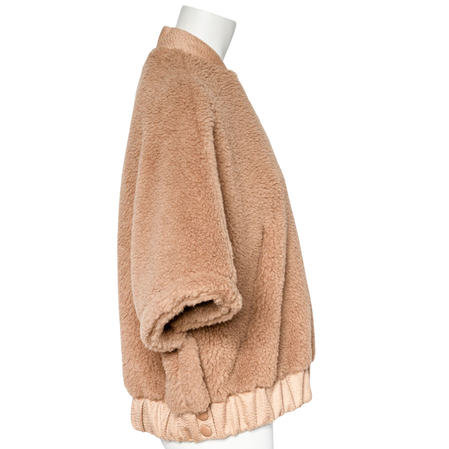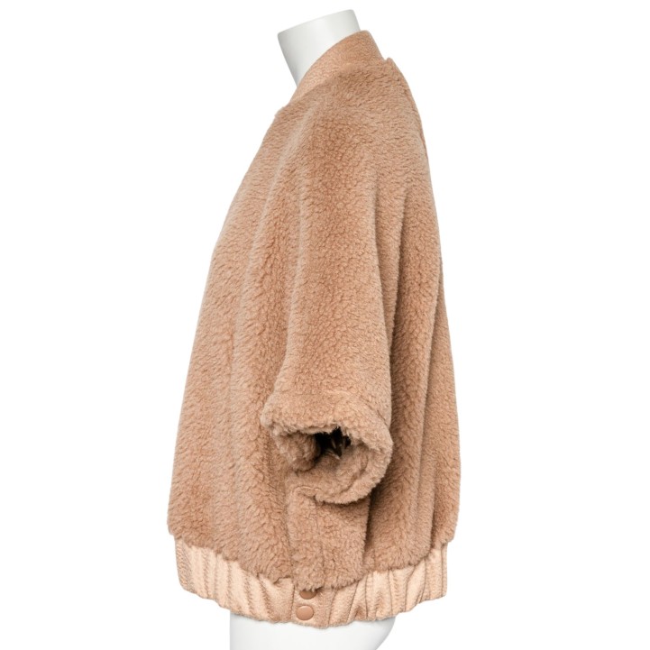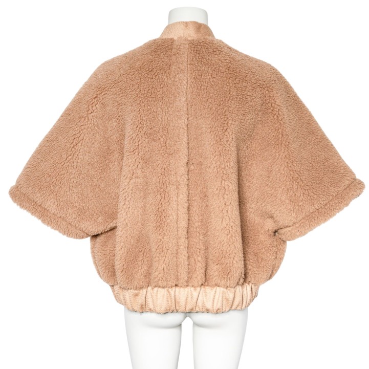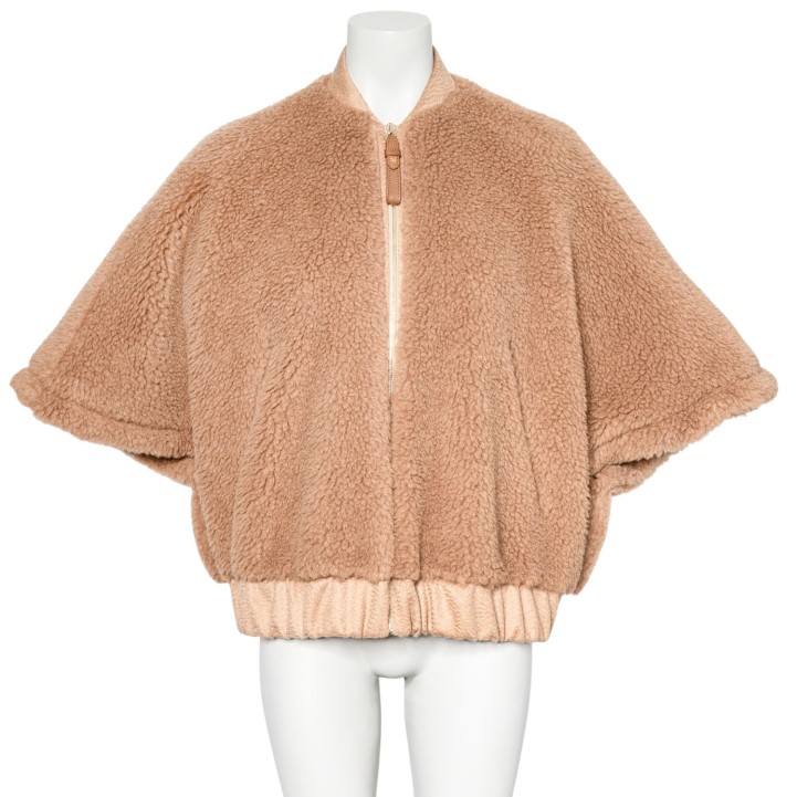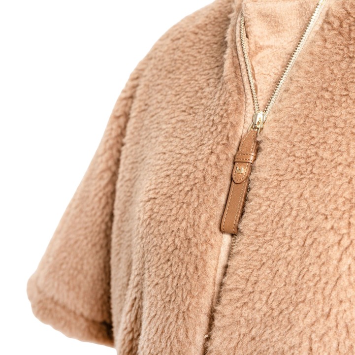 Kamelhaar-Seiden-Gemisch. Teddy-Serie in Beige mit goldfarbener Hardware, weiten Ärmeln, Reißverschluss und Eingrifftaschen.