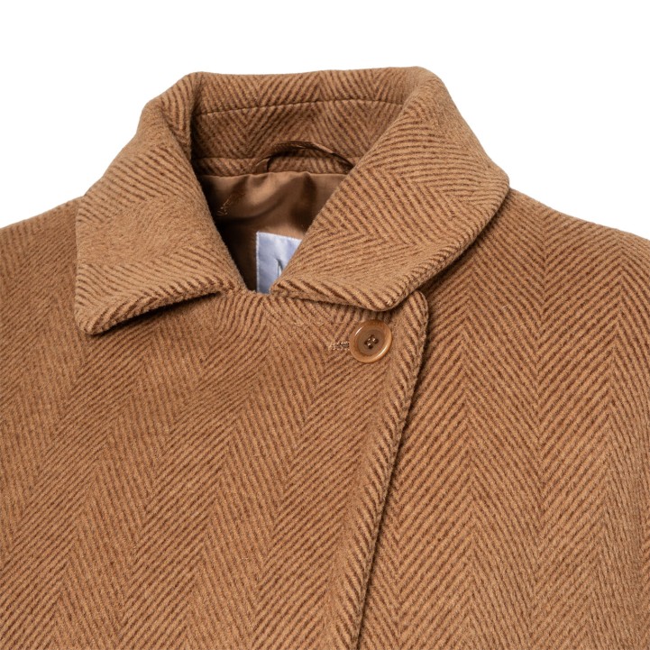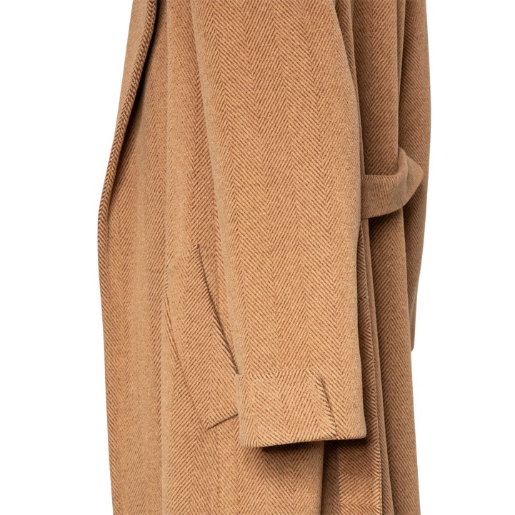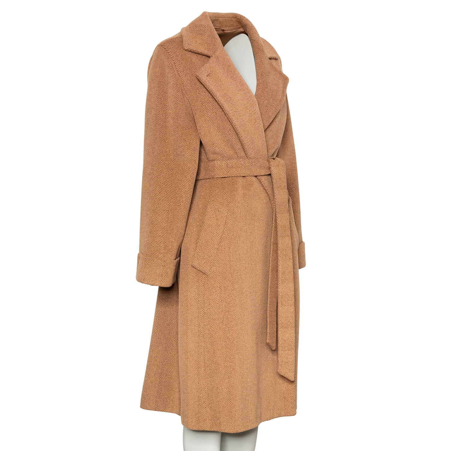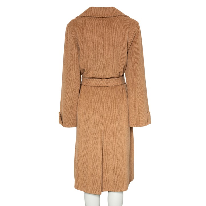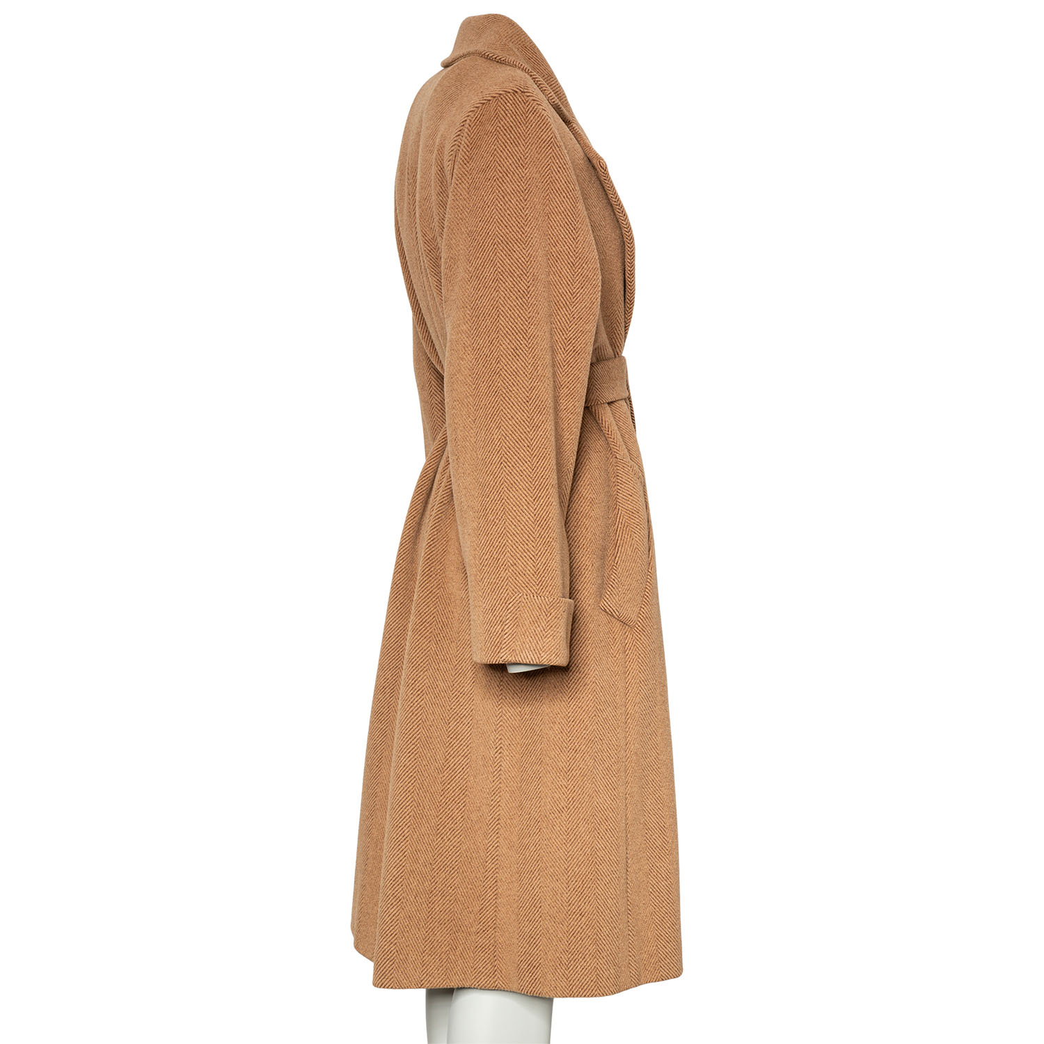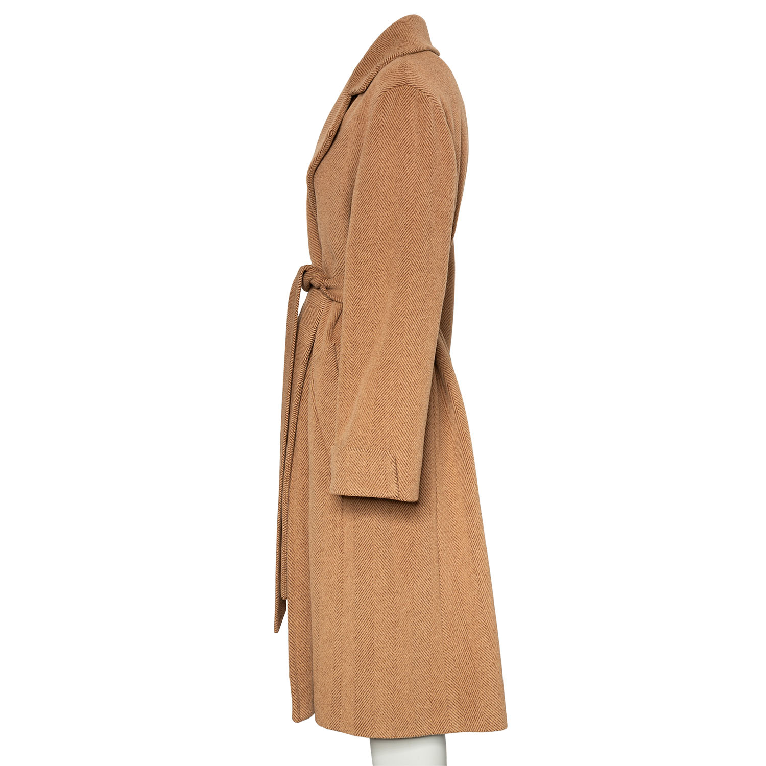 Alpaka-Wollgemisch in Hellbraun mit breitem Reverskragen. Taillengürtel anbei. Schichtes Design. Sehr guter Erhalt.