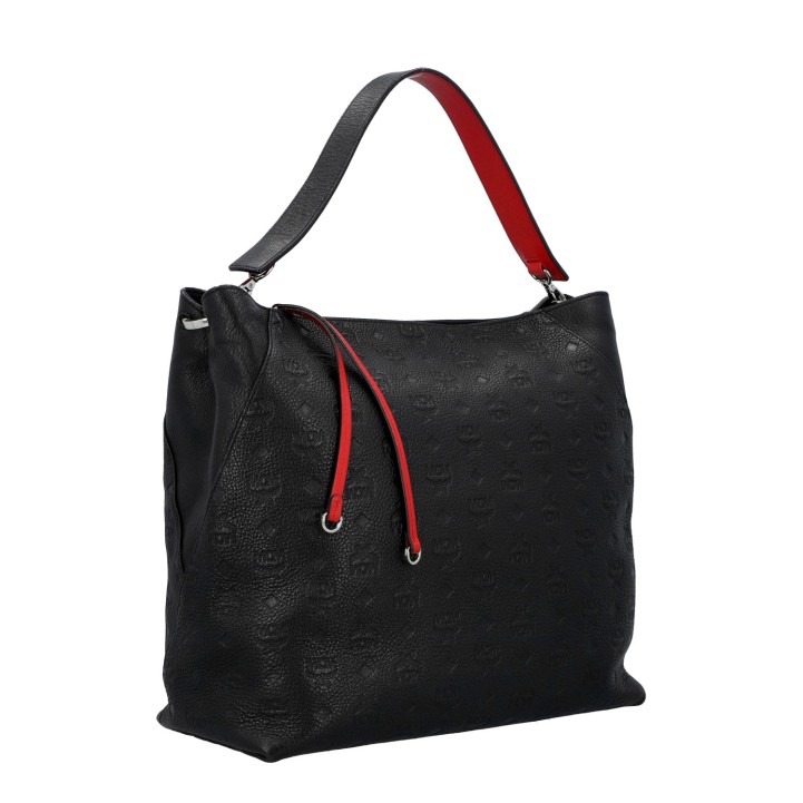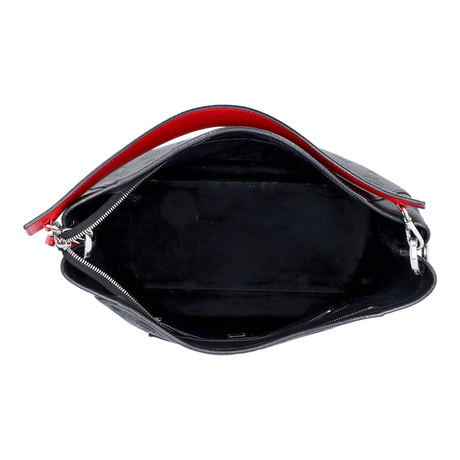 Schwarzes Leder mit Monogramm-Prägung, silberfarbener Hardware, Reißverschluss, zwei abnehmbaren Schulterriemen und Außenfach auf der Rückseite. Innenraum aus Textil mit drei Fächern, eines davon mit Reißverschluss. Diverse Gebrauchsspuren vorhanden, Flecken und Abrieb. 34 x 14 x 32 cm.