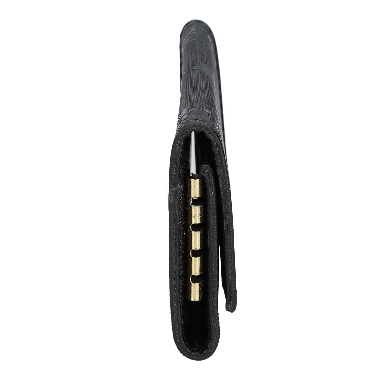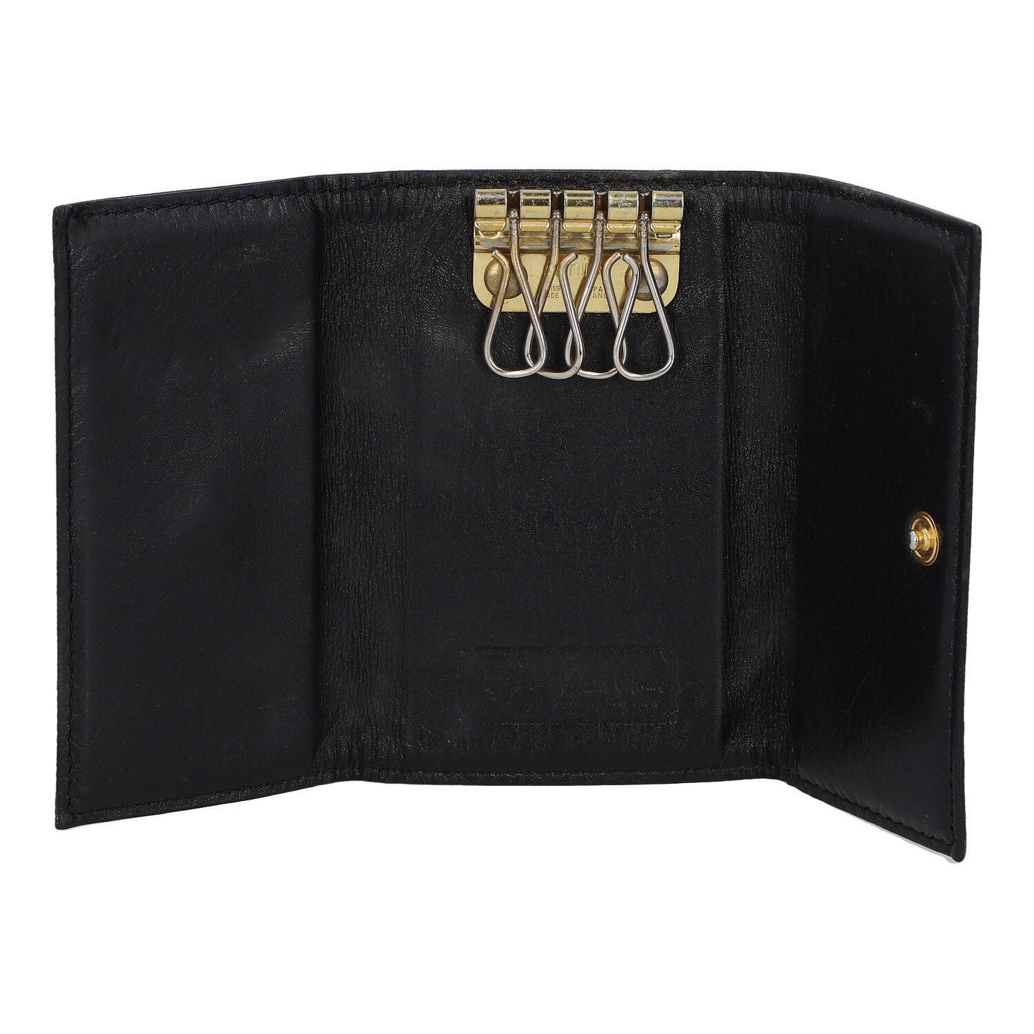 Schwarzes Modell mit Logo-Design, goldfarbener Hardware, vier Haken und Druckknopfverschluss. Gebrauchsspuren vorhanden.