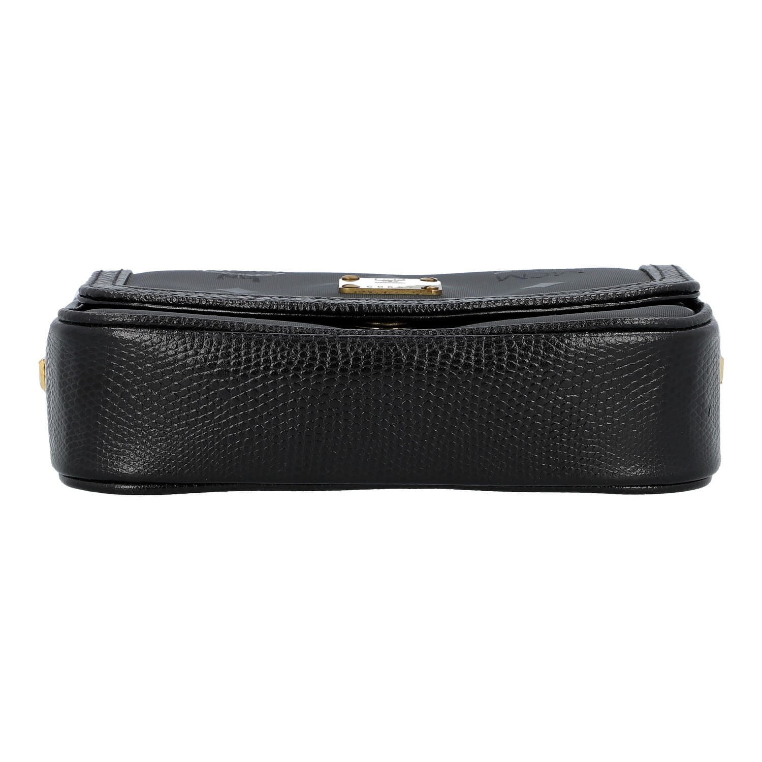Kleines Modell in Schwarz aus Textil und Leder mit Logomuster und goldfdarbener Hardware. Feiner Gliederkettenriemen. Hauptfach mit Überschlag und magnetischem Verschluss. 16x4,5x12cm.