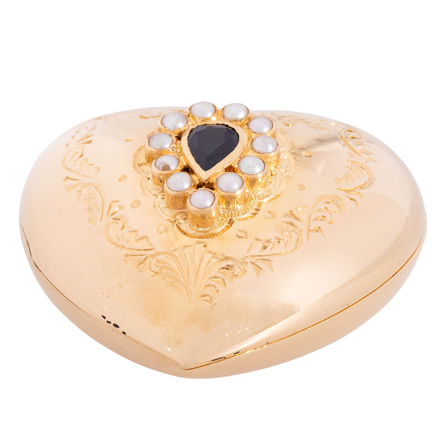 tropfenförmig facettiert, ca. 6 x 4 mm, umrandet von 11 weiße Halbperlen, D: 2 mm, GG 18K, 13,7 g, L x B: 40 x 31 mm, Handgravur vorne, Ende 20. Jh., minimale Tragespuren. Handarbeit.
