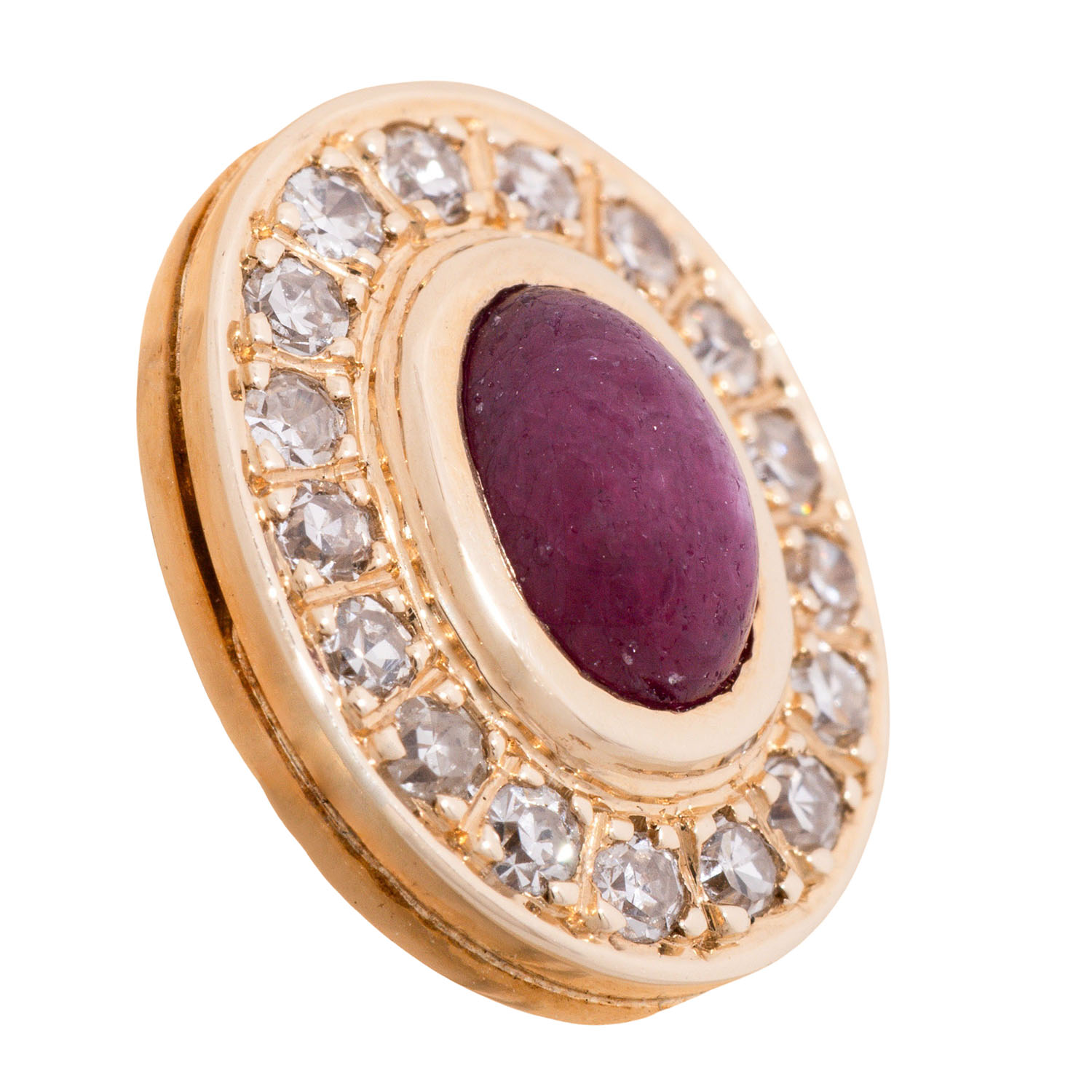 ca. 6 x 4 mm, umgeben von 17 Achtkantdiamanten, ges. ca. 0,12 ct, GG 14K, 22,9 g, L x B: 55 x 34 mm, Ende 20. Jh., leichte Tragespuren.