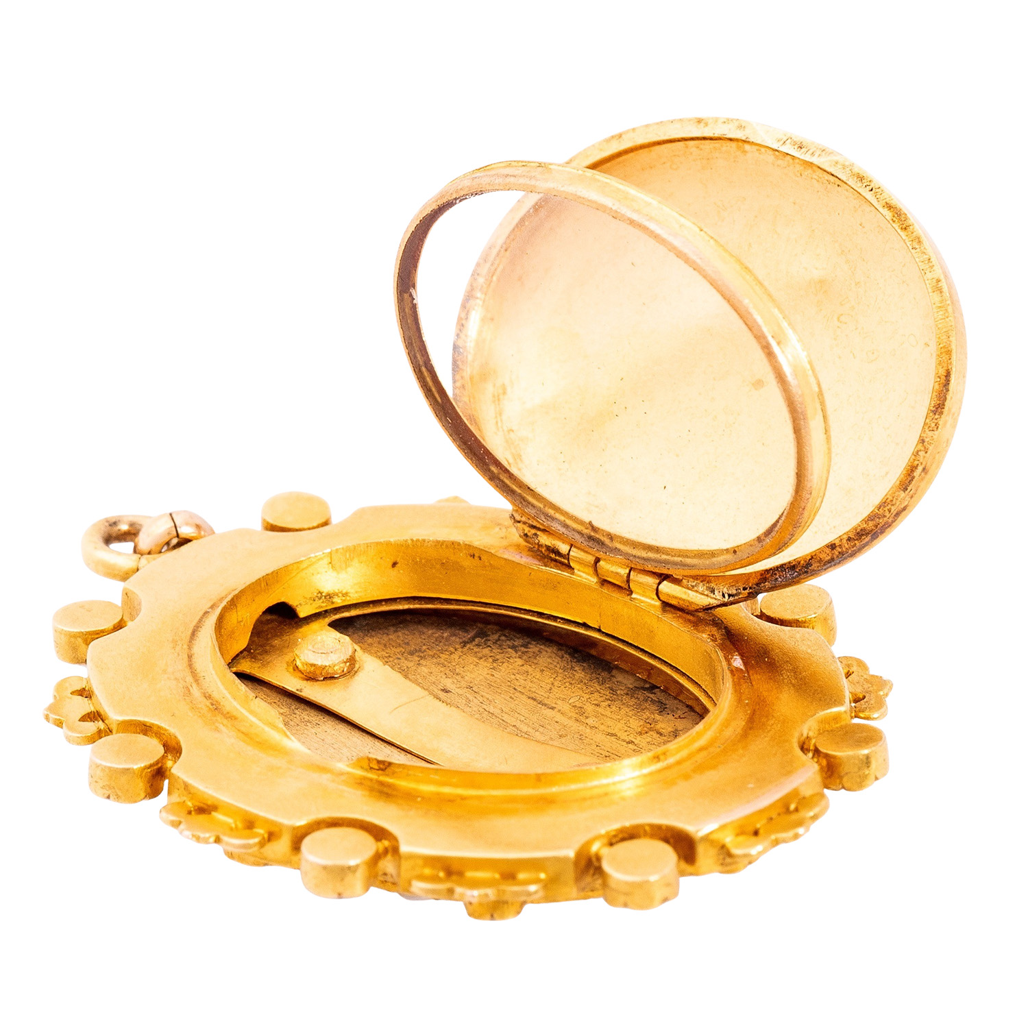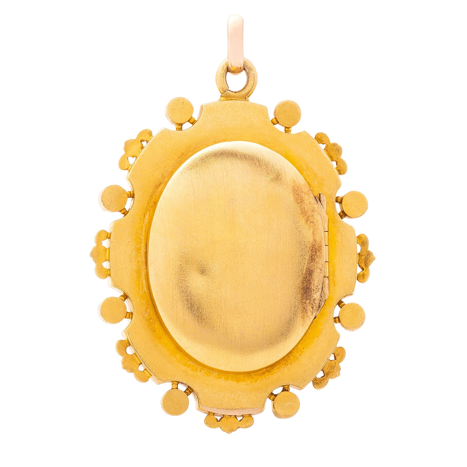 weitere Verzierungen aus schwarzem Email, Kordeldraht und floralen Details, rückseitg Deckelklappe innen mit Glasrahmen, GG 18K feuervergoldet 18,1 g, 5x3,5 cm, Kette neuzeitlich aus GG 14K, 9 g, L: 56 cm, Anhänger Ende 19. Jh., rückseitig leicht gedellt, Scharnierbolzen etwas herausstehend, insgesamt altersgem. guter Erhalt. (3)