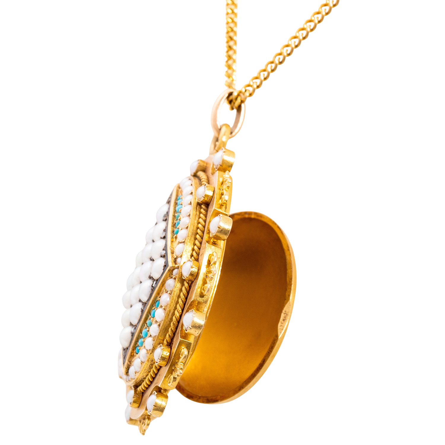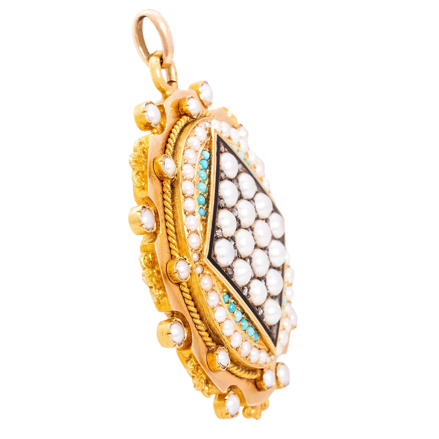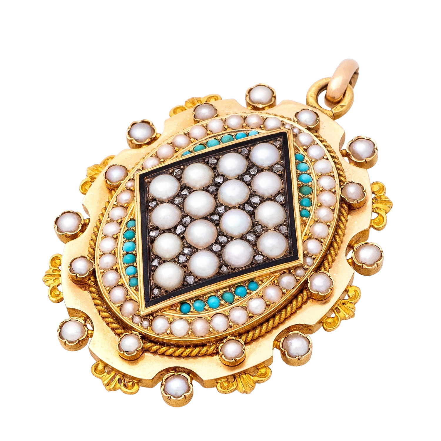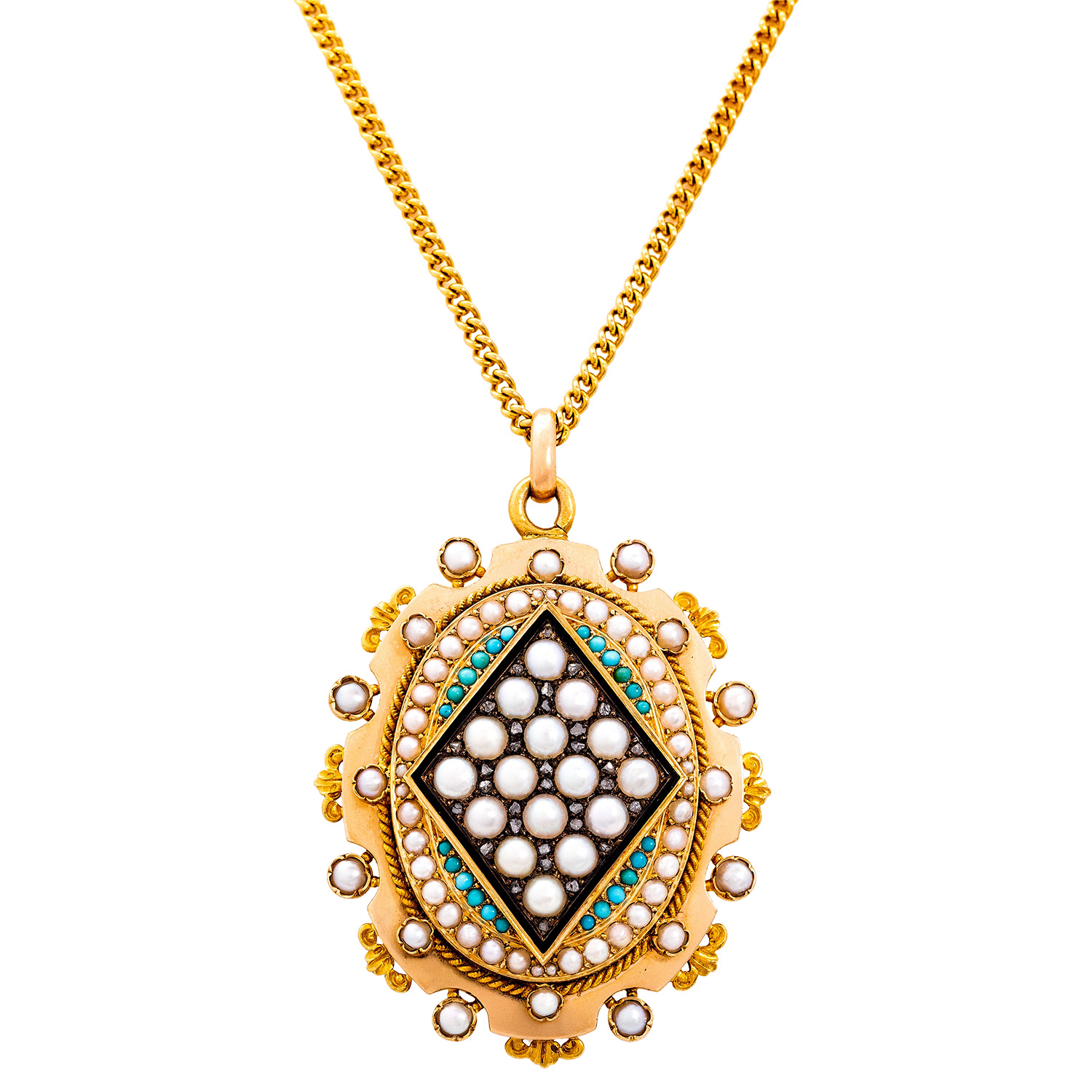 Medaillonanhänger mit Halbperlen, Türkisen und Diamantrosen,