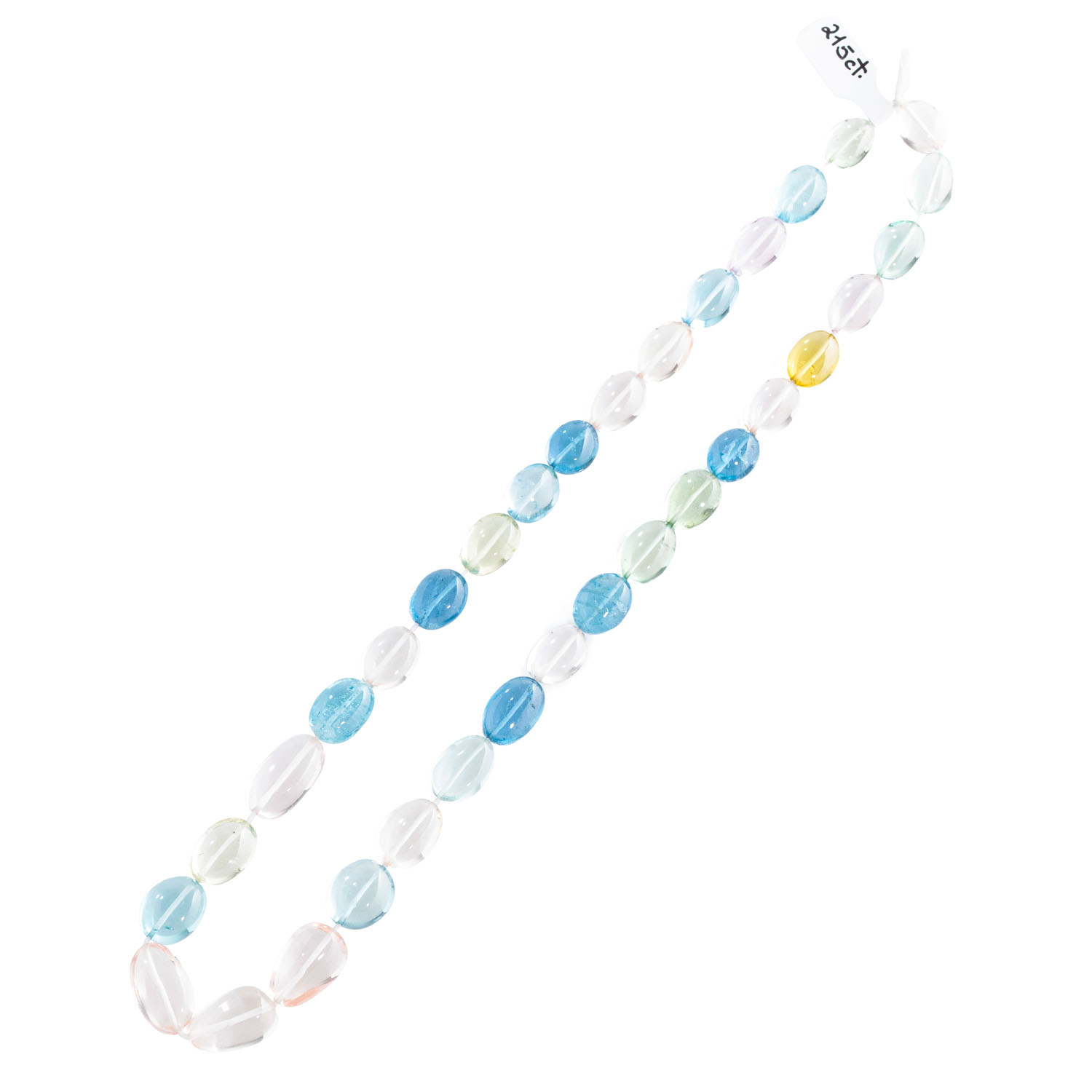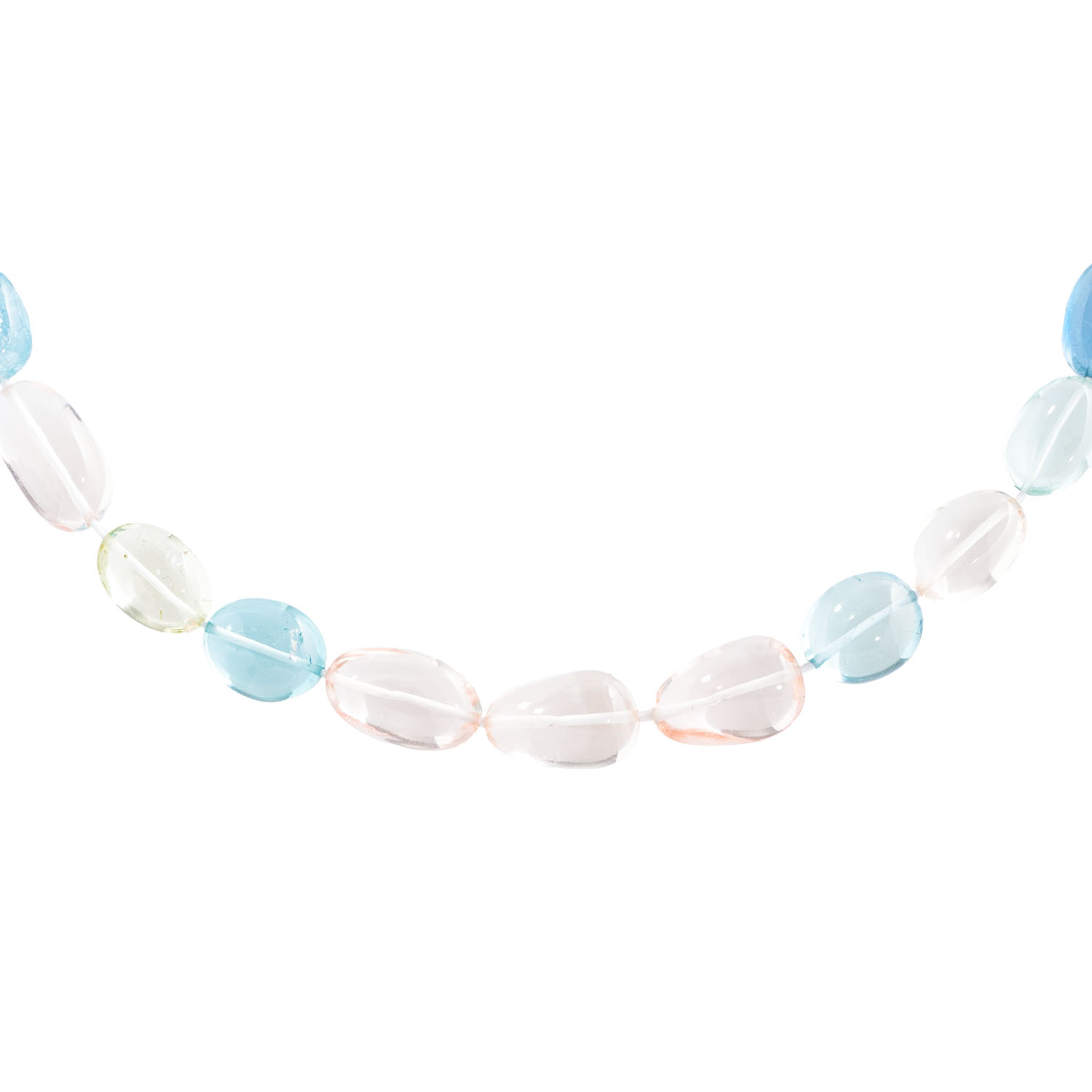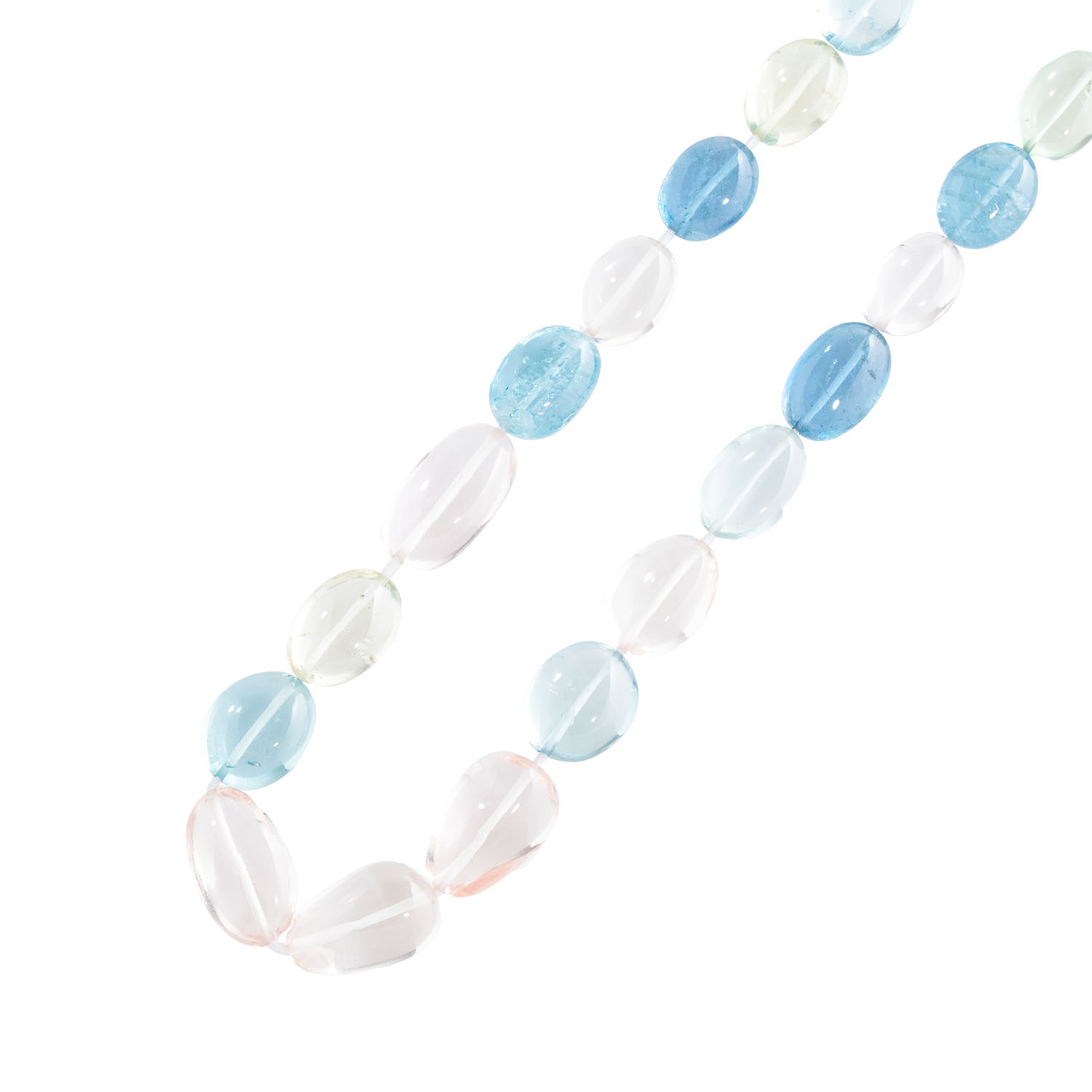 aus 33 polierten Beryllcabochons in blau (Aquamarin), rosa (Morganit), sowie gelben und grünen Farbtönen, zus. ca. 215 ct (inkl. Schnur), von ca. 11 x 8,5 bis ca. 16,5 x 10,5 mm, L: ca: 42,5 cm, gefädelte Linie ohne Verschluss, 21. Jh., neuwertiger Zustand.