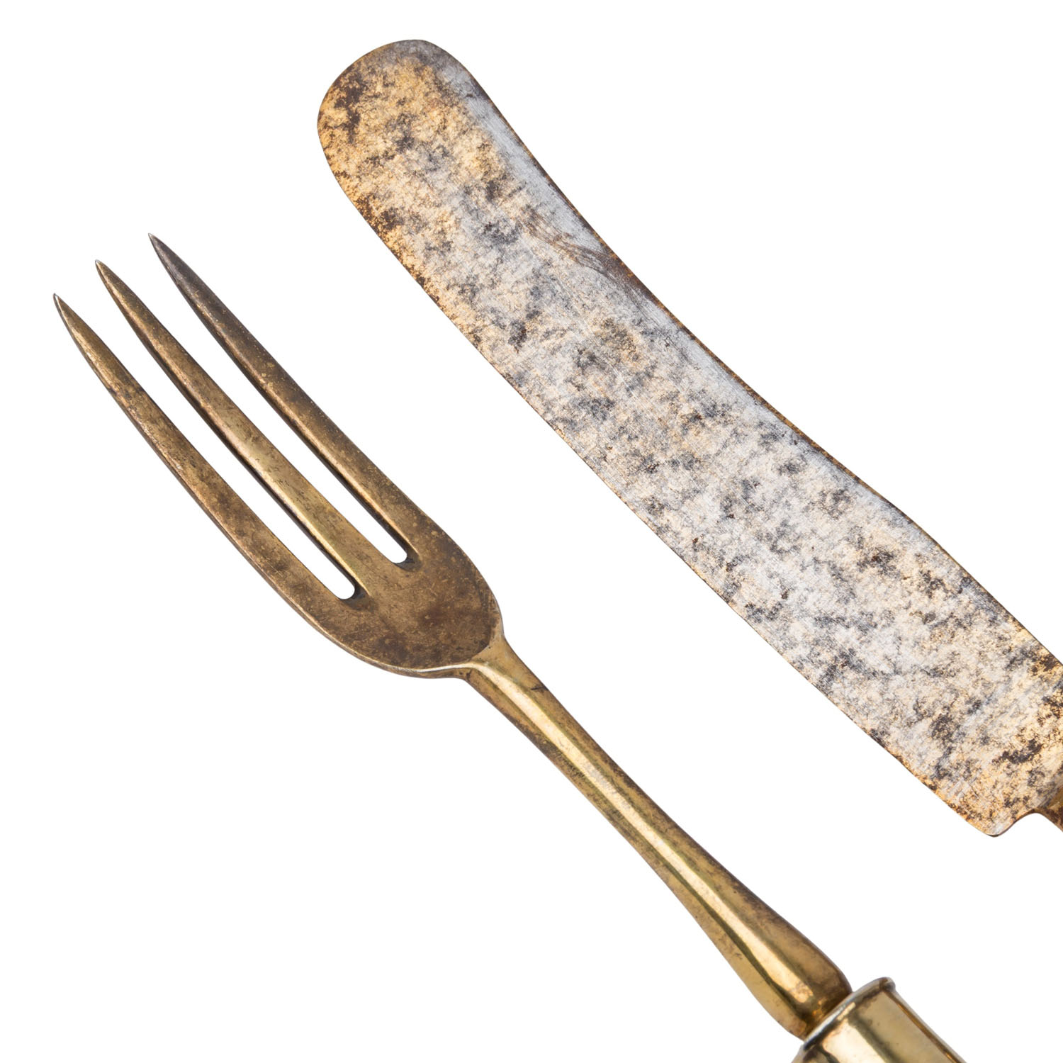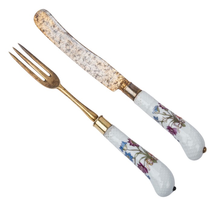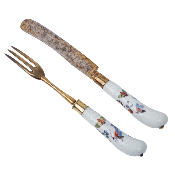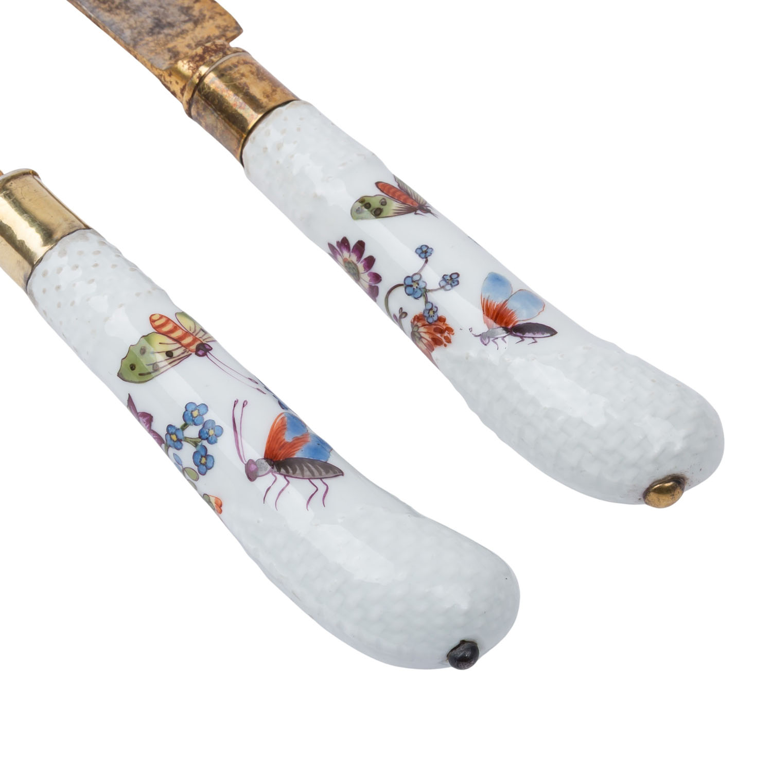 Gabel und Messer mit pistolenförmigen Porzellangriffen, die Gabelzinken sind aus vergoldetem Silber, die Messerklinge ist aus vergoldetem Stahl, die Griffe sind mit Blumen und Insekten staffiert, L. ca. 21-22 cm. Restauriert, berieben, Alters- und Gebrauchsspuren, vgl. Bernd Scheel 'Bestecke', Augsburg 1996, S. 80.