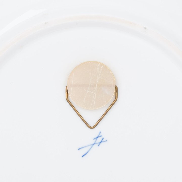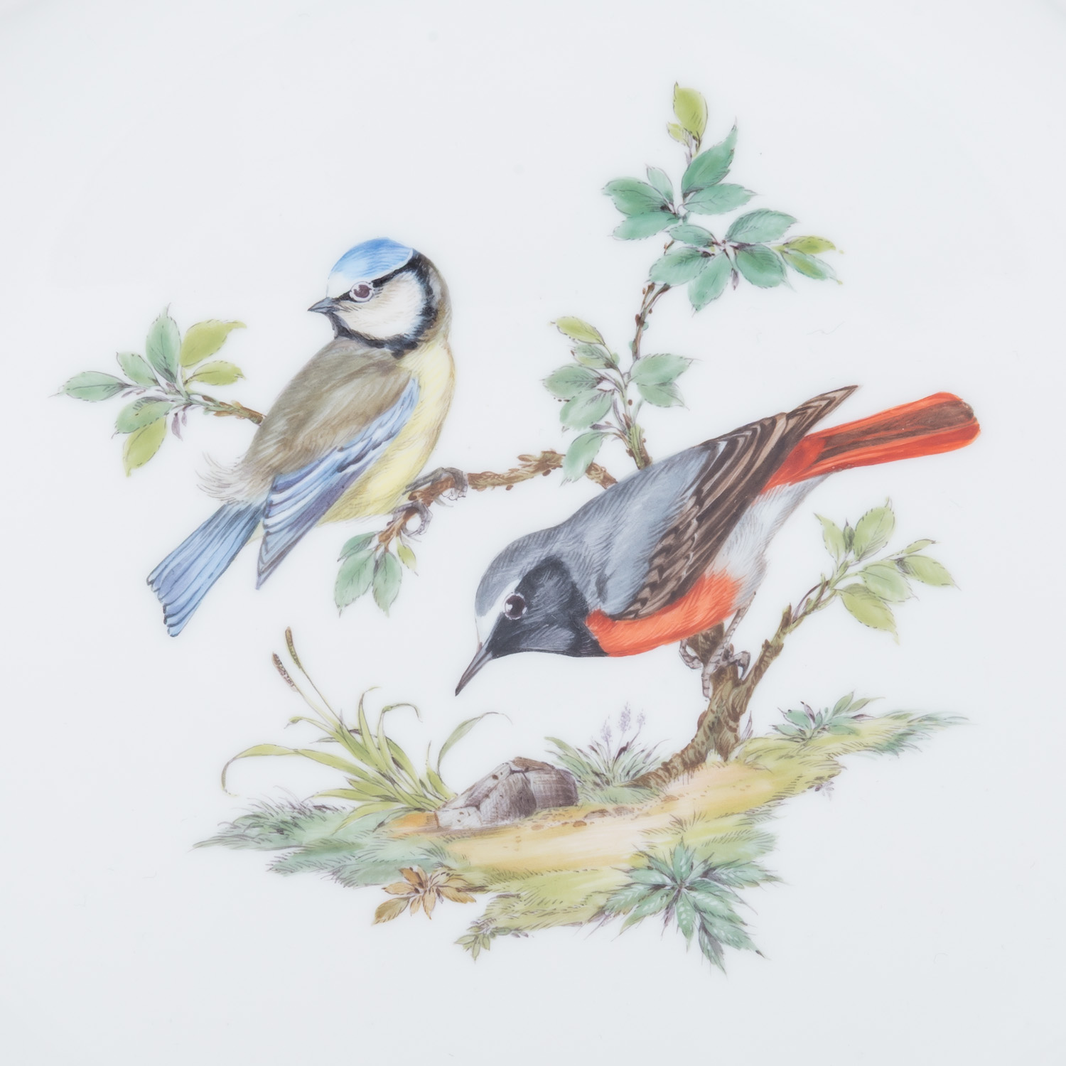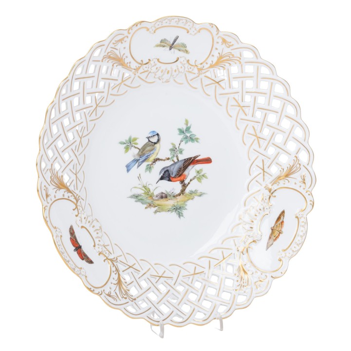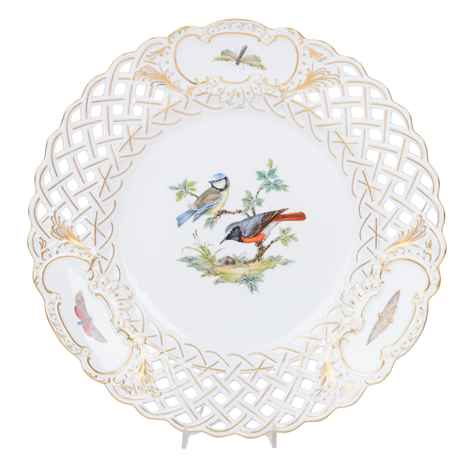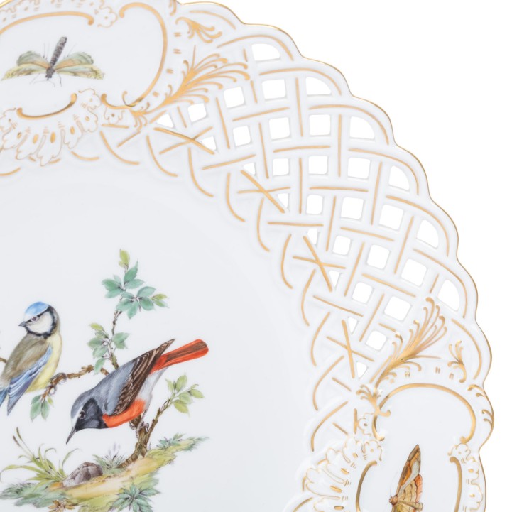 Weißporzellan mit durchbrochen gearbeitetem Rand und Goldstaffage, Randkartuschen mit gemalten Faltern, im Spiegel sind eine Kohlmeise und ein Gartenrotschwanz auf einem Zweig, D. ca. 28,5 cm.