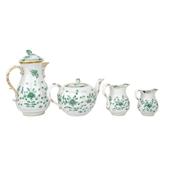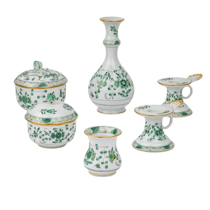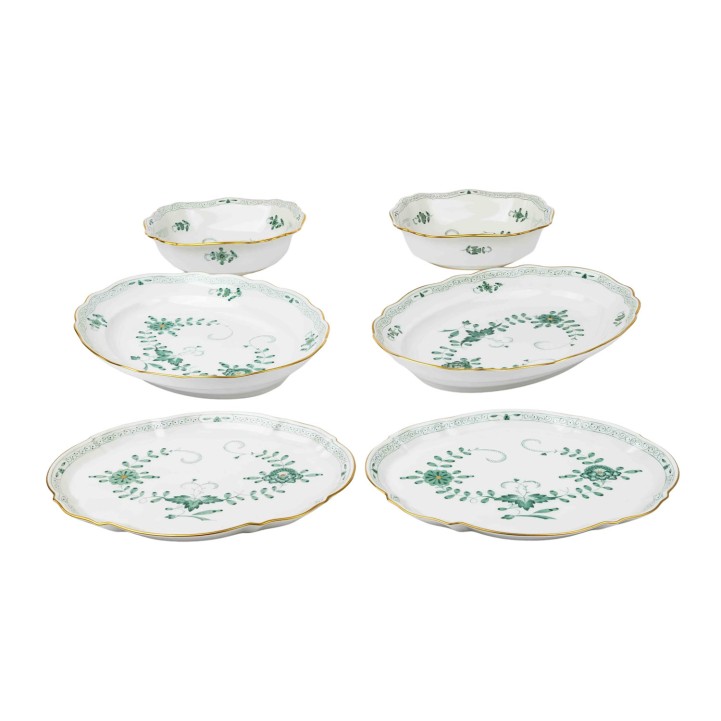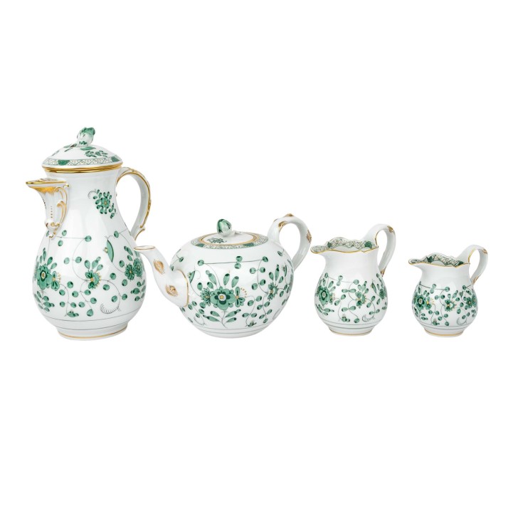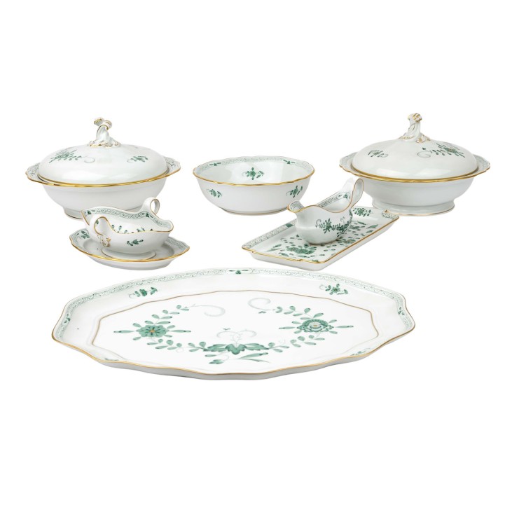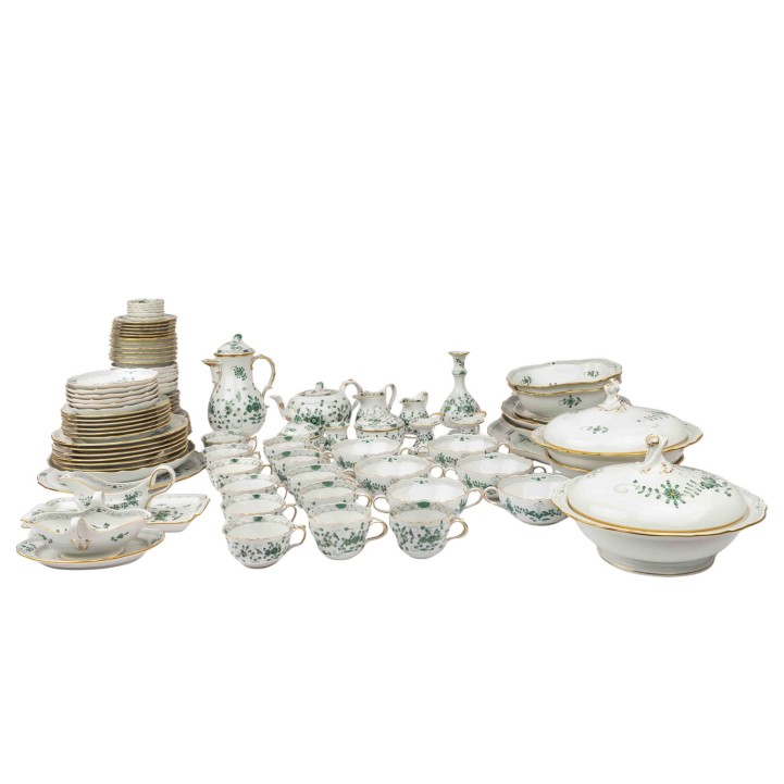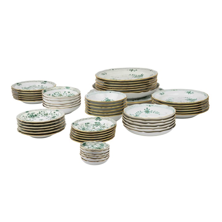 Porzellan, teils I. und II. Wahl. Grün und gold staffiert. Blaue Schwertermarken, teils mit Pressnummern. Umfangreiches Service bestehend aus: