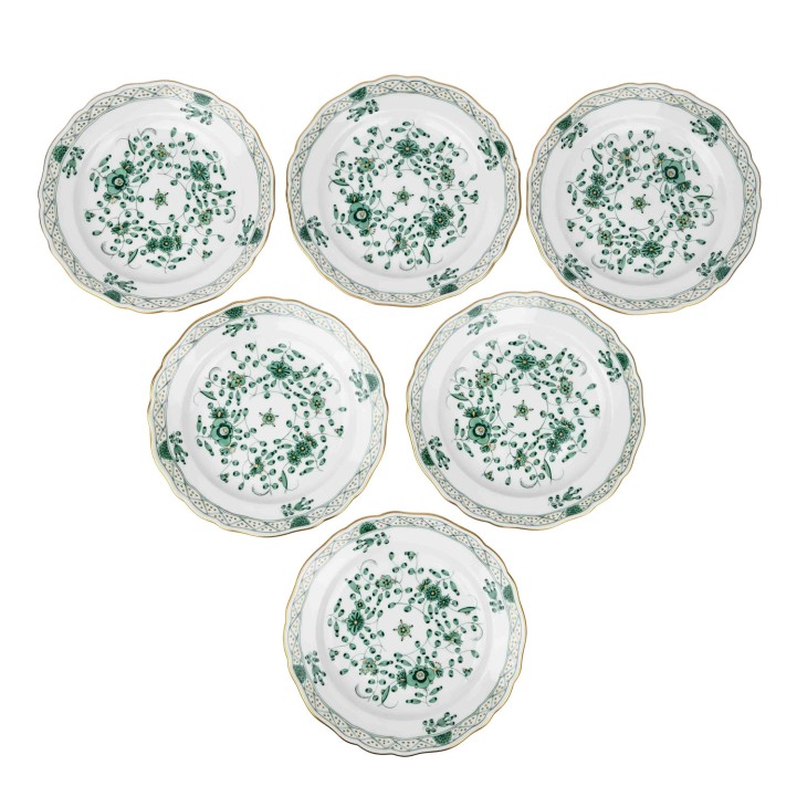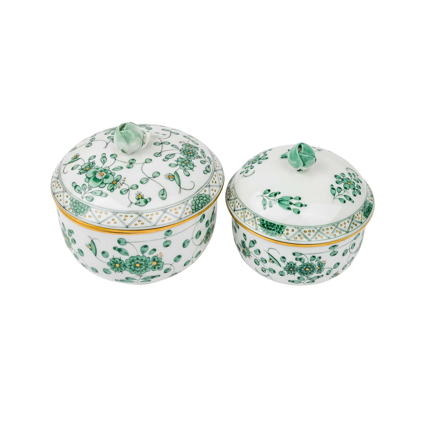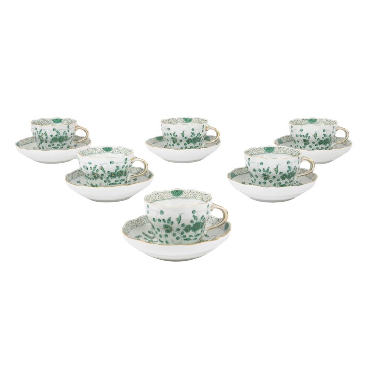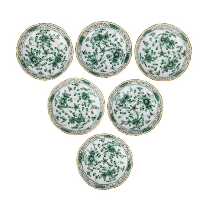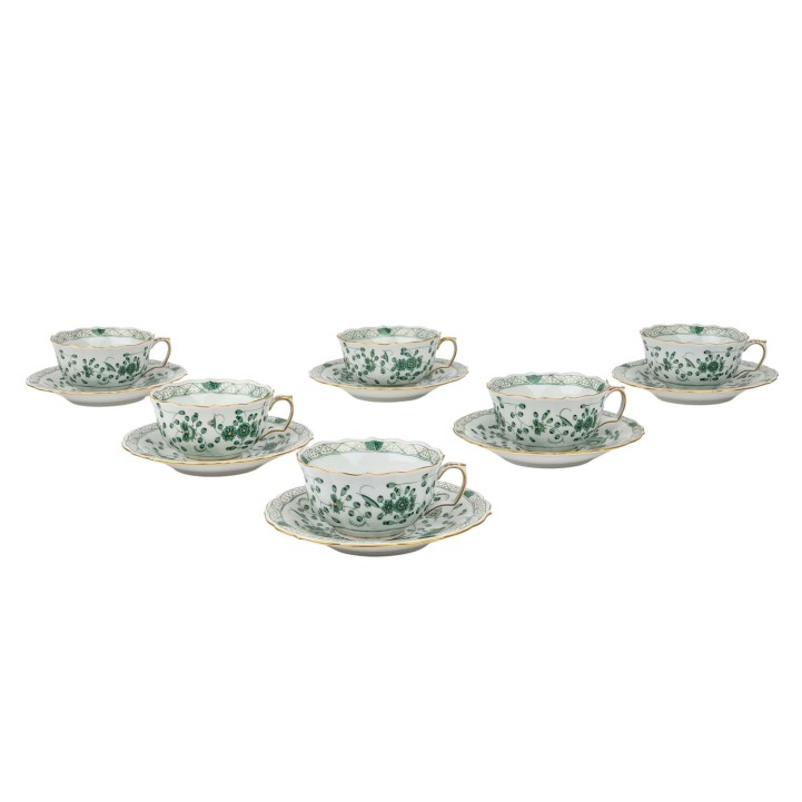 Porzellan, teils I. und II. Wahl. Grün und gold staffiert. Blaue Schwertermarken, teils mit Pressnummern. Umfangreiches Service bestehend aus: