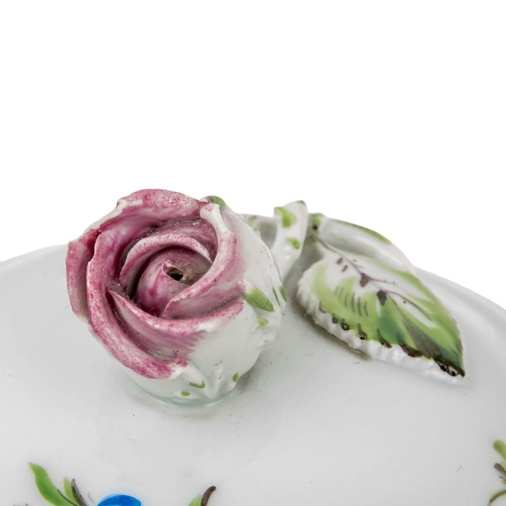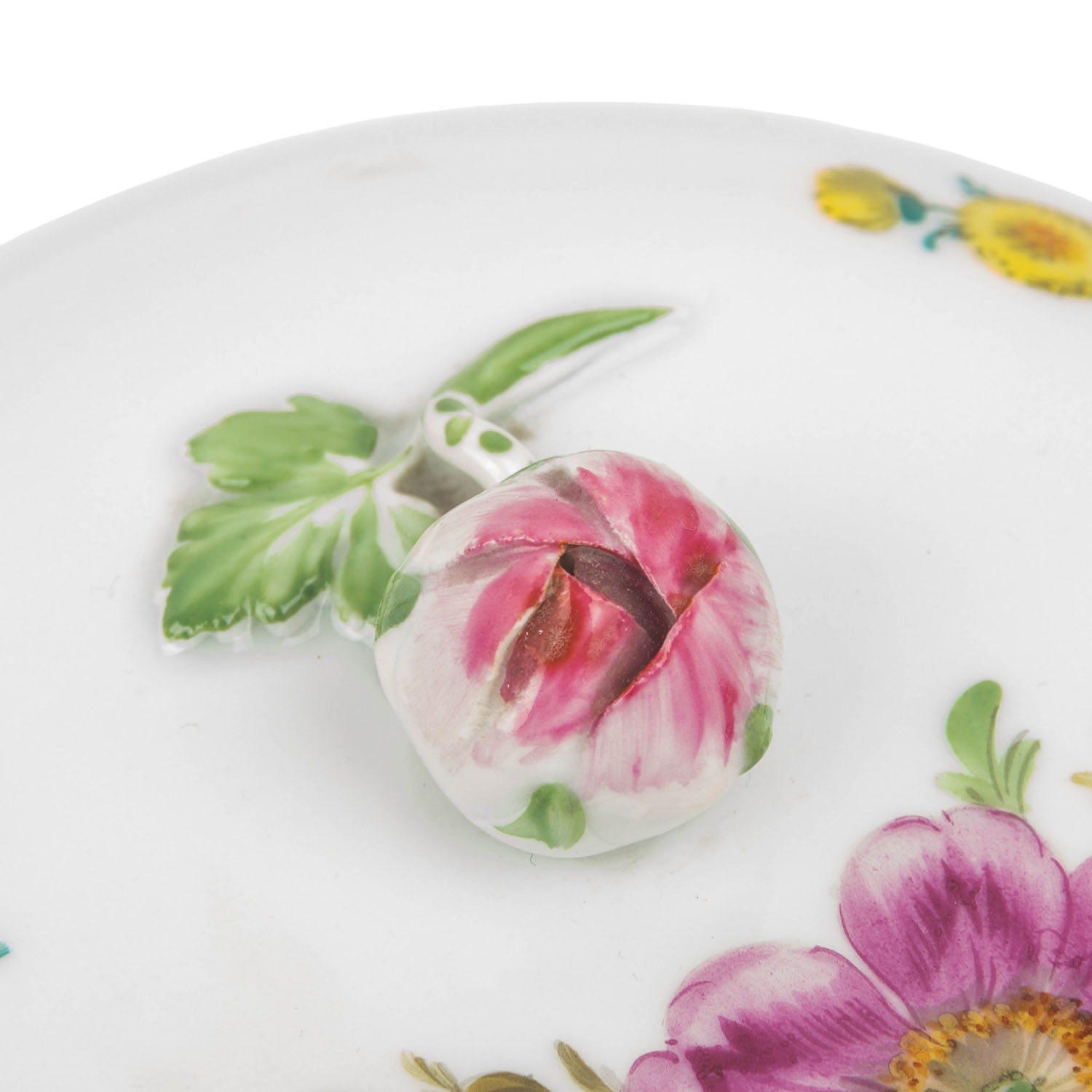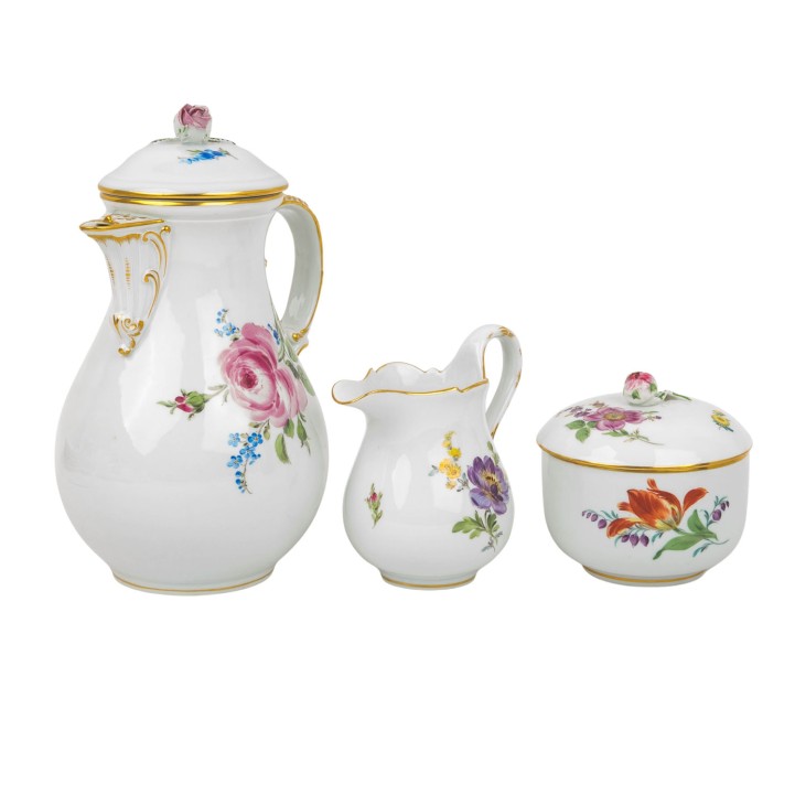 21.-tlg, Form 'Neuer Ausschnitt', Dekor 'Deutsche Blume', bestehend aus Kaffeekanne (Deckelröschen min. besch.), 6 Tassen (1 x am Rand besch.) mit Unterteller, 6 Kuchenteller, (4 x D 17, 5 u. 2 x 18 cm) 1 großer Milchgießer, H 13 cm und 1 große Zuckerdose, D 10, 5 cm, 2 Gedecke 2. Wahl und nach 1934, restliche Teile 1. Wahl.