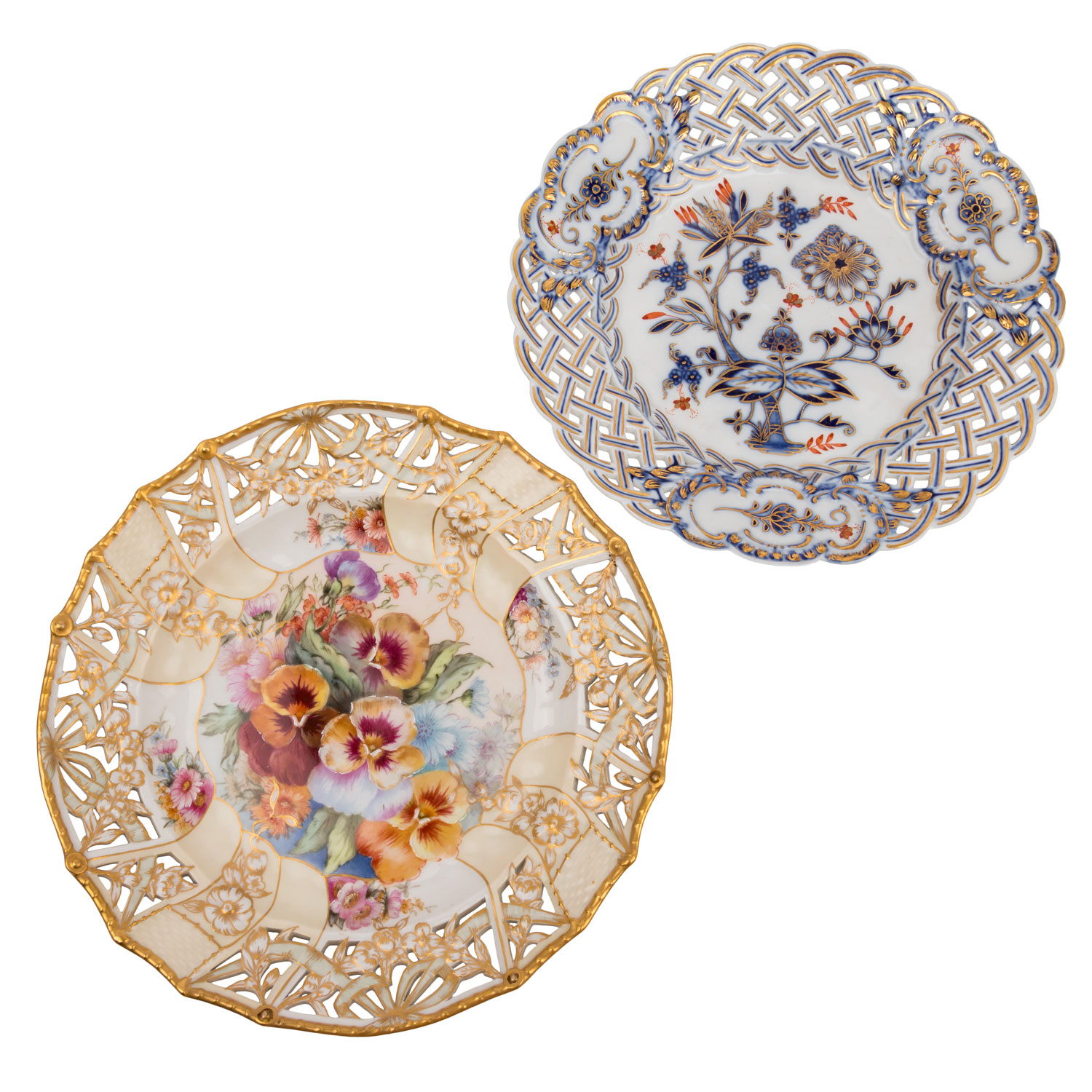 MEISSEN Durchbruchteller 'Zwiebelmuster mit Eisenrot und Gold', 2. Wahl, vor 1888, D. ca. 20,5 cm; KPM Durchbruchteller mit polychromer Blumenmalerei und reicher Goldstaffage, 20. Jh., D. ca. 21,5. Alters- und Gebrauchsspuren.