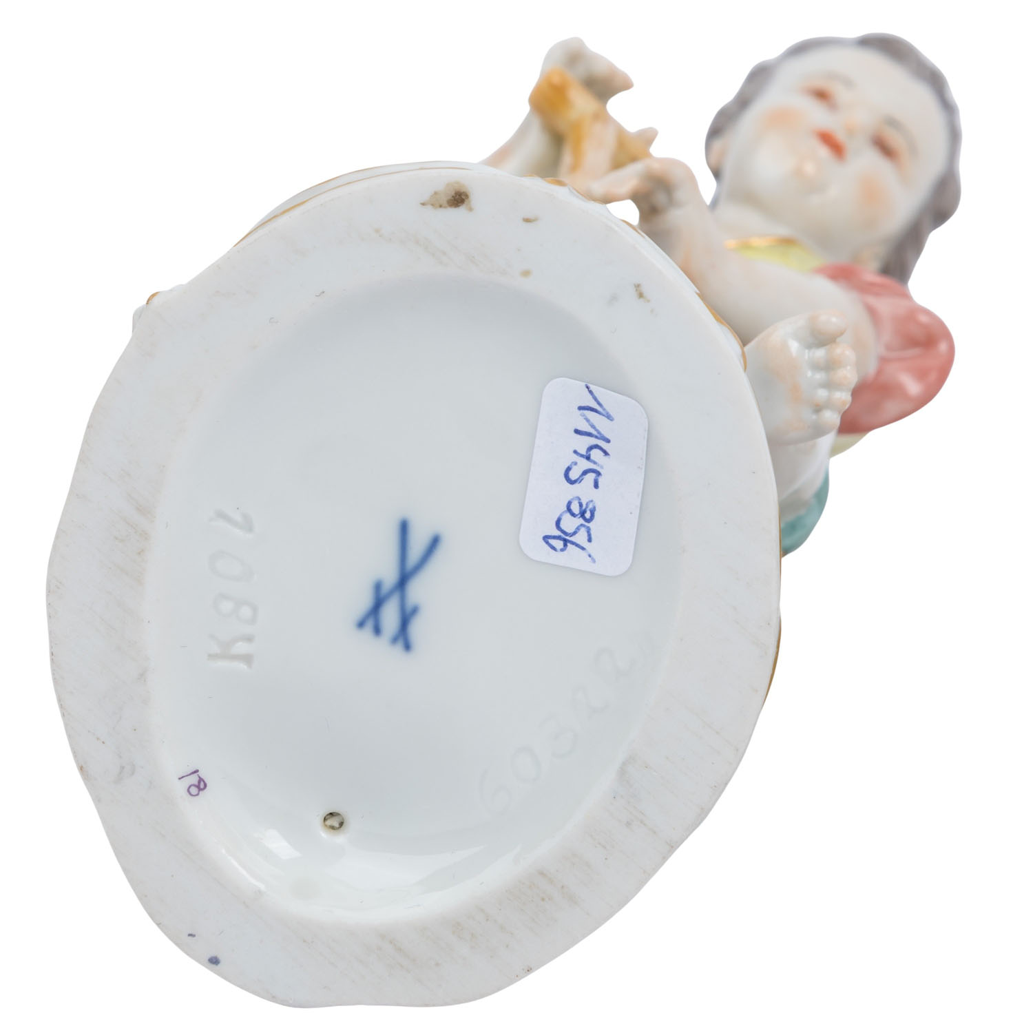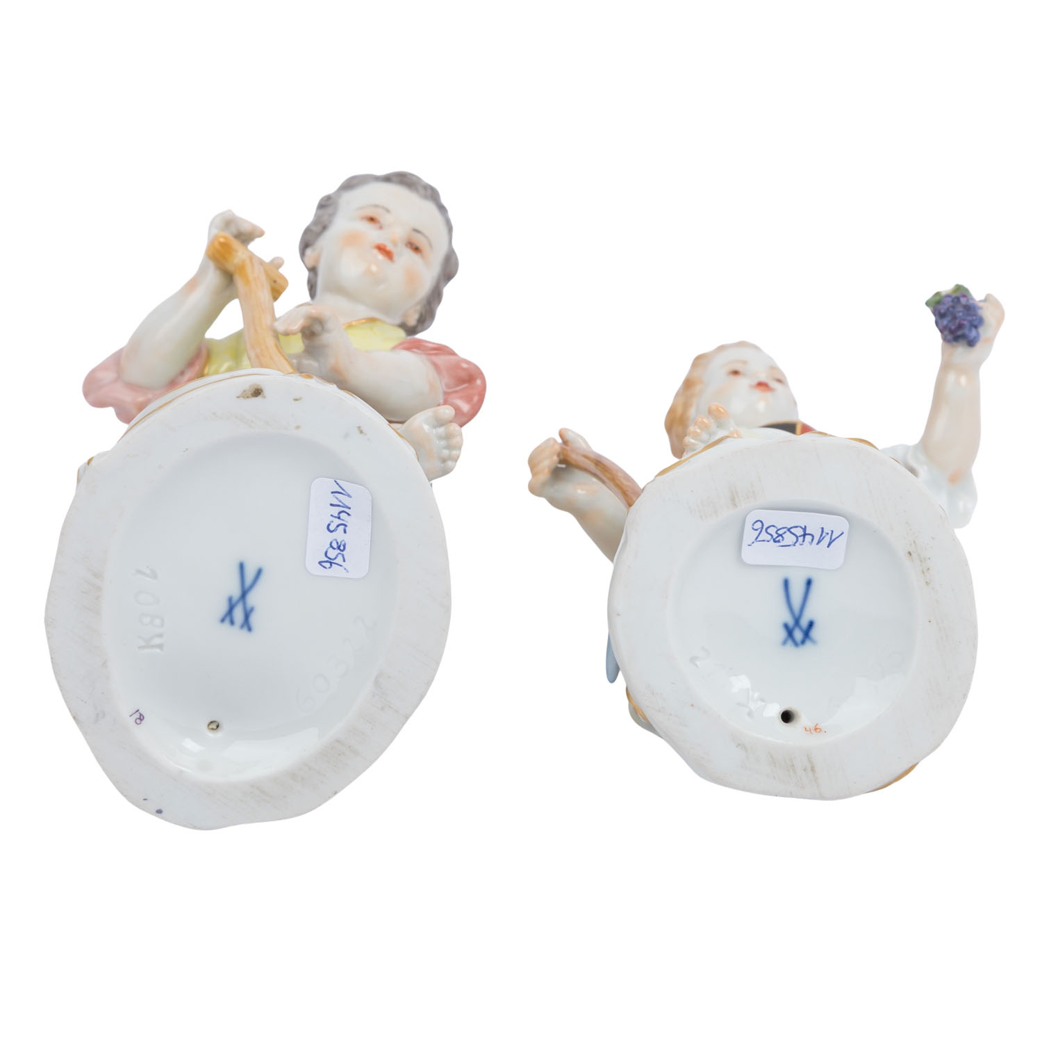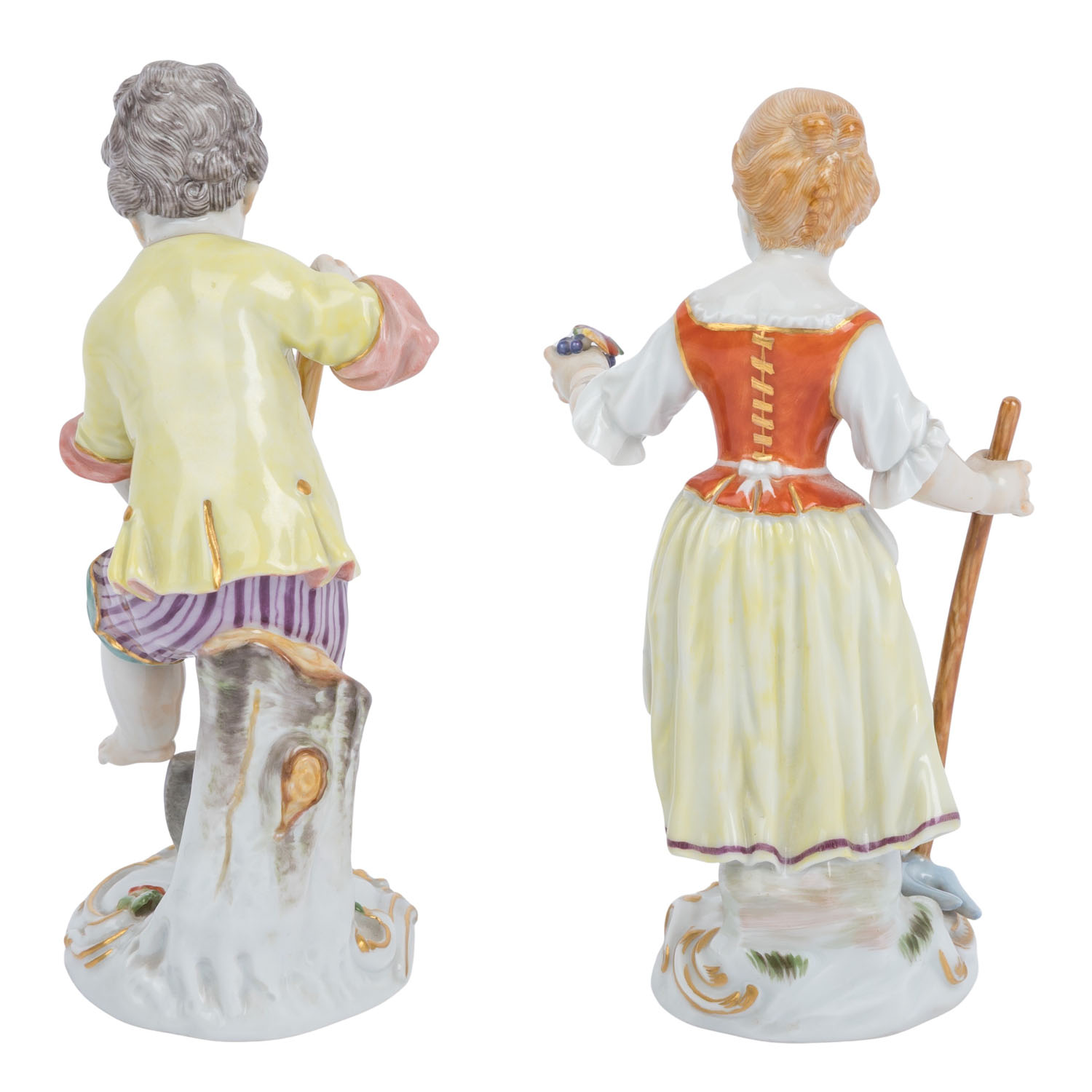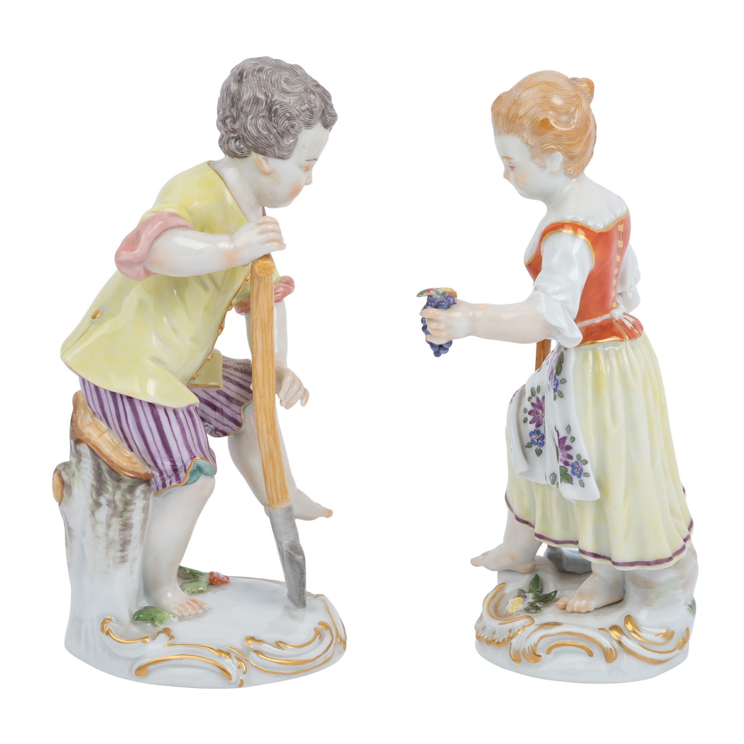 bestehend aus 'Mädchen mit Traube und Hacke', Modell-nr. 60325 und 'Gärtnerjunge mit Spaten', Modell-nr. 60322, beide entworfen von Johann Joachim Kaendler Mitte des 18. Jahrhunderts, polychrom staffiert, H je 13 cm. Gut erhalten mit leichten Altersspuren.