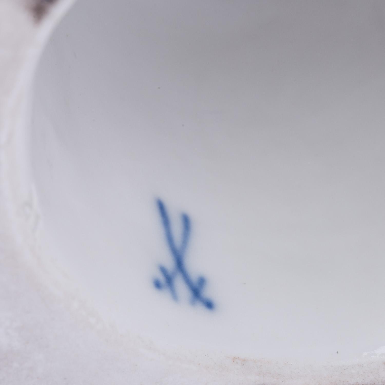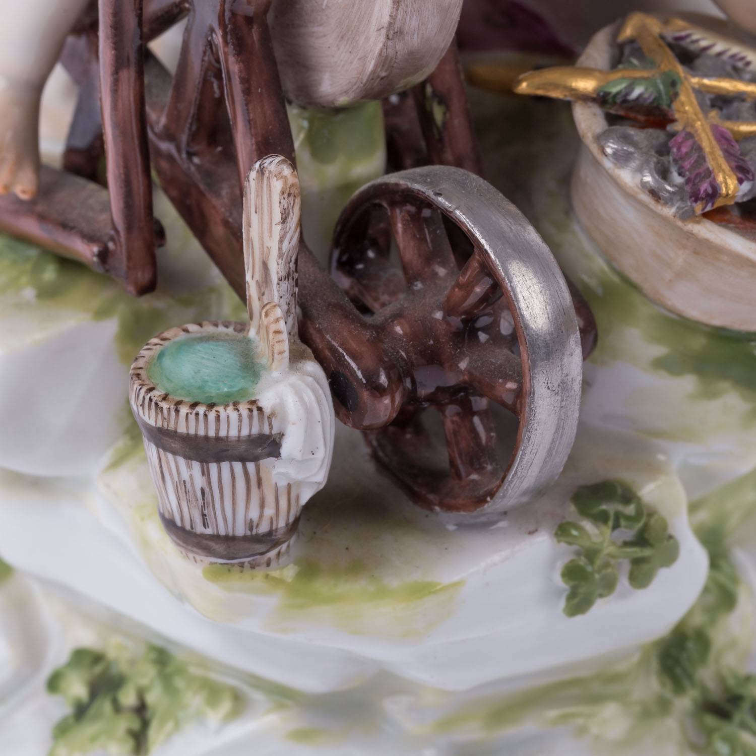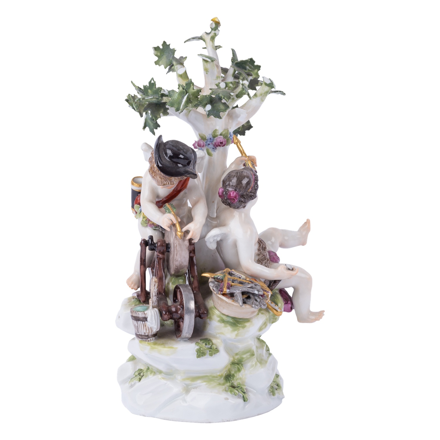 Ausführung vor 1924, ein Amorettenpaar beim Schleifen der Liebespfeile von Amor, naturalistischer Felssockelsockel, polychrom bemalt und part. goldfarben akzentuiert, unterseitig die Knaufschwertermarke sowie geritzte Modelnummer E 26. HxBxT: 19,5/12/10 cm. Altersspuren, Bestoßungen.