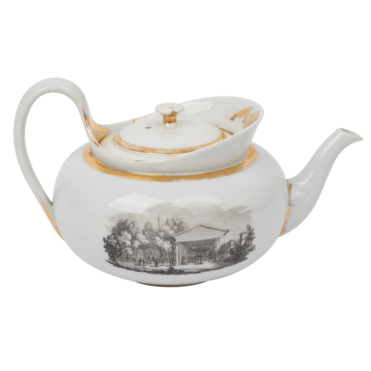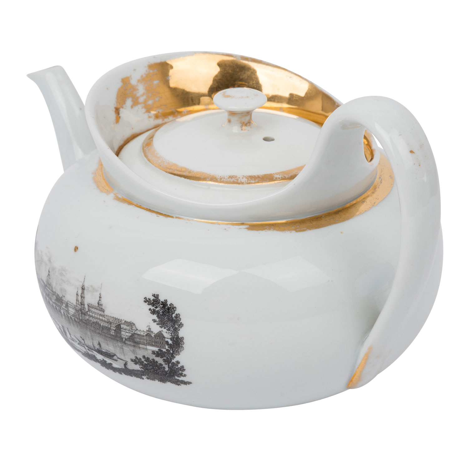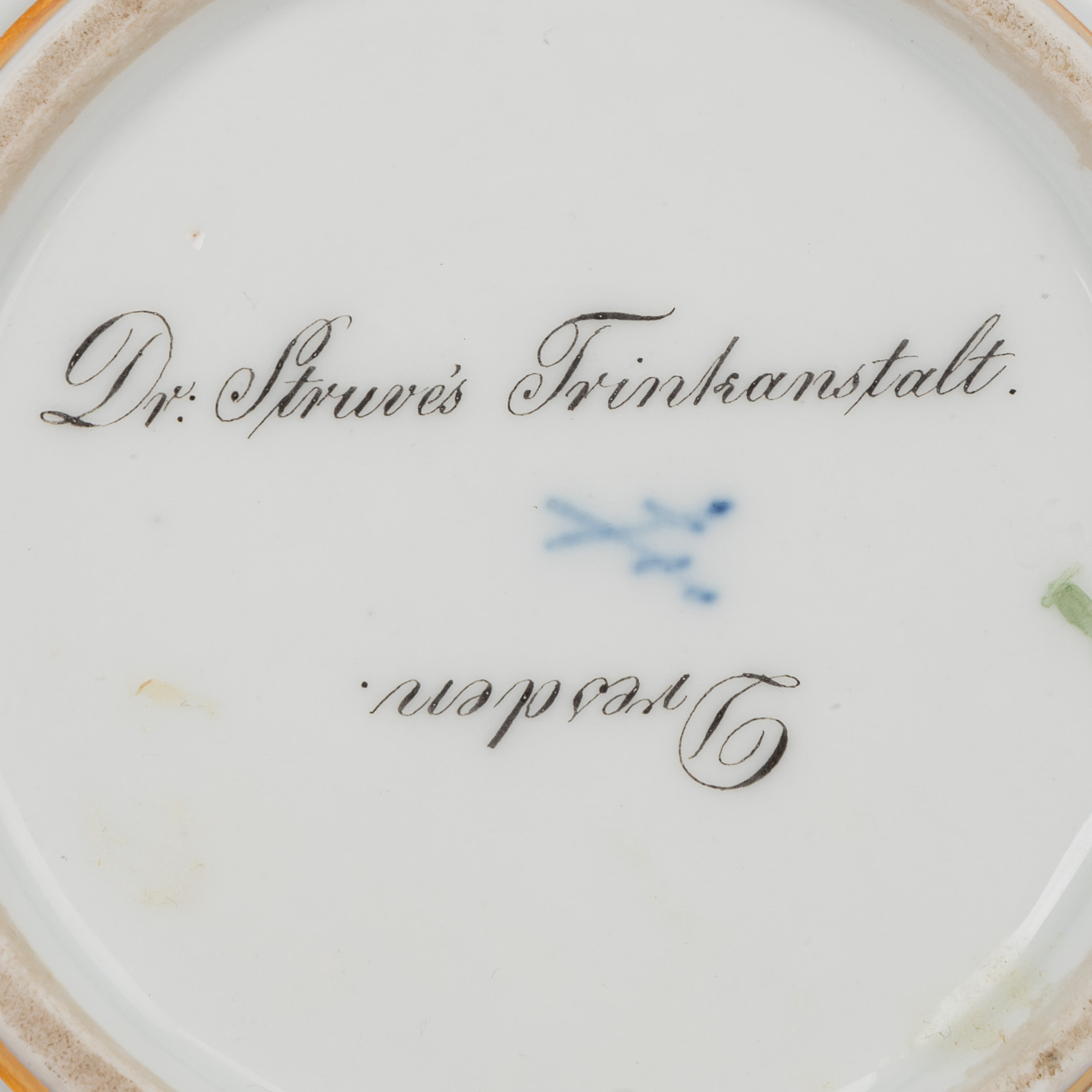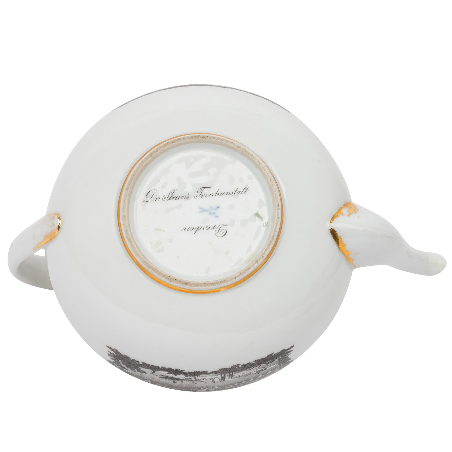 Porzellan, Kartuschen mit Landschaft und Figurenstaffage in Grisaille-Malerei, bez. 'Dresden-Dr. Strurés Trinkanstalt', H: 14 cm. Altersspuren, teilw. best.