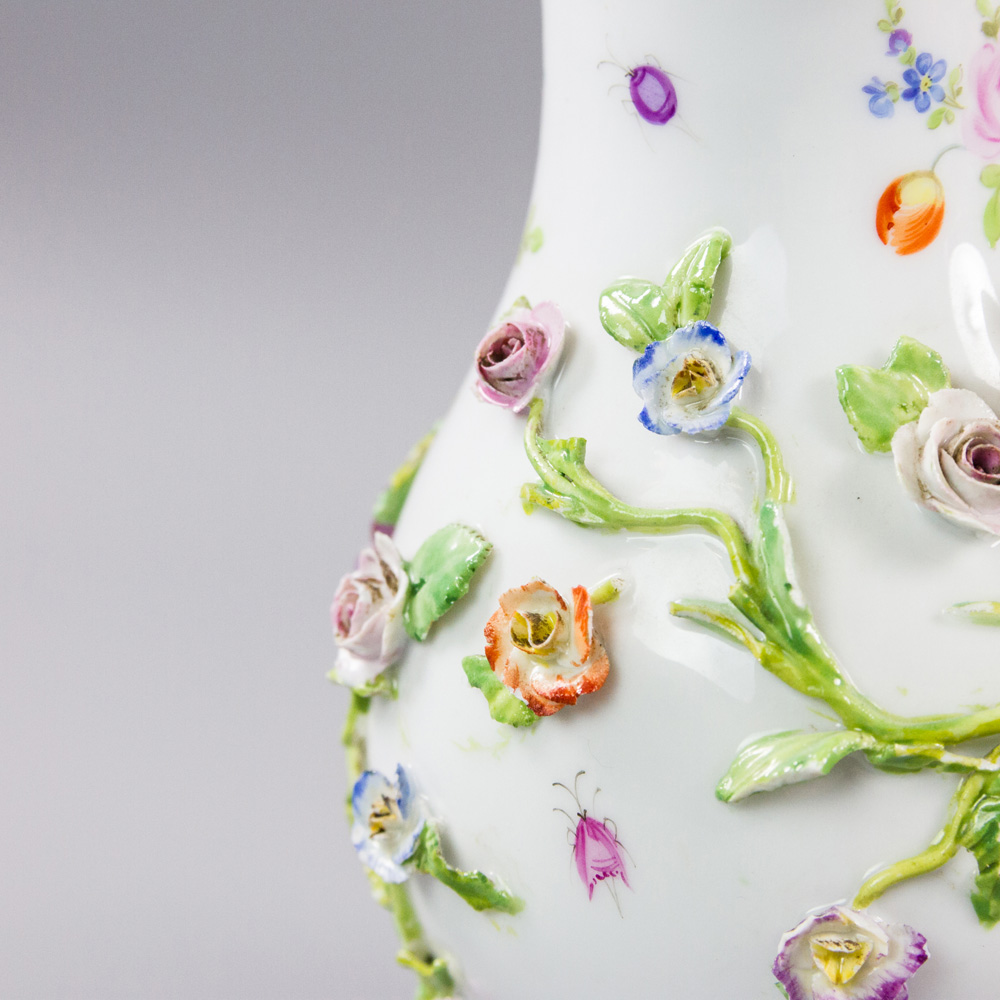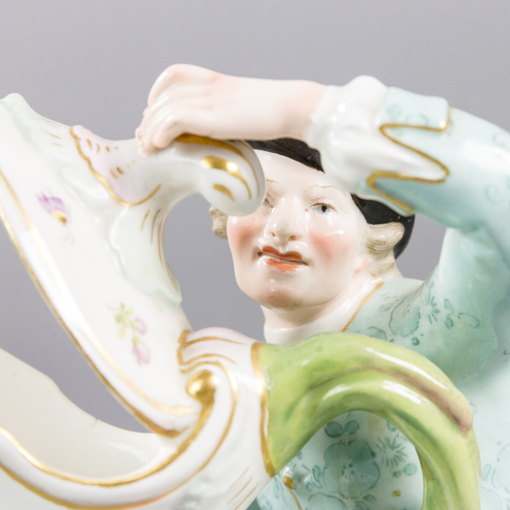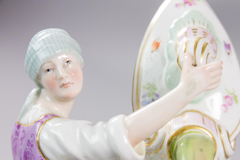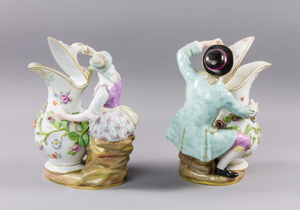 polychrom staffiert und ziervergoldet. Essig- und Ölkannen mit plastisch aufgelegten Blütenzweigen, polychrome Malerei mit Blumen- und Insektendekor. Beide Figuren den Deckel der Kannen öffnend. Unterglasurblaue Schwertermarke, Modell-Nrn. 1234 und 907, l. besch., rest., H. ca. 17/18 cm