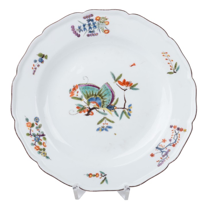 Teller mit feiner Malerei eines bunten chinesischen Schmetterlings auf einem Blütenzweig, mit brauner Randbemalung, unterseitig Schwertermarke, an der Innenseite des Standrings Formermarke 'II' für Johann Gottlieb Geithner (1707-1761), D. ca. 23 cm. Alters- und Gebrauchsspuren, vgl. Rainer Rückert 'Biographische Daten der Meißener Manufakturisten des 18. Jahrhunderts', München 1990.