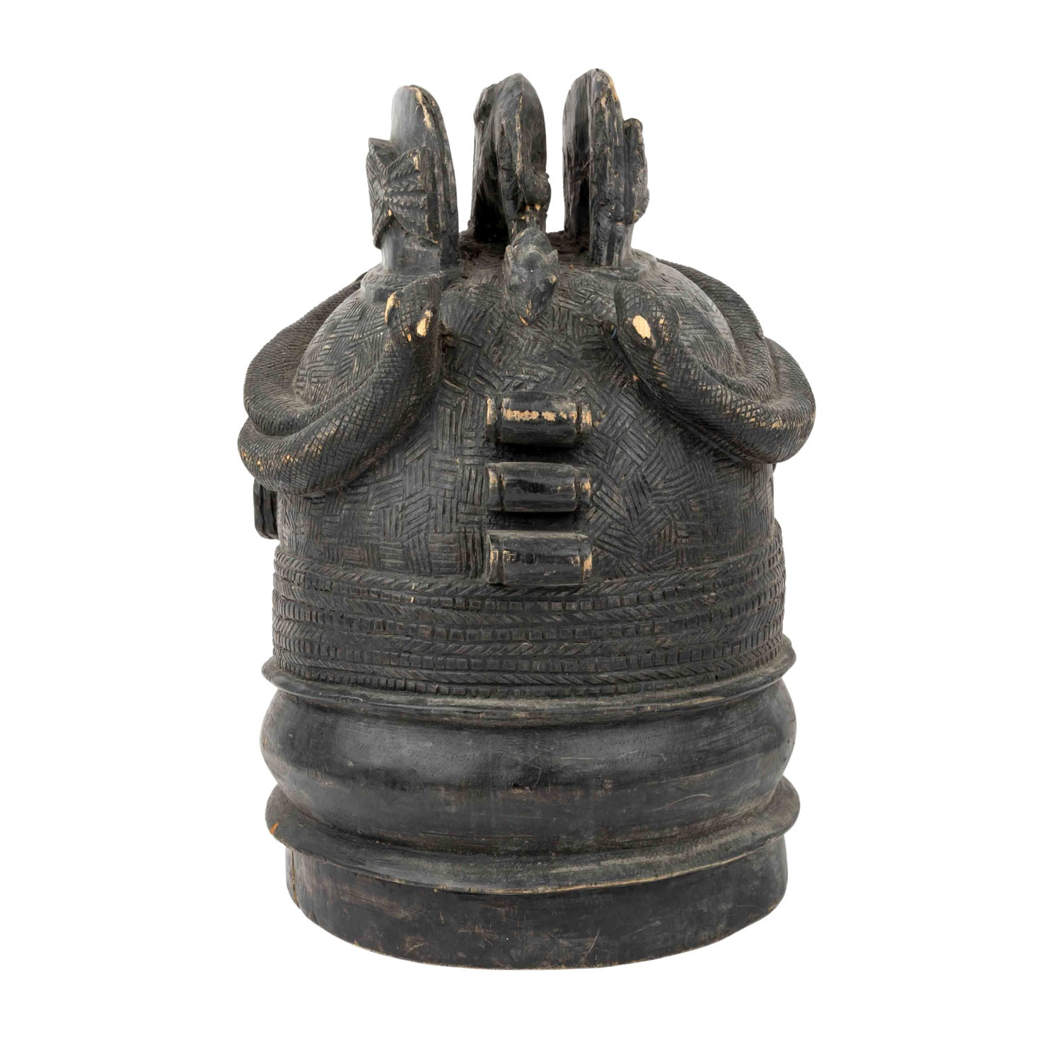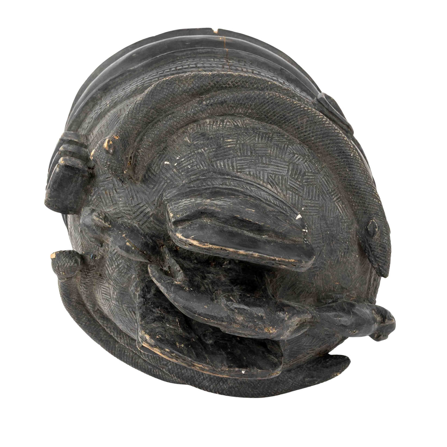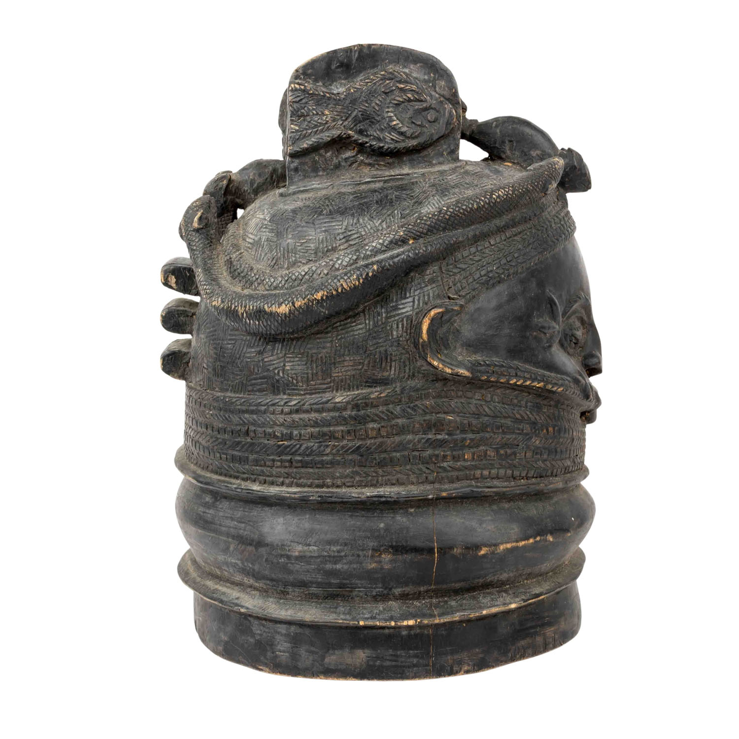 Tanzmaske der Mende, Sierra Leone Helmmaske, für rituelle Tanzaufführungen getragene Maske, Holz mit schwarzer Glanzpatina, H: 36 cm. Spannungsrisse alt, besch.,