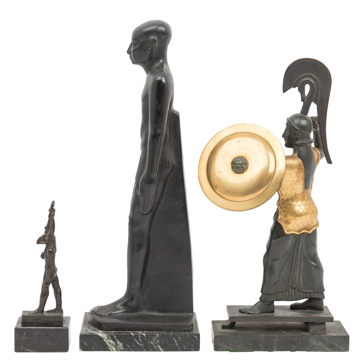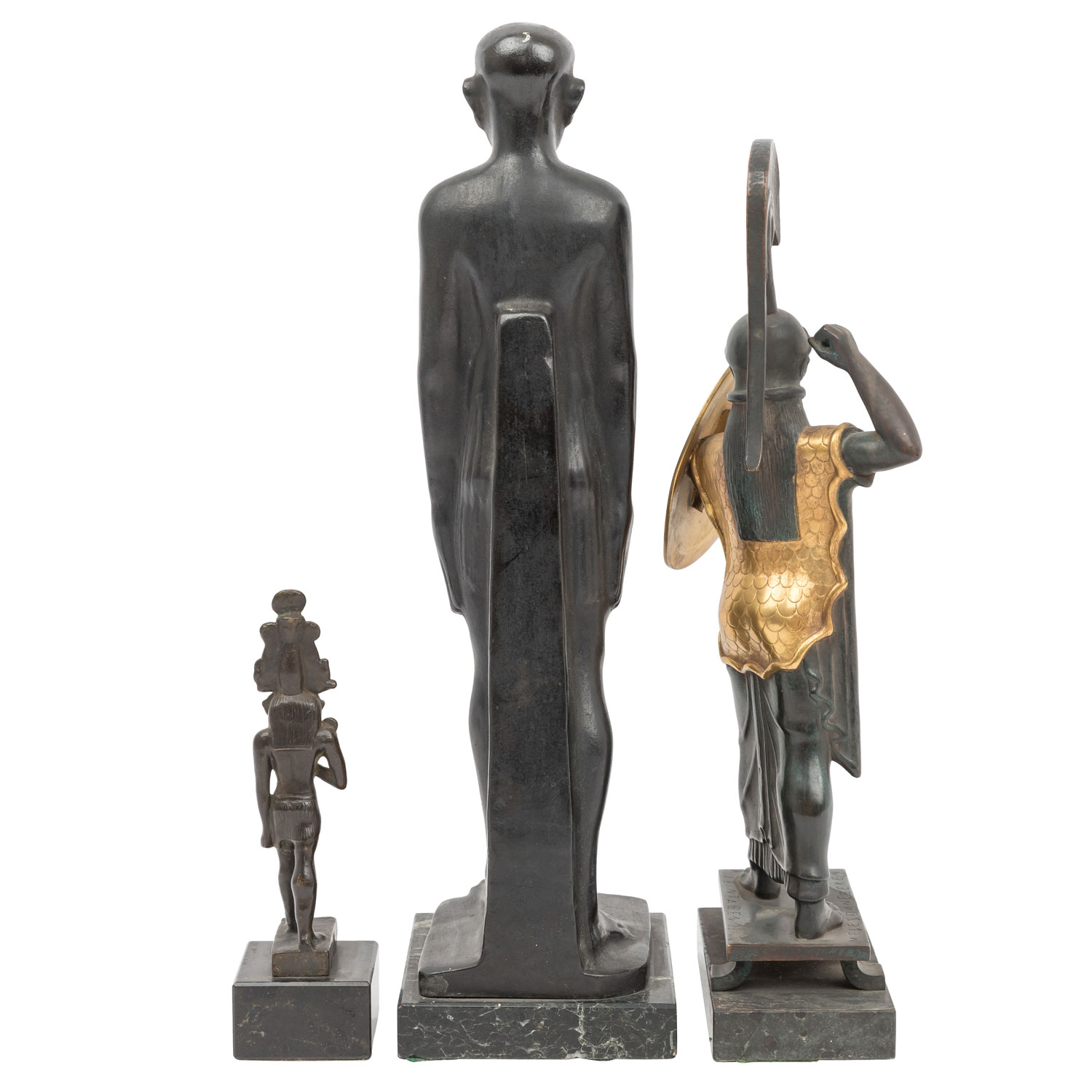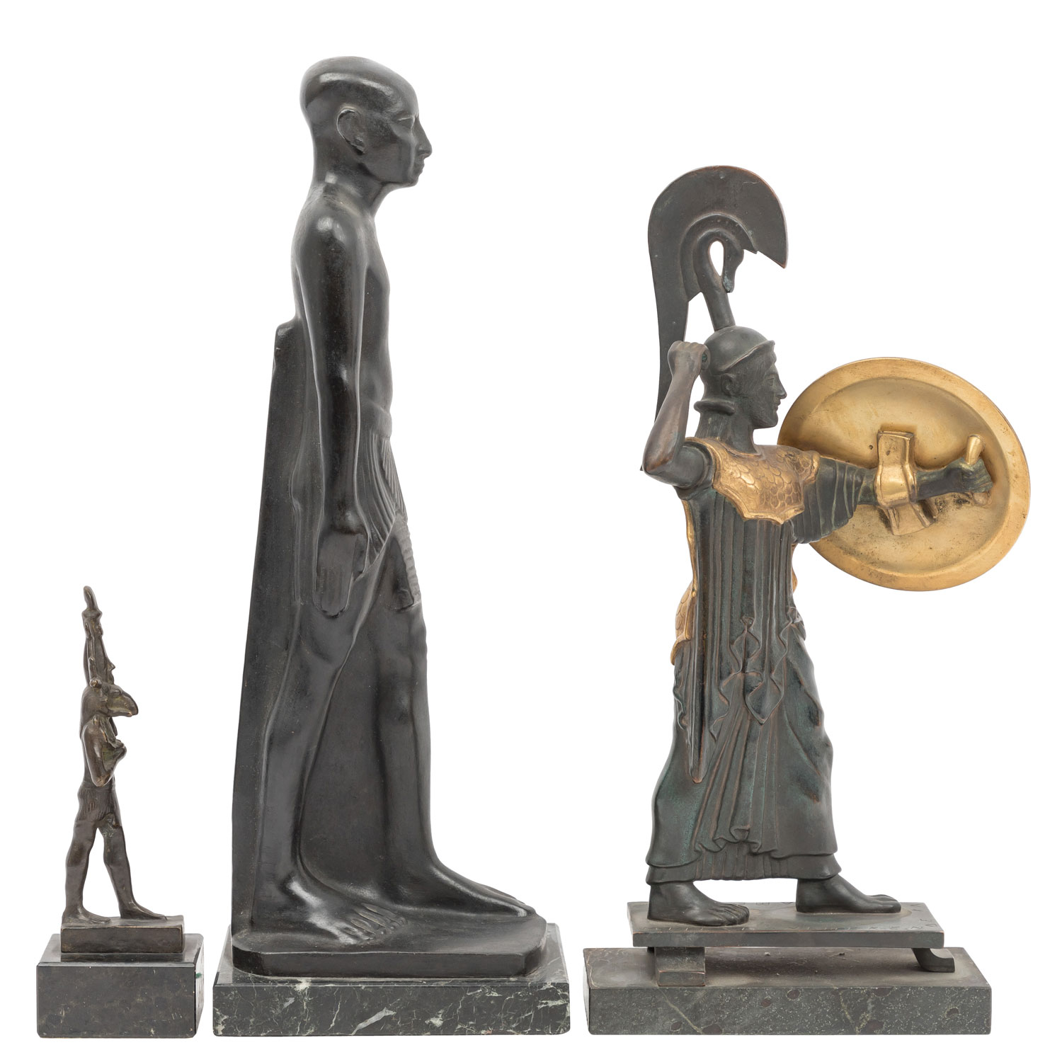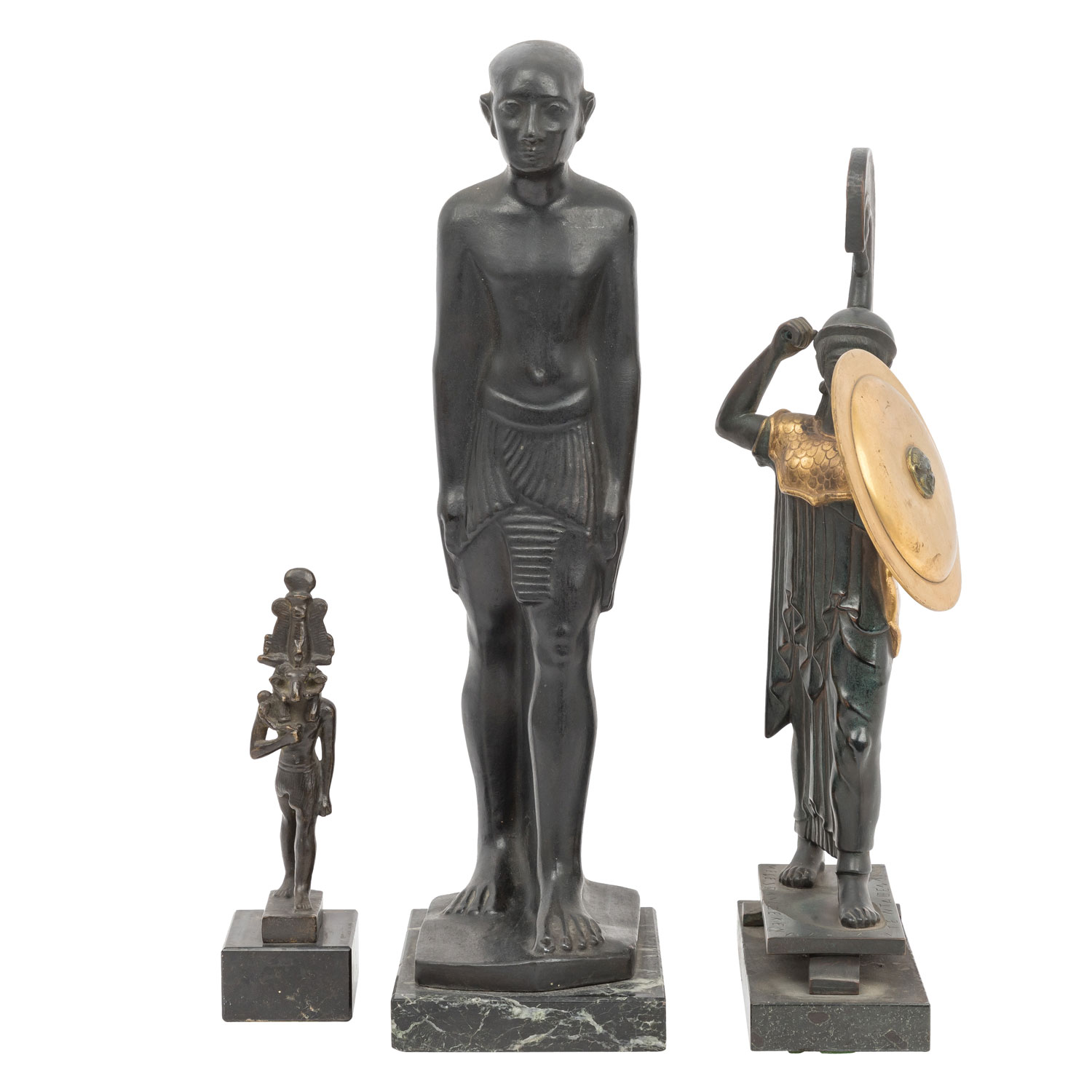 1x 'PALLAS ATHENA', mit erhobenem Schild schreitend, Metallguss, in Bronzeart bruniert und vergoldet, auf rechteckiger Plinthe im Guss bezeichnet, auf dunkel marmoriertem Steinsockel montiert, H: Figur, ca. 32 cm, gesamt ca. 34 cm; 1x 'KHNUM', widderköpfiger Gott, Bronze, dunkel patiniert, auf rechteckiger Plinthe, auf schwarz marmoriertem Steinsockel montiert, H: gesamt ca. 17 cm; 1x 'Stehender Pharao', Metallguss, schwarz patiniert, auf dunkel marmoriertem Steinsockel montiert, H: gesamt ca. 38,5 cm. Je Alters- und Beriebspuren, der Athene fehlt der Speer.