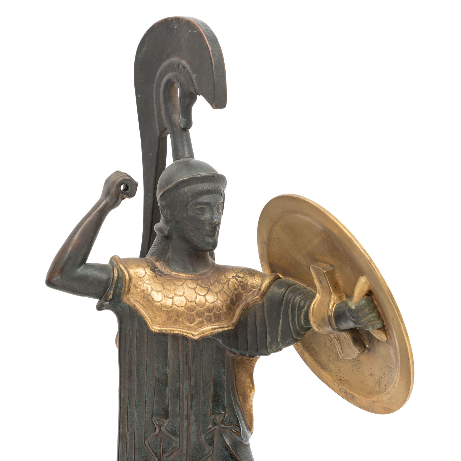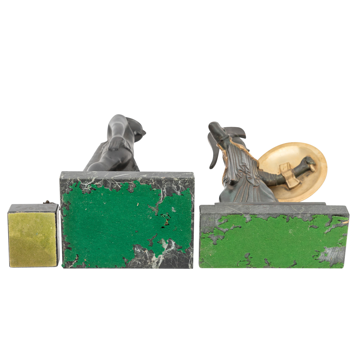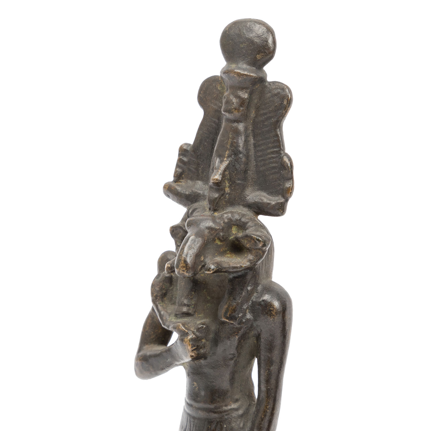 1x 'PALLAS ATHENA', mit erhobenem Schild schreitend, Metallguss, in Bronzeart bruniert und vergoldet, auf rechteckiger Plinthe im Guss bezeichnet, auf dunkel marmoriertem Steinsockel montiert, H: Figur, ca. 32 cm, gesamt ca. 34 cm; 1x 'KHNUM', widderköpfiger Gott, Bronze, dunkel patiniert, auf rechteckiger Plinthe, auf schwarz marmoriertem Steinsockel montiert, H: gesamt ca. 17 cm; 1x 'Stehender Pharao', Metallguss, schwarz patiniert, auf dunkel marmoriertem Steinsockel montiert, H: gesamt ca. 38,5 cm. Je Alters- und Beriebspuren, der Athene fehlt der Speer.