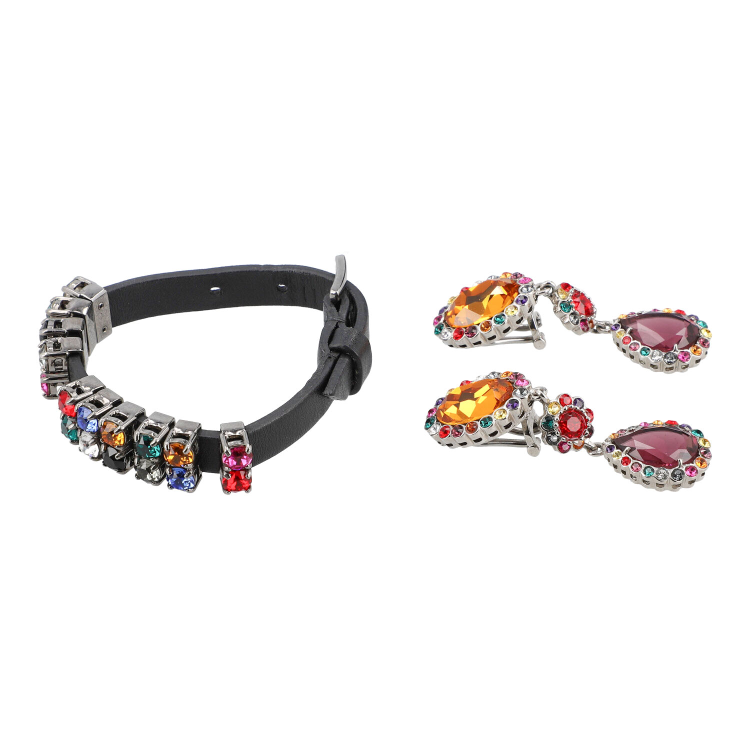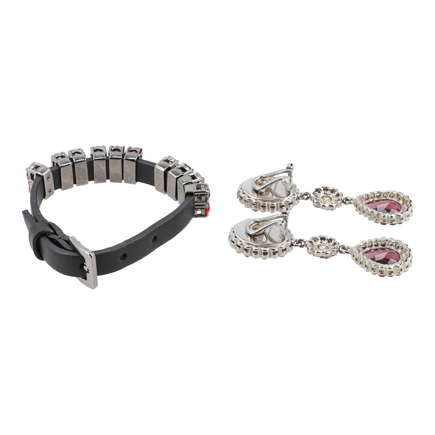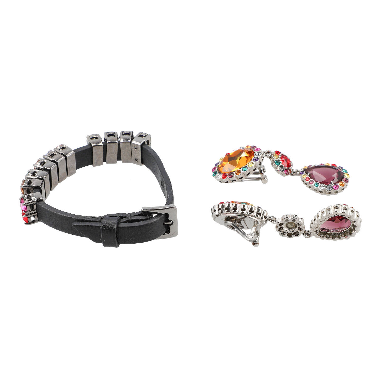 Armband (ca. 18 cm) und Ohrclips. Silberfarben mit mehrfarbigem Kunststeinbesatz. Gebrauchsspuren.
