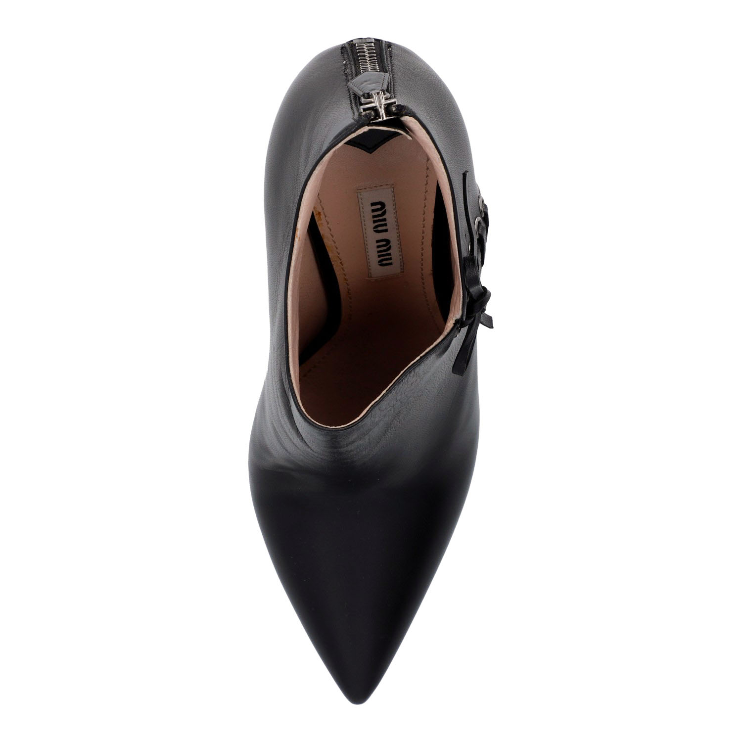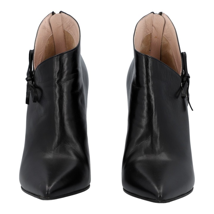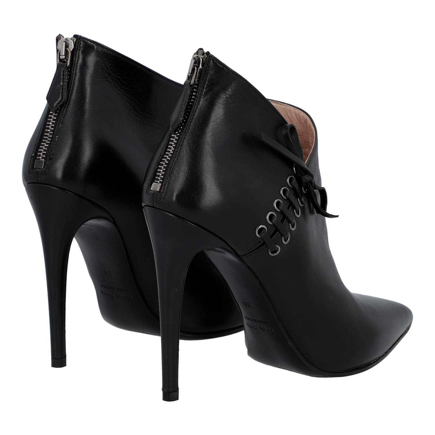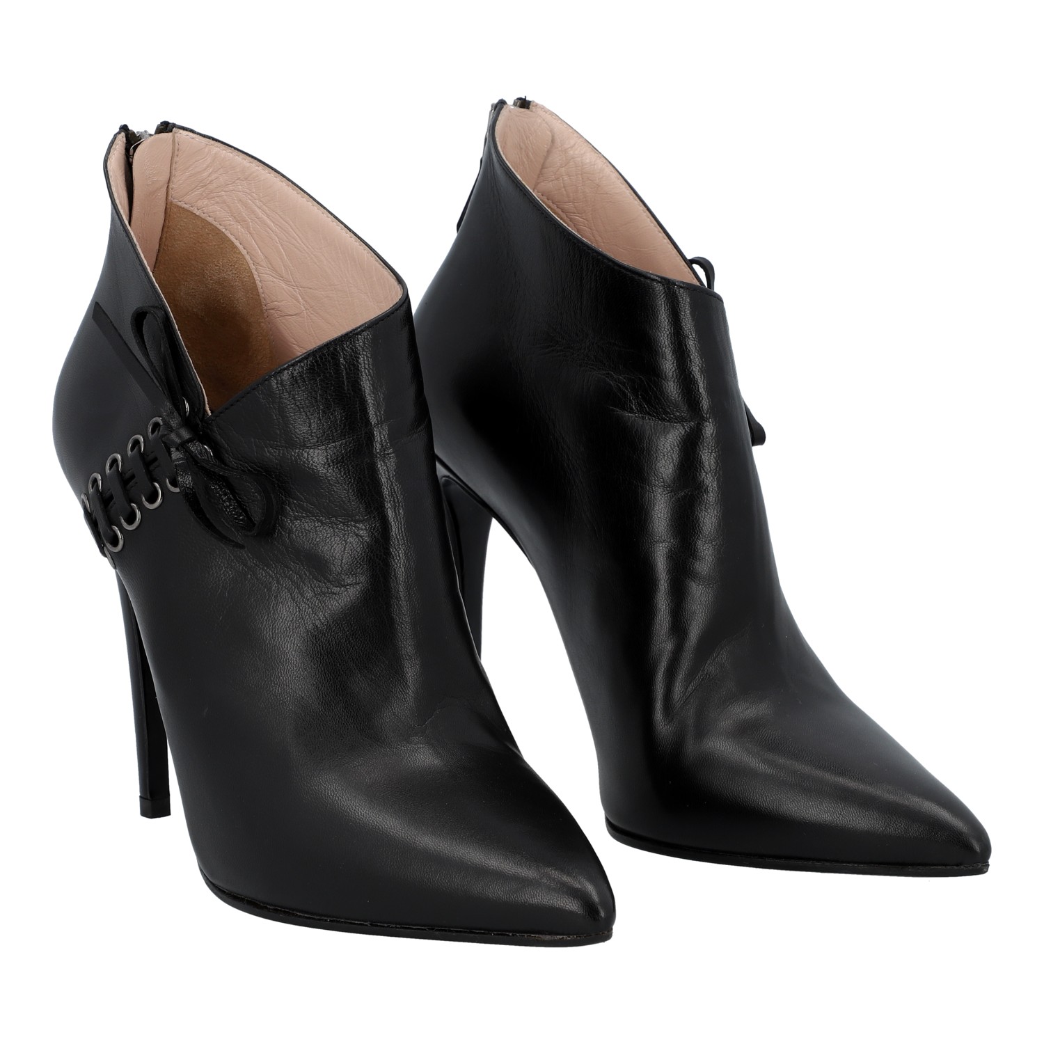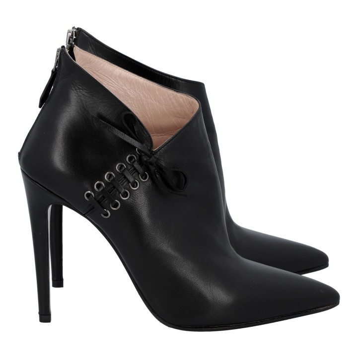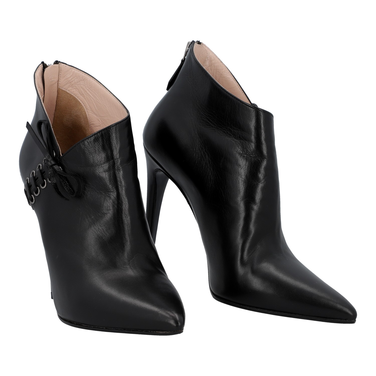 Aus fein genarbtem Leder in Schwarz mit dekorativer Schnürung und Schleifendetail. Spitze Schuhform, Pfennigabsatz mit einer Höhe von ca. 11cm. Box anbei, Liechte Tragespuren vorhanden.