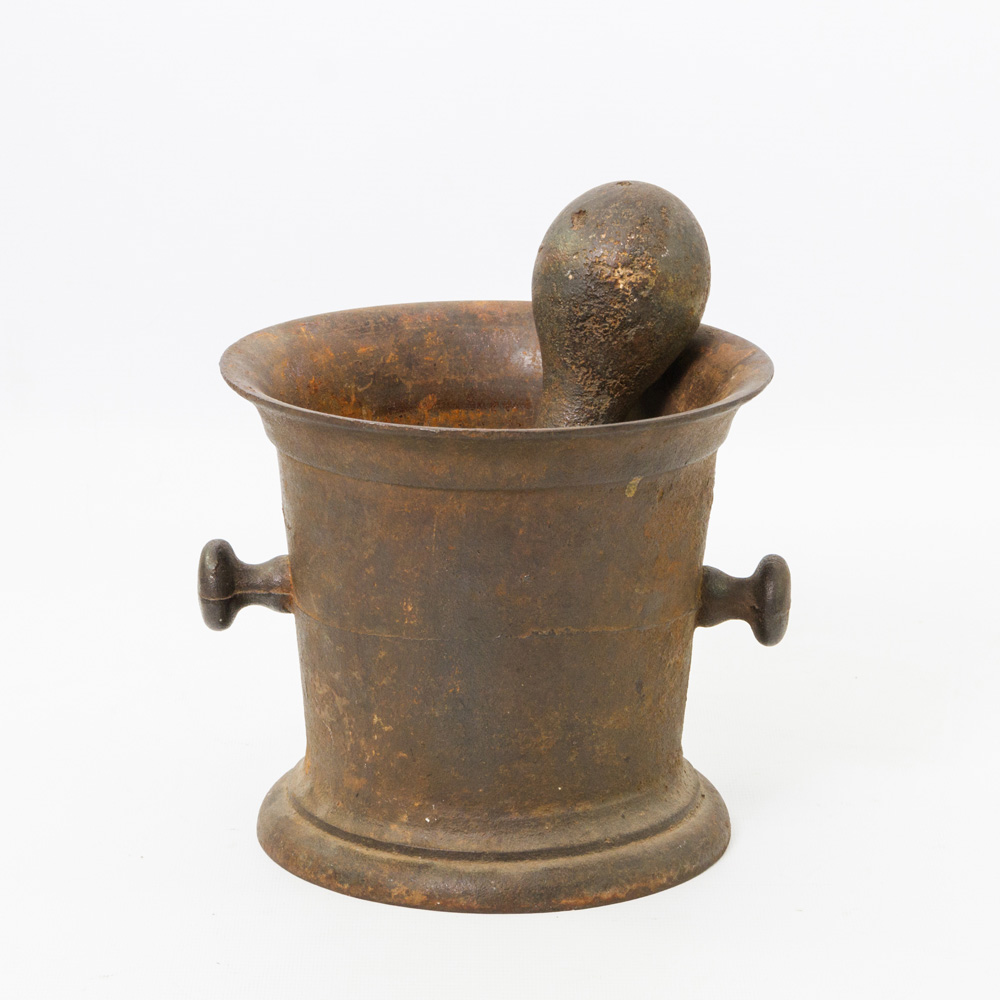 MÖRSER MIT PISTILL 18.Jh., Eisen, leicht abgesetzter Rundstand, Zylinderkorpus mit glockenförmig ausschwingender Mündung, seitlich 2 Bolzengriffe, dunkle, gewachsene Rostfarbenpatina, H: 18 cm. Alters-und Gebrauchsspuren.