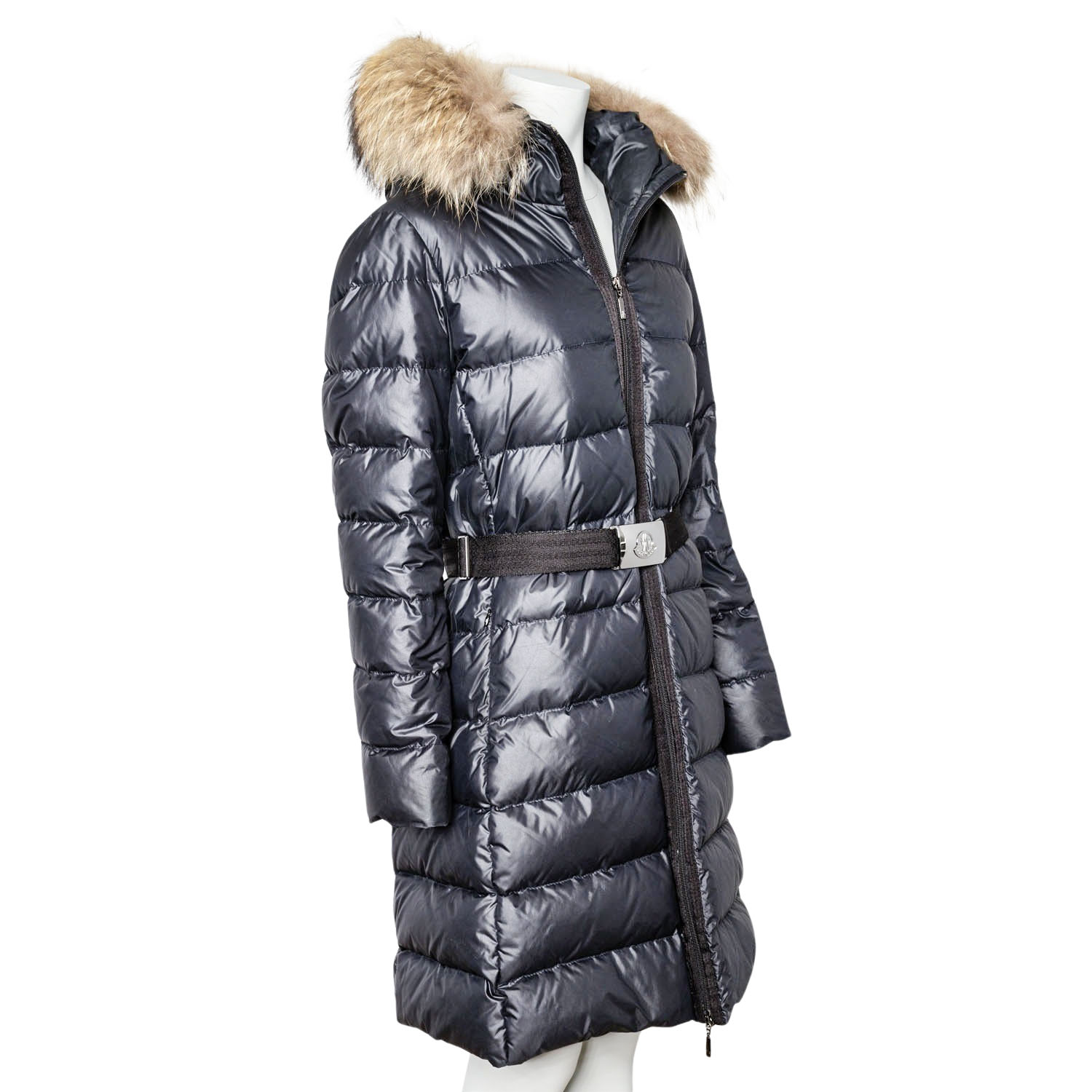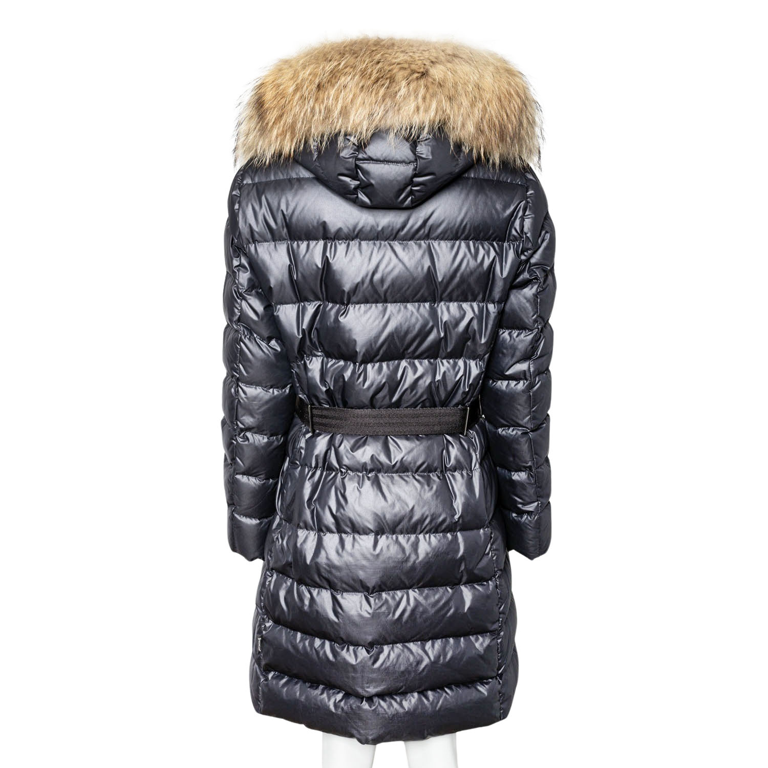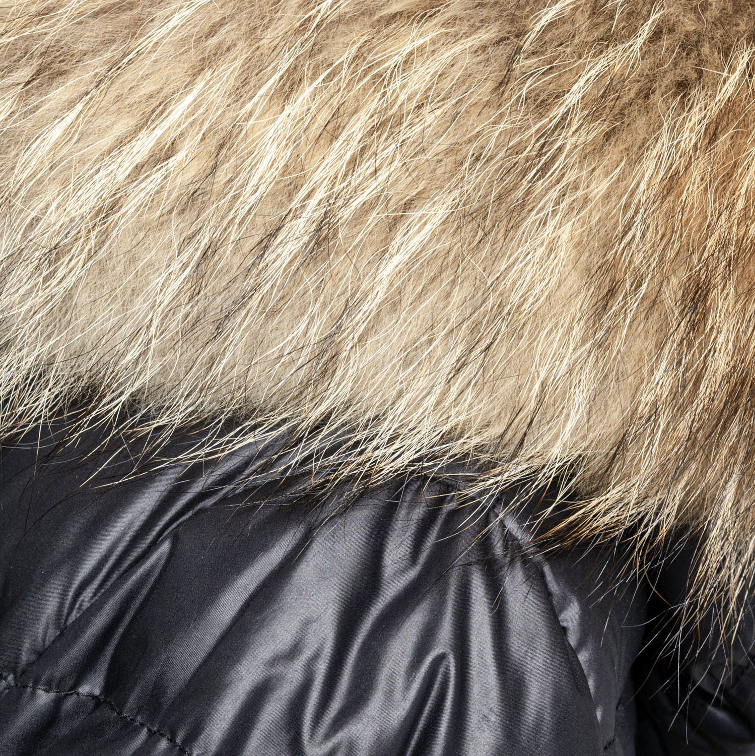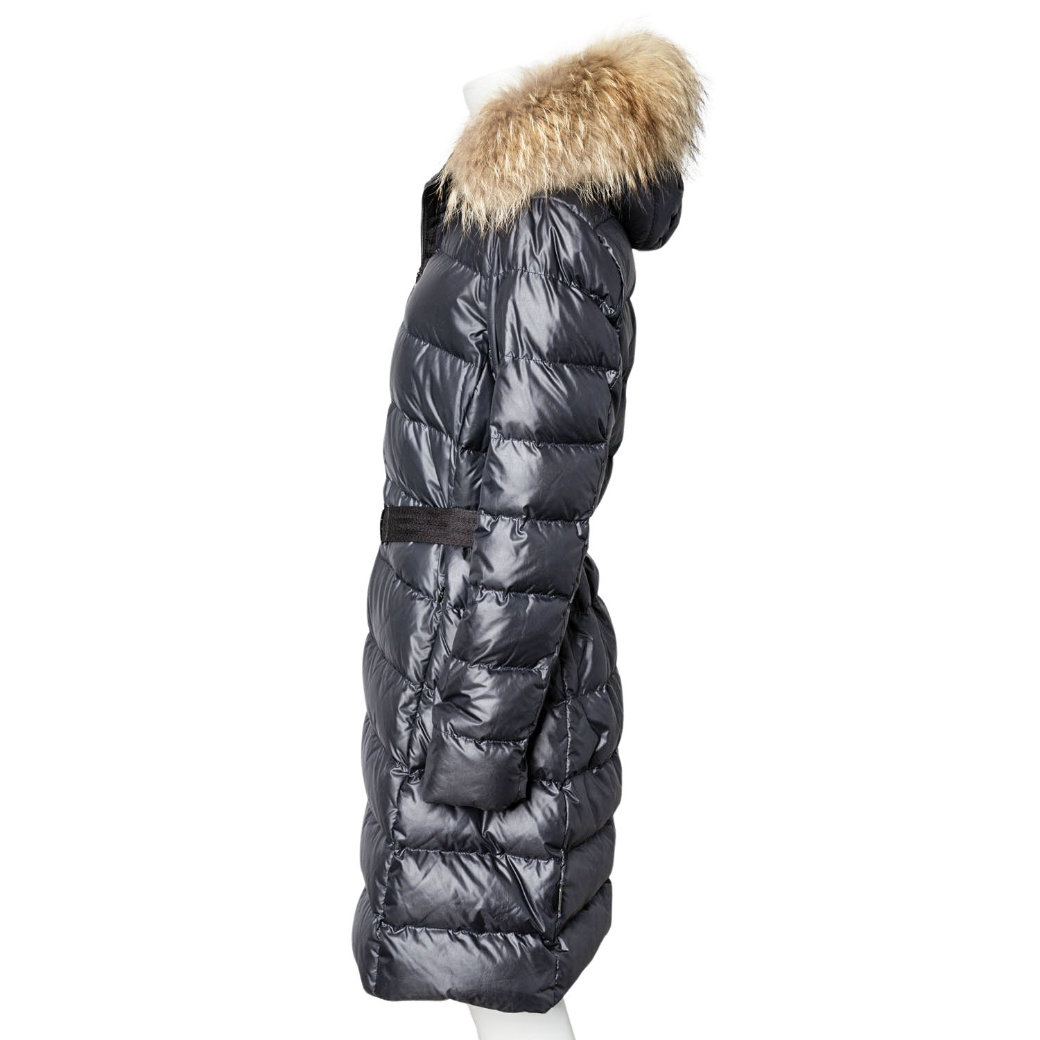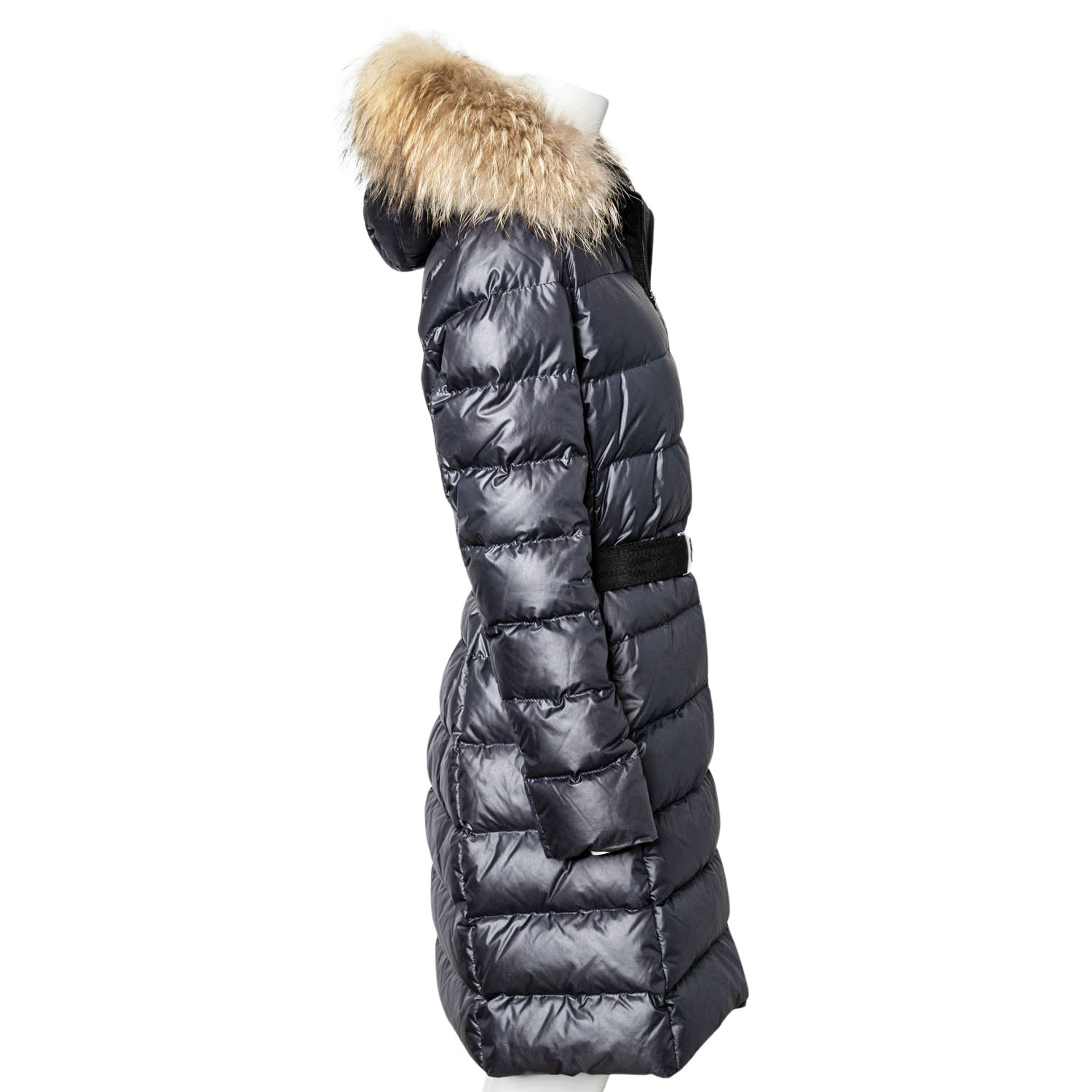 Quer gesteppter Daunenmantel in Schwarz mit Taillengürtel, Kapuze und abnehmbarem Pelzbesatz. Leichte Tragespuren vorhanden.