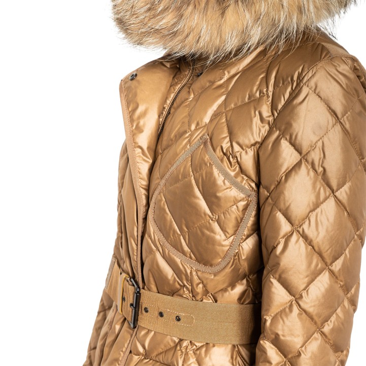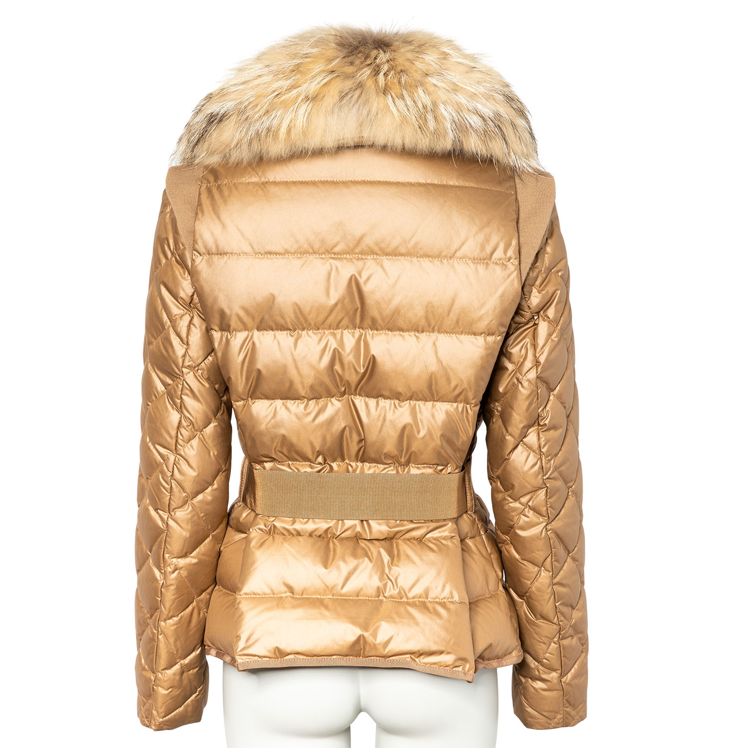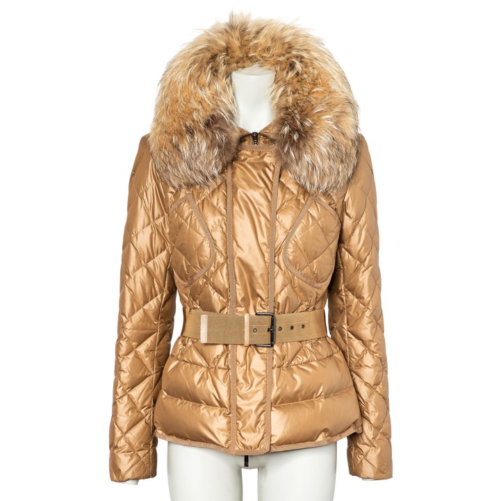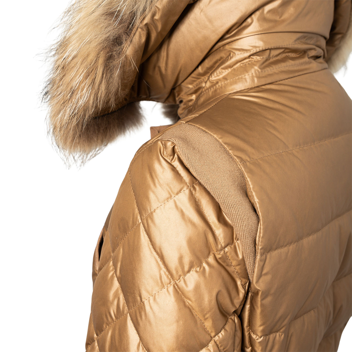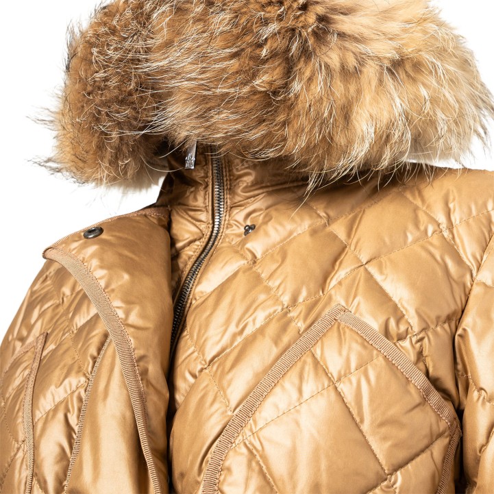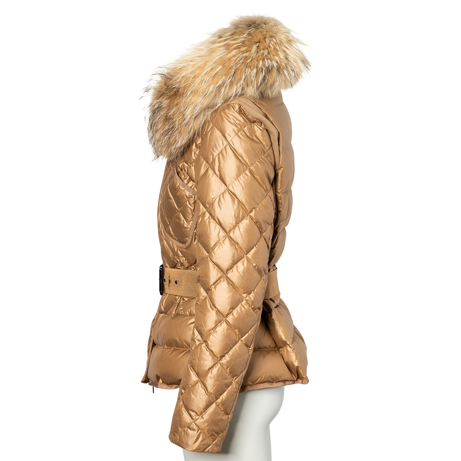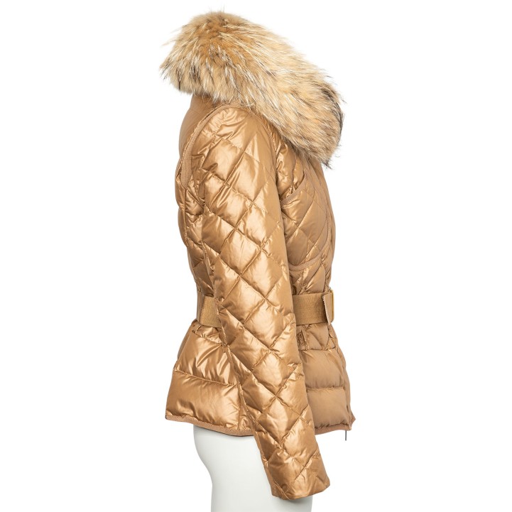 In Rauten gesteppte Daunenjacke in Bronzefarben mit Taillengürtel und dekorativem, abnehmbarem Pelzbesatz am Kragen. Guter Erhalt.
