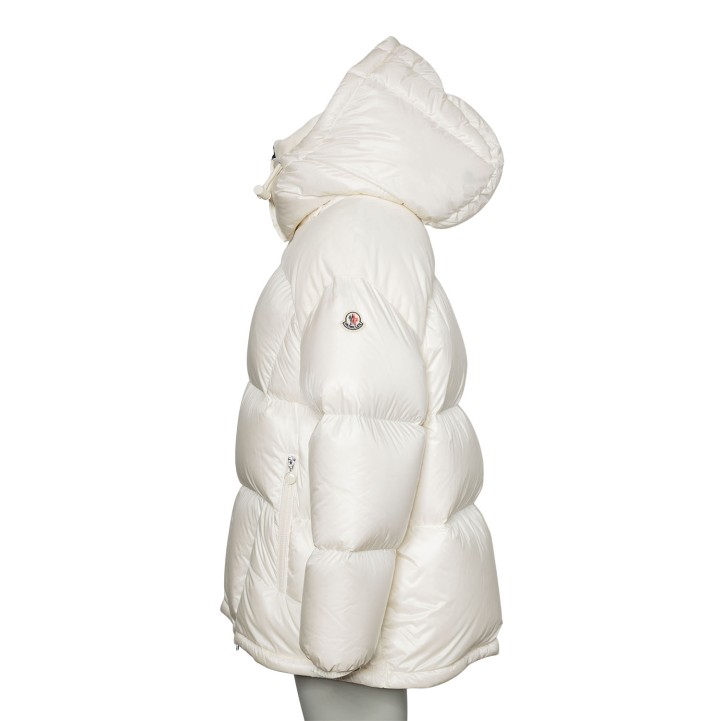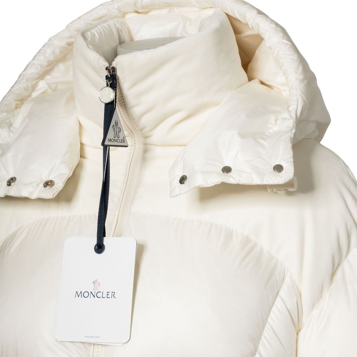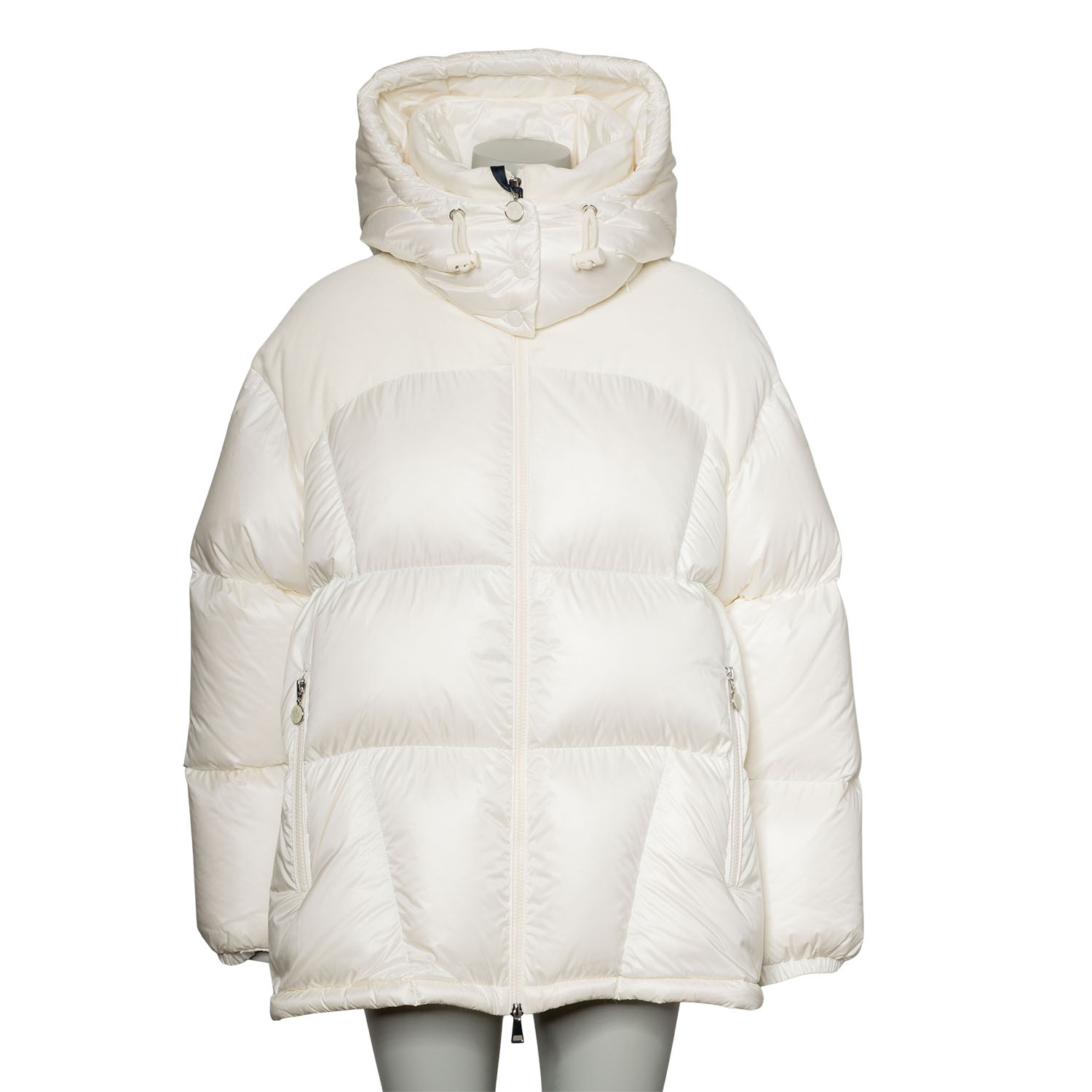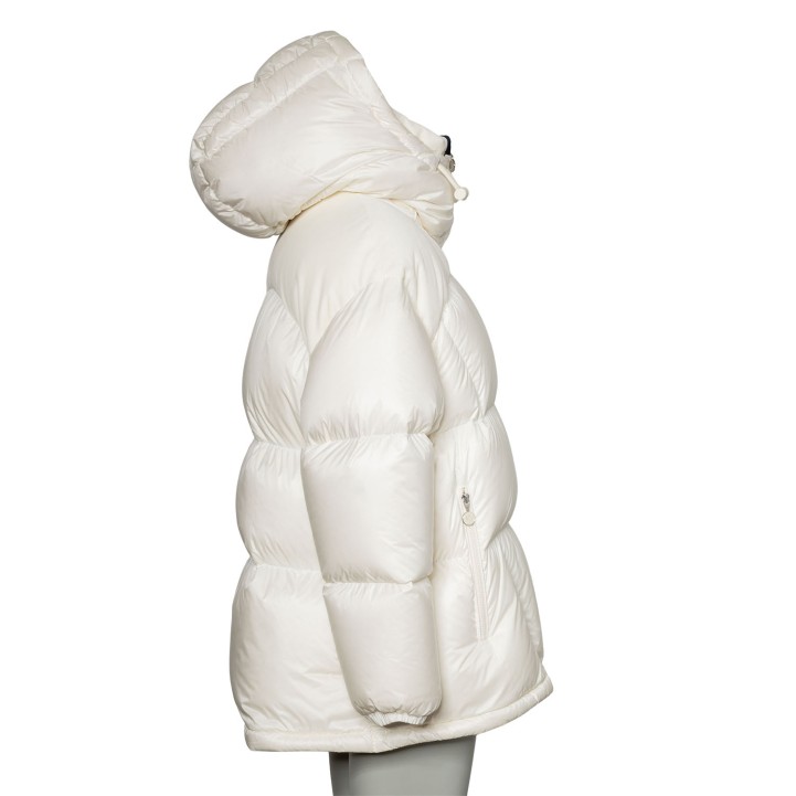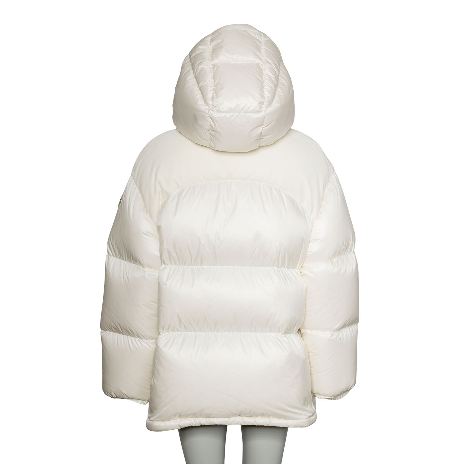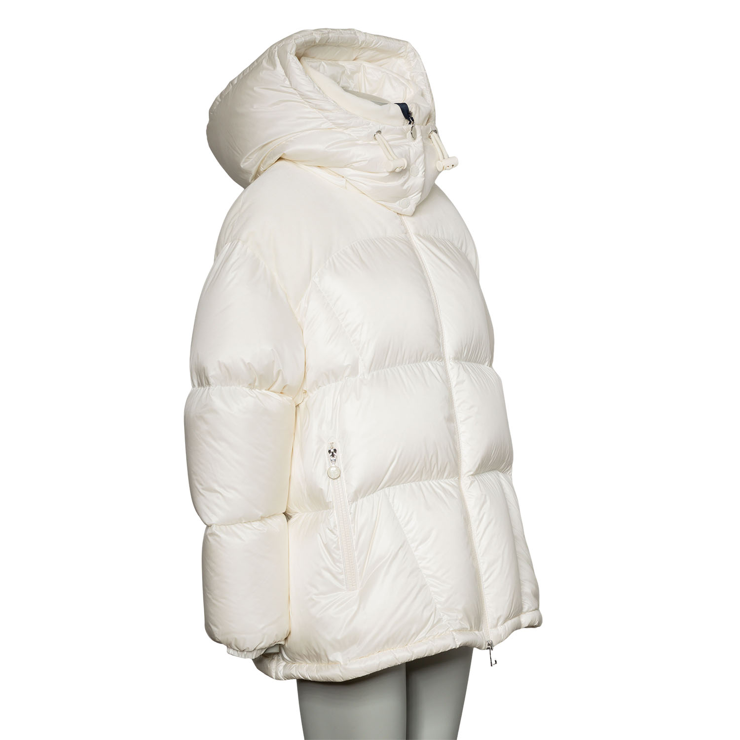 Akt. NP.: 1.490,-€. Quer gesteppte Daunenjacke in Weiß mit abnehmabrer Kapuze, einem Stehkragen und Reißverschluss. Sehr guter Erhalt.