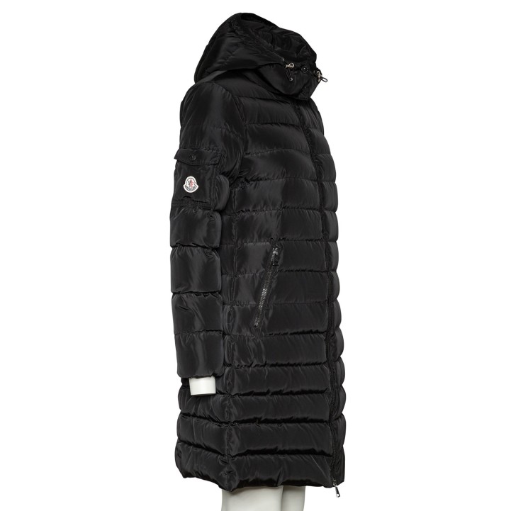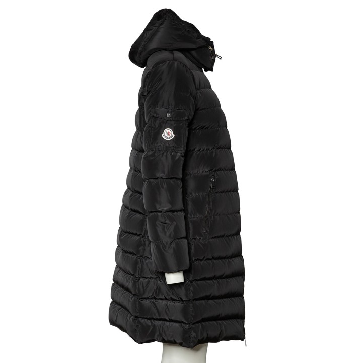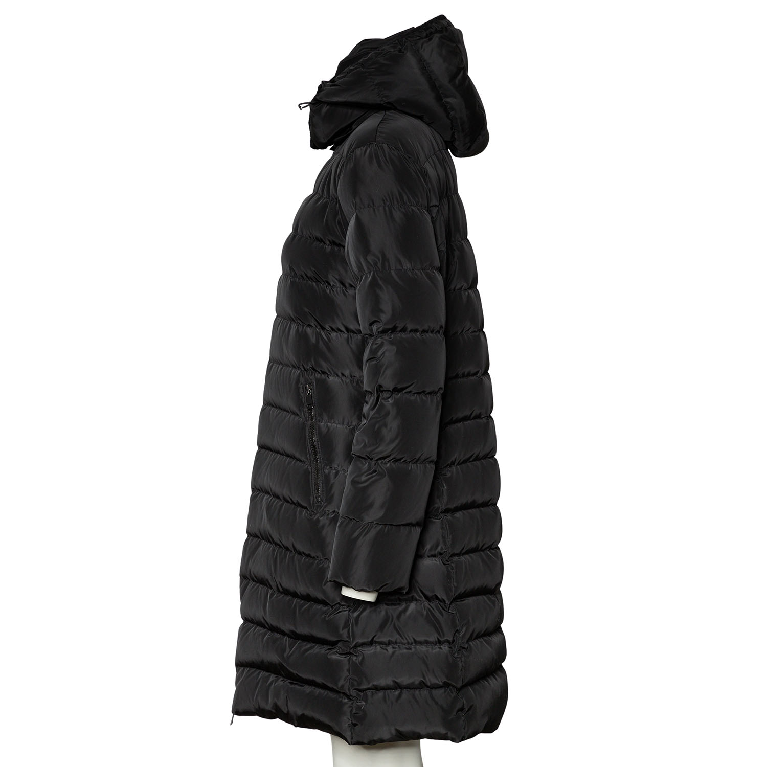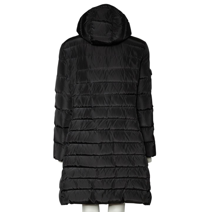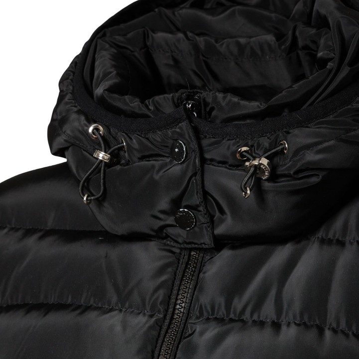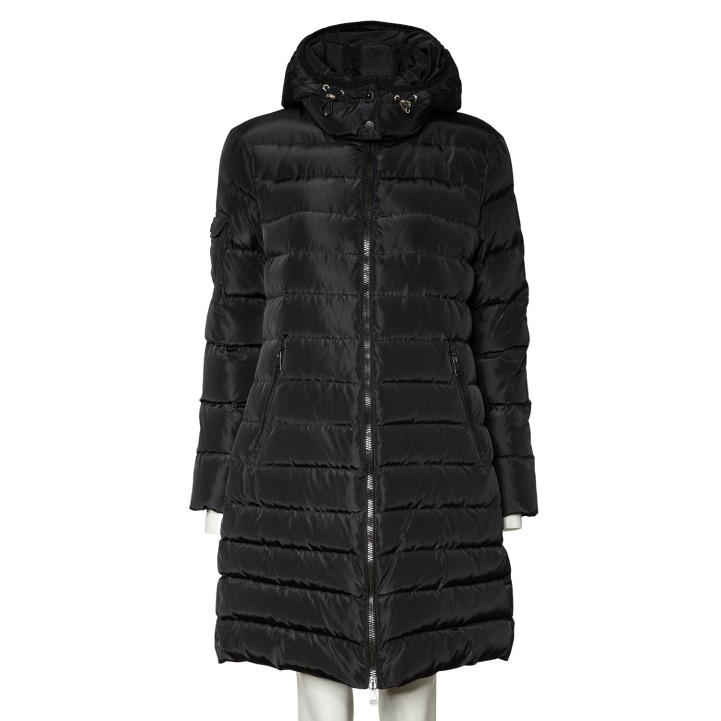Gesteppter Daunenmantel in Schwarz. Schlichtes, klassisches Design mit abnehmbarer Kapuze. Reißverschluss, Logo Emblem auf der Seite. Gereinigt, guter Erhalt. Leichte Altersspuren.