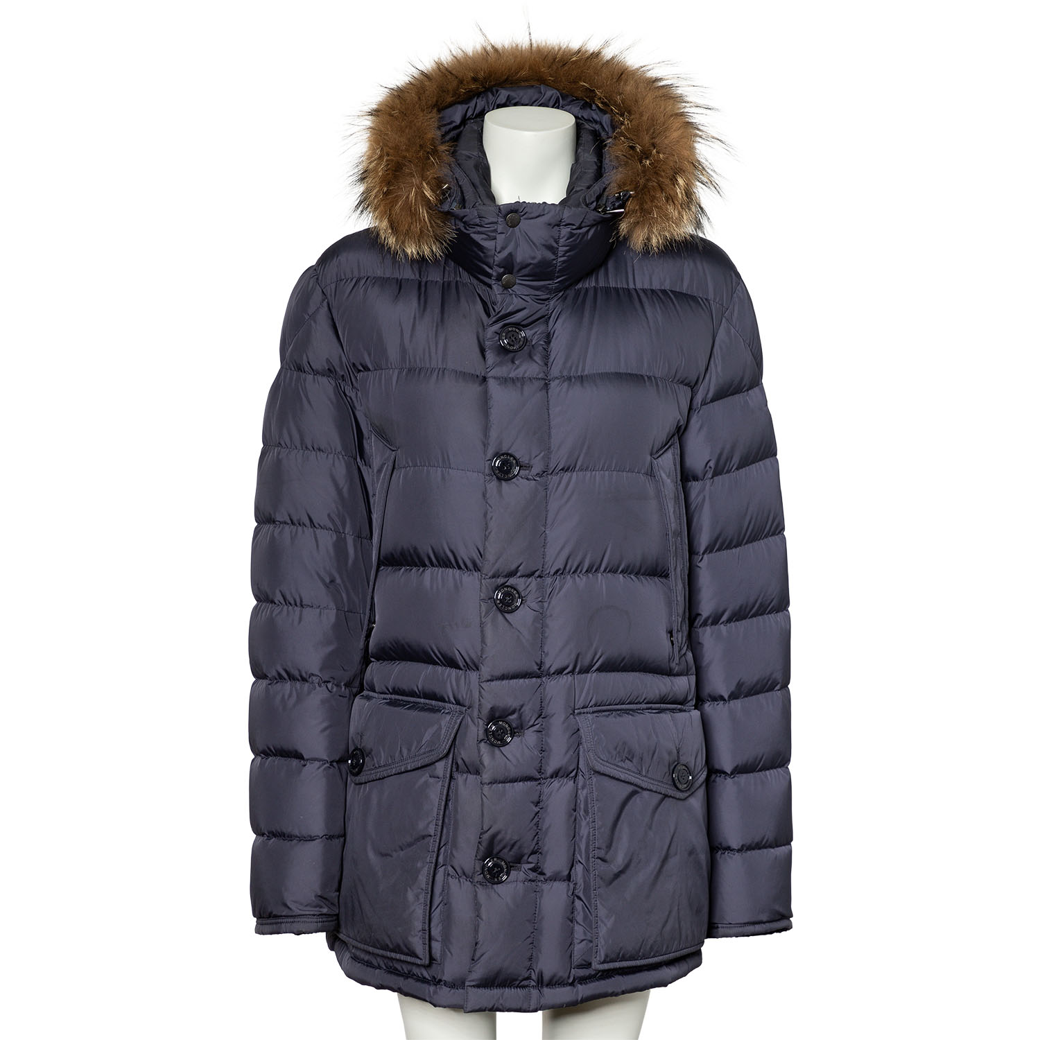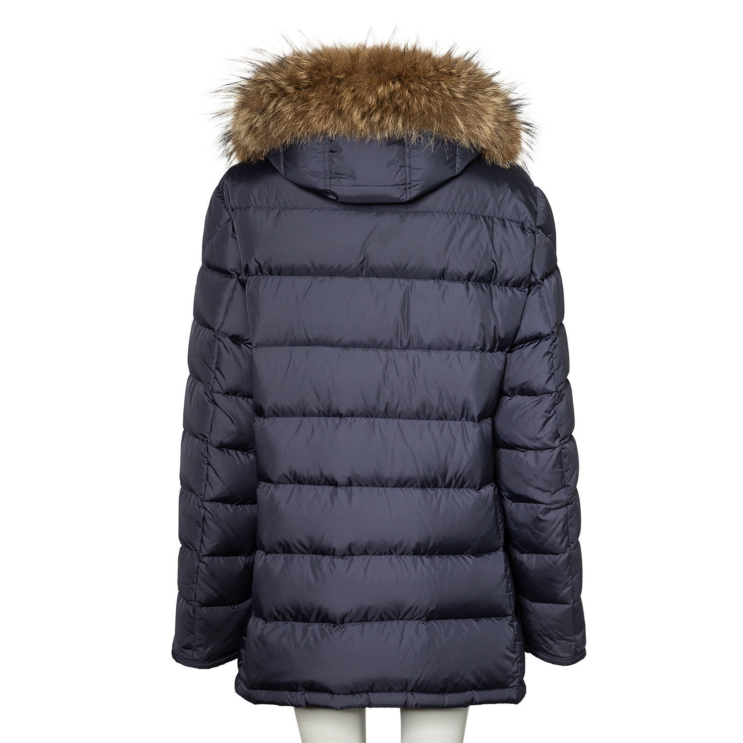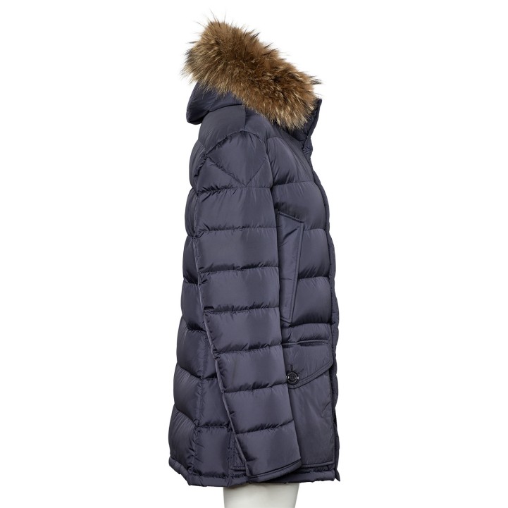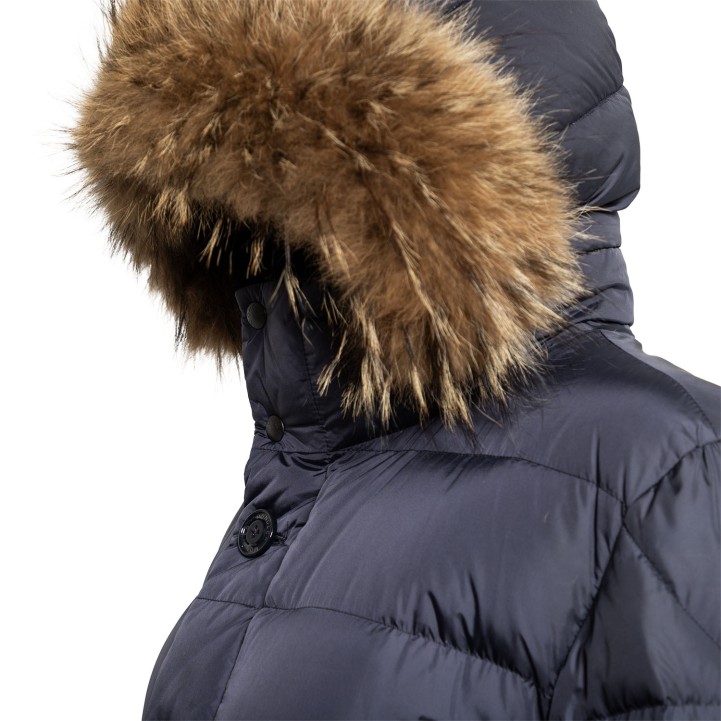 Daunensteppmantel in Dunkelblau. Kapuze mit Pelzbesatz. Reißverschluss und Knopfleiste. Vier Außentaschen. Guter Erhalt.