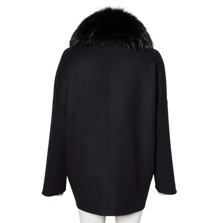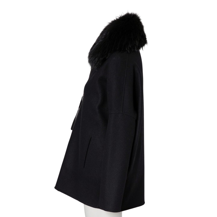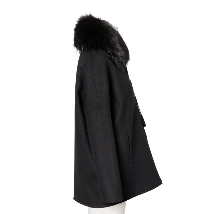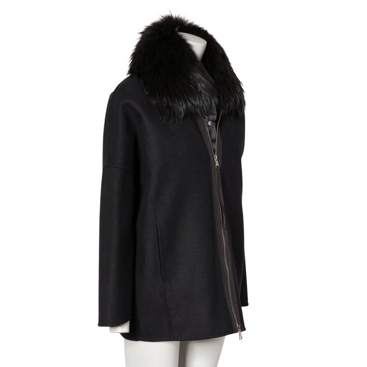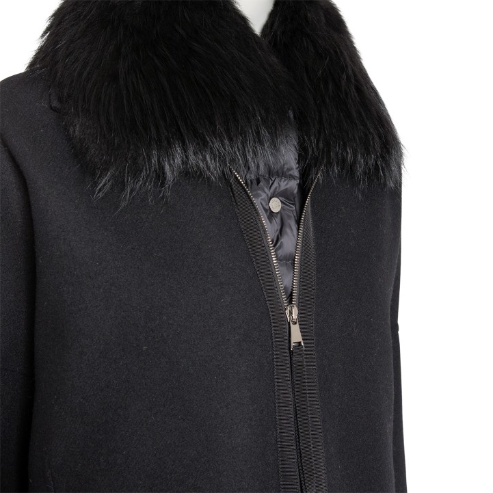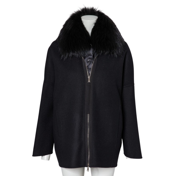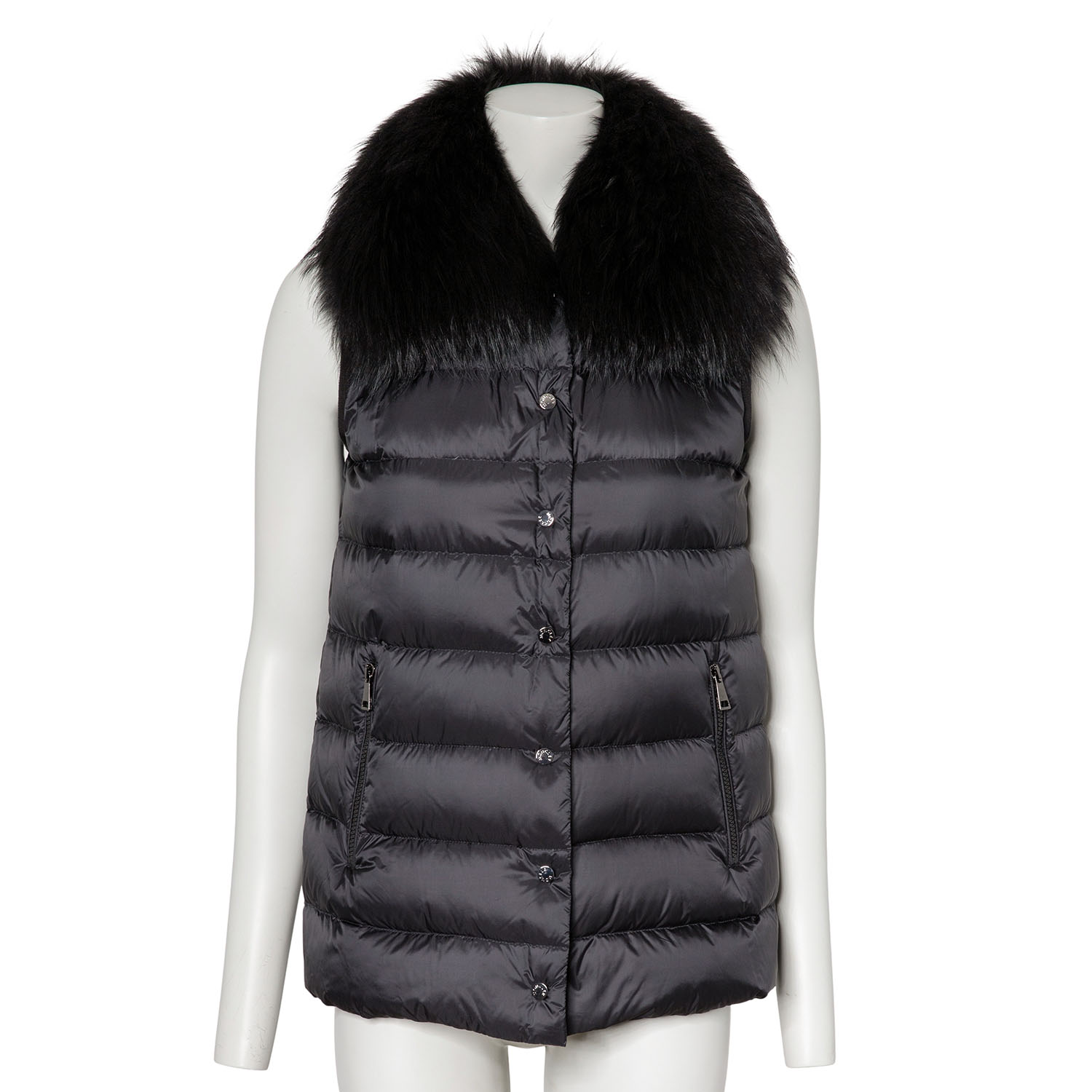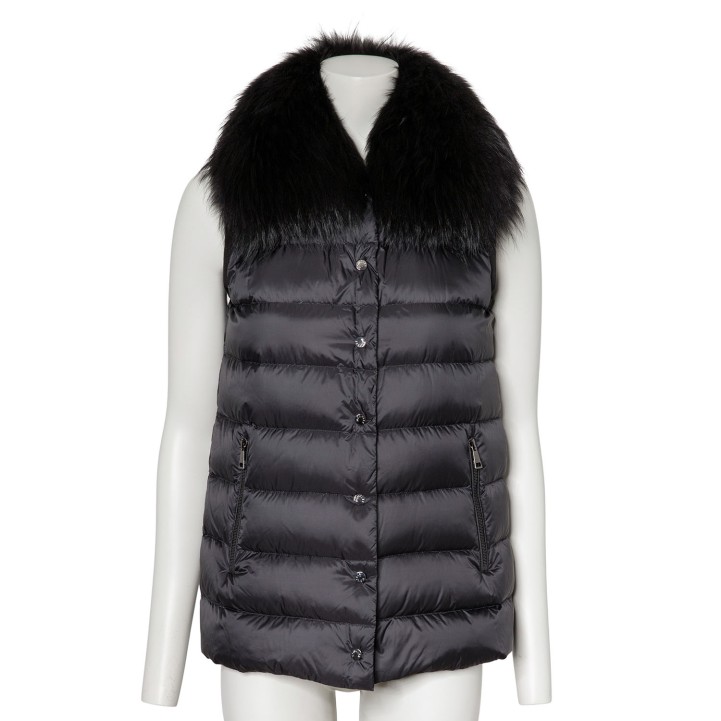 Schwarzes Doubleface-Modell mit Daunenweste und Fellbesatz am Kragen. Ausgestattet mit Reißverschluss, Druckknopfverschluss und Eingrifftaschen. Gebraucht, dezente Tragespuren vorhanden.