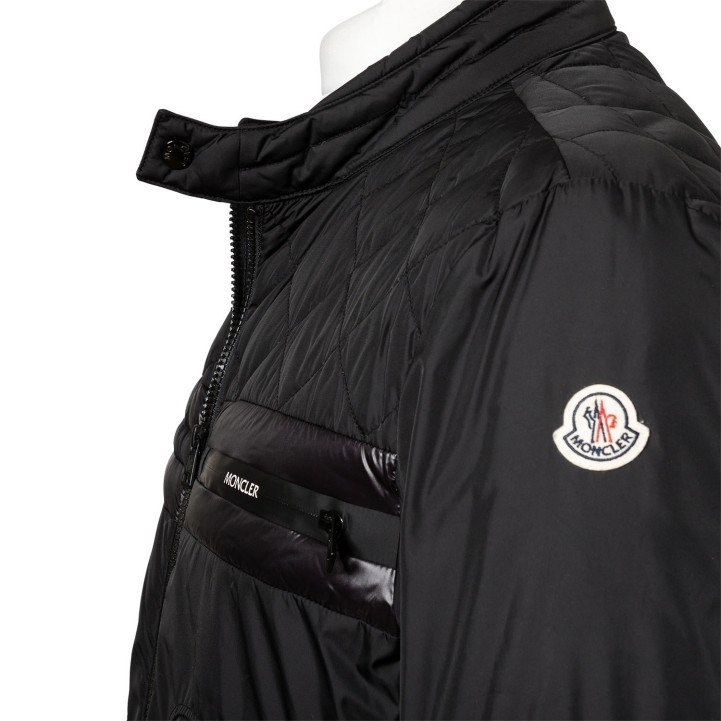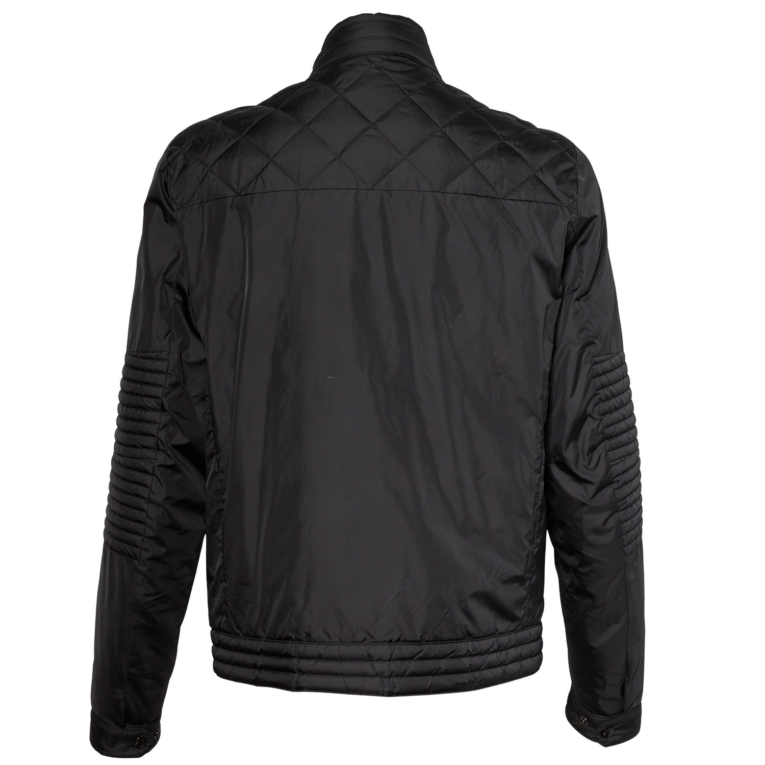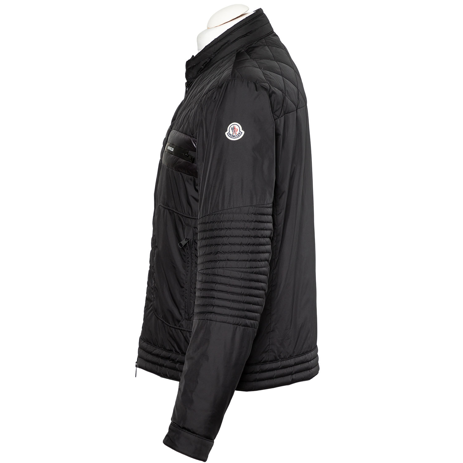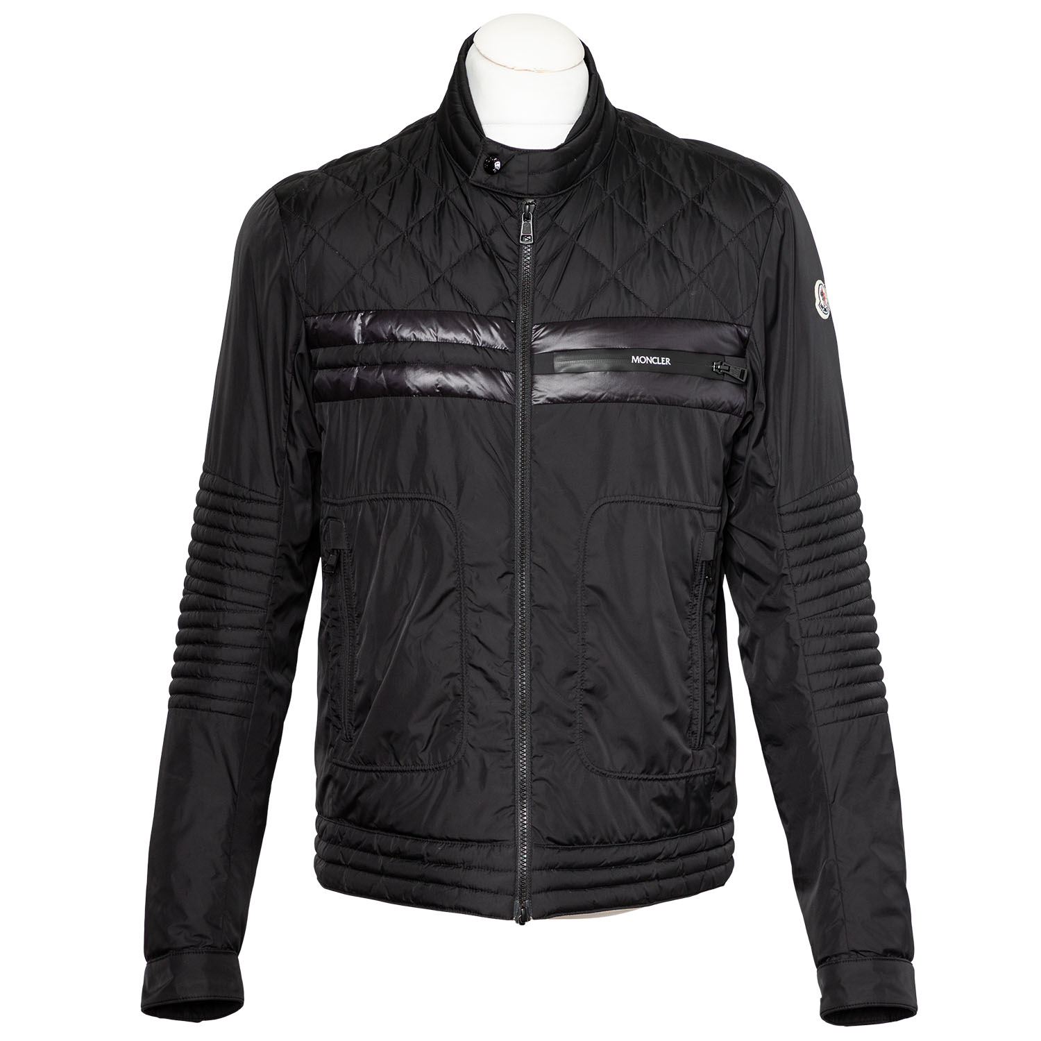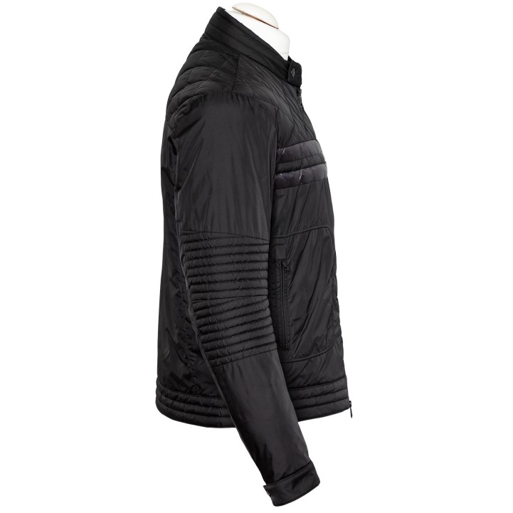 Schwarzes Modell im Bikerstil mit Reißverschluss, Taschen und Stehkragen. Mit Daunen gefüttert. Tragespuren vorhanden.